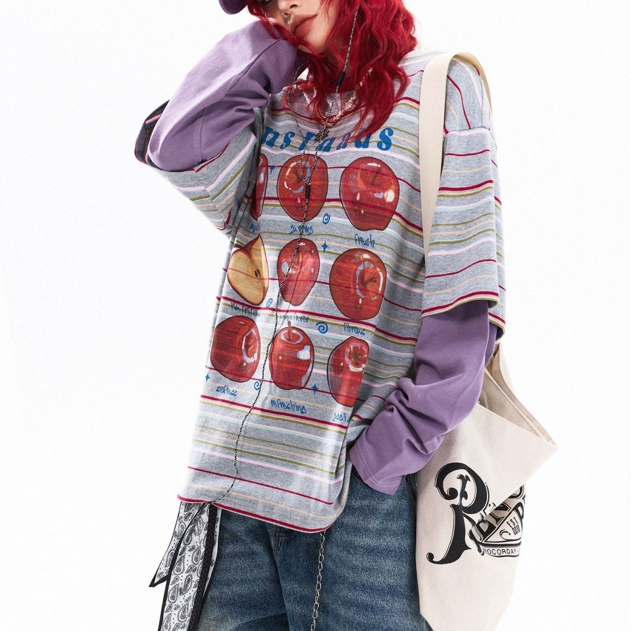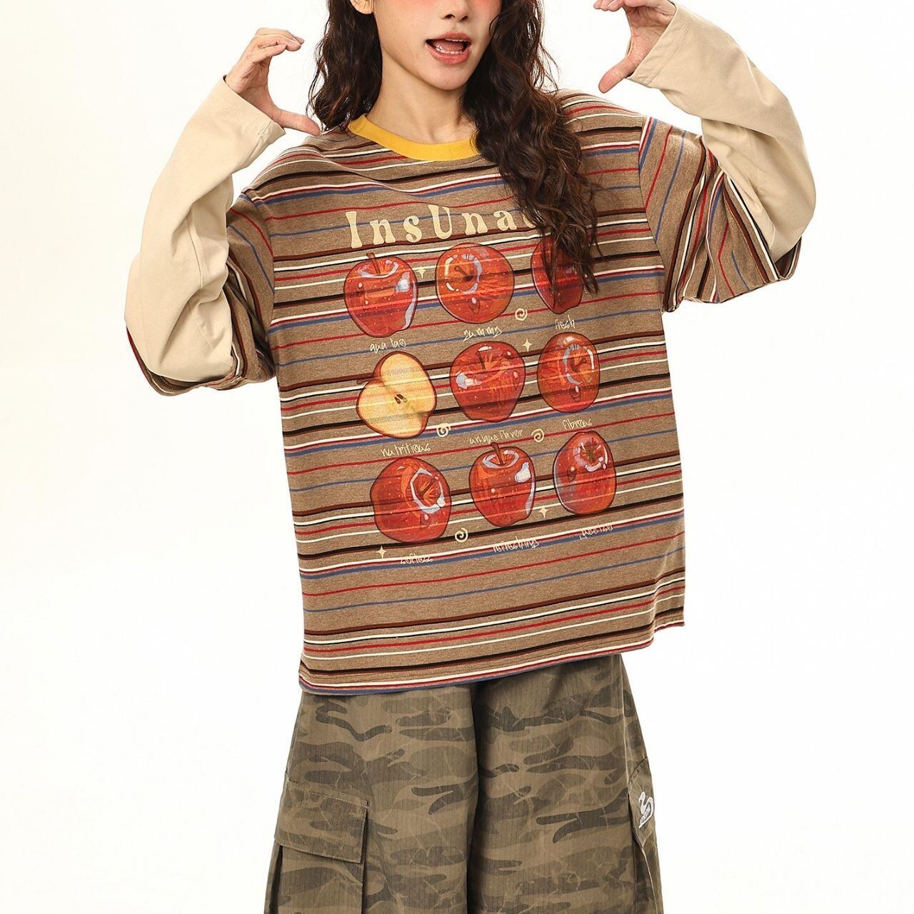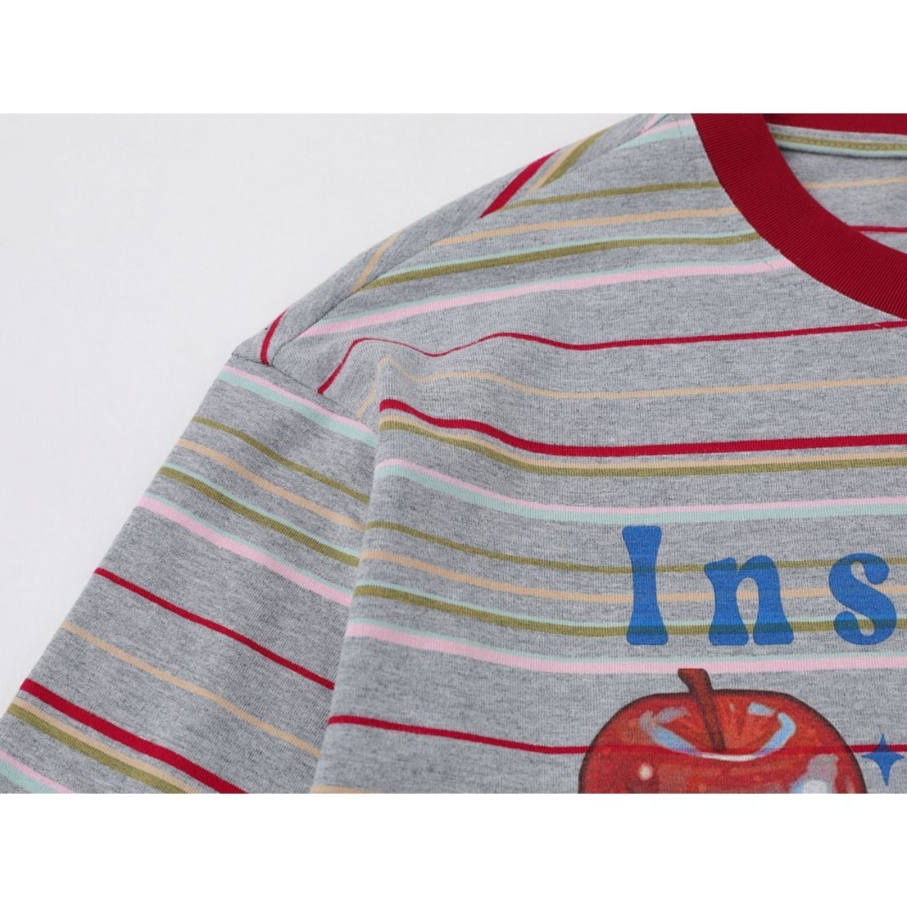 ボーダーベースに大胆なアップルモチーフを重ねた、遊び心あふれるポップデザイン。