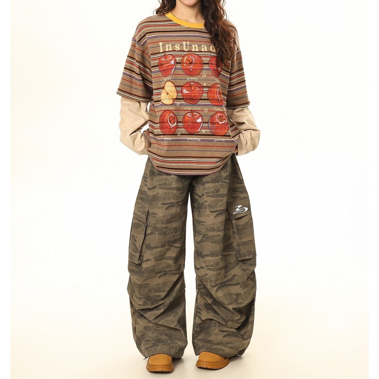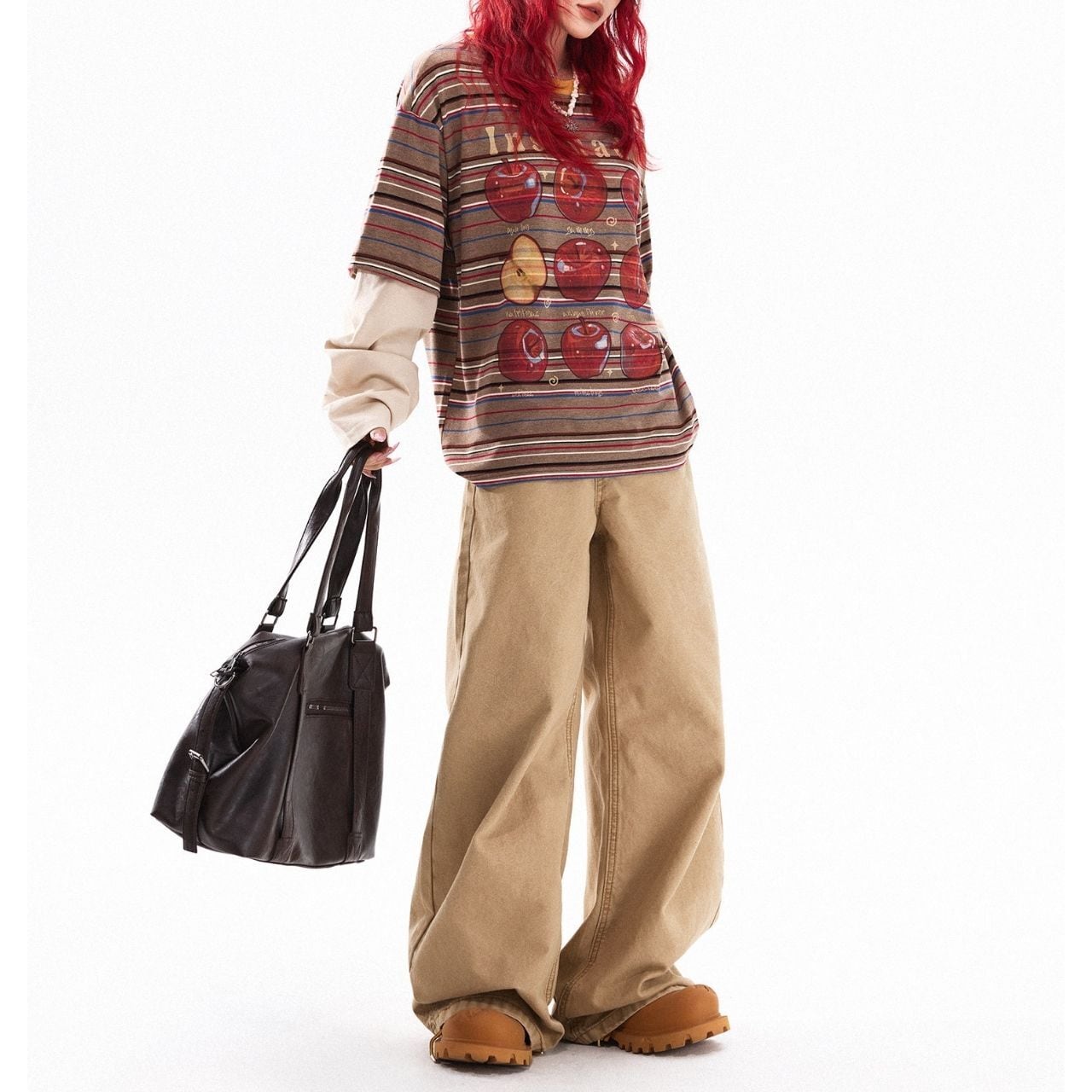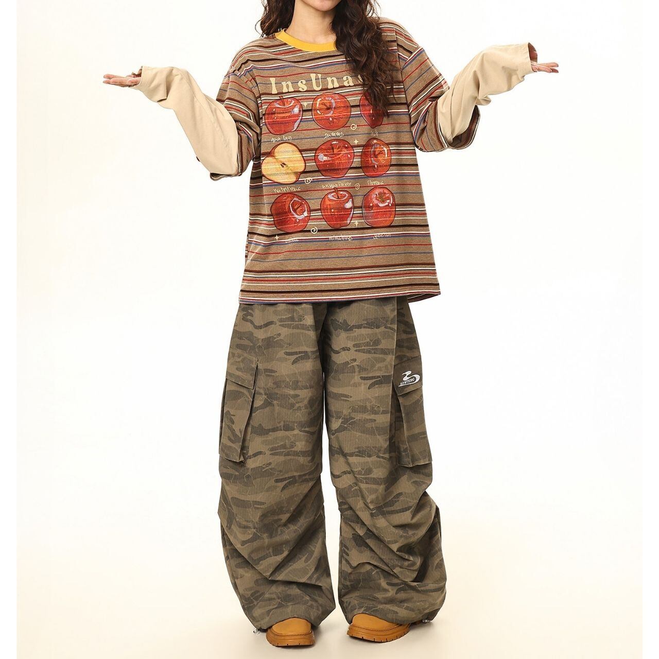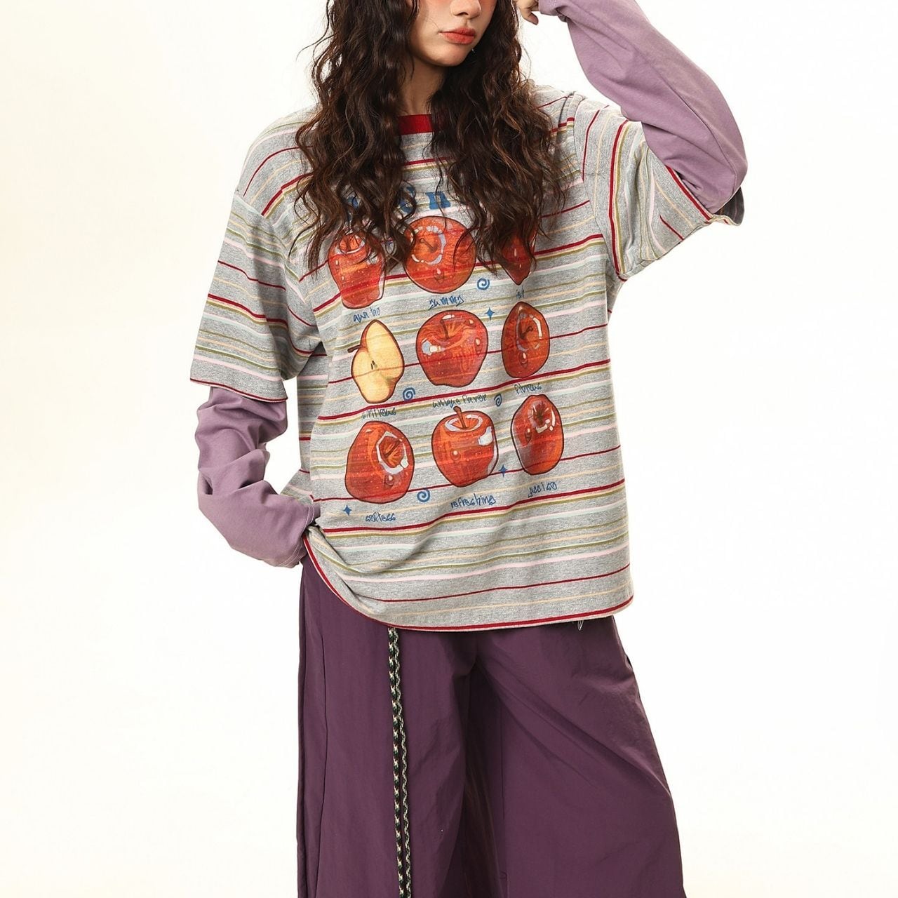 ボーダーベースに大胆なアップルモチーフを重ねた、遊び心あふれるポップデザイン。