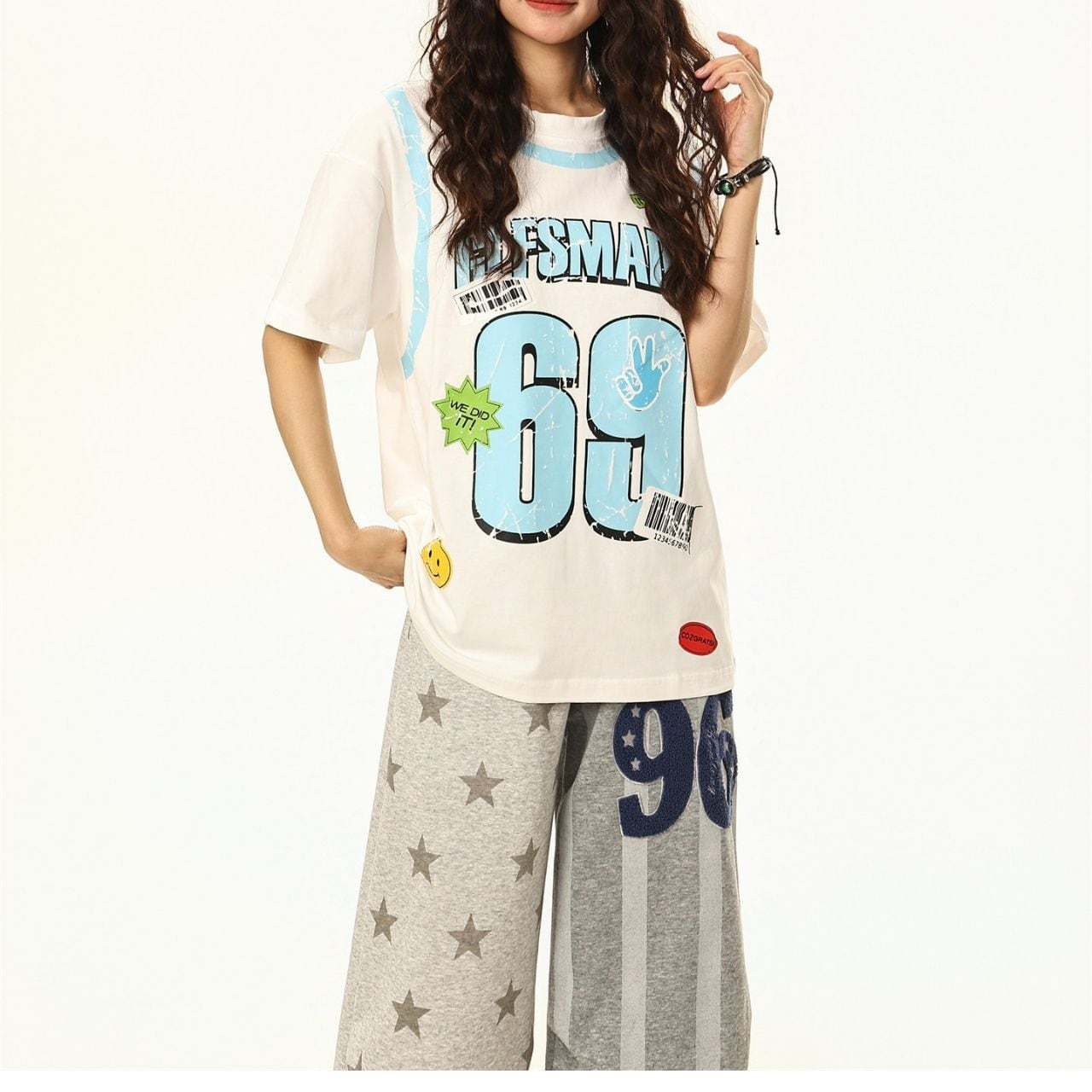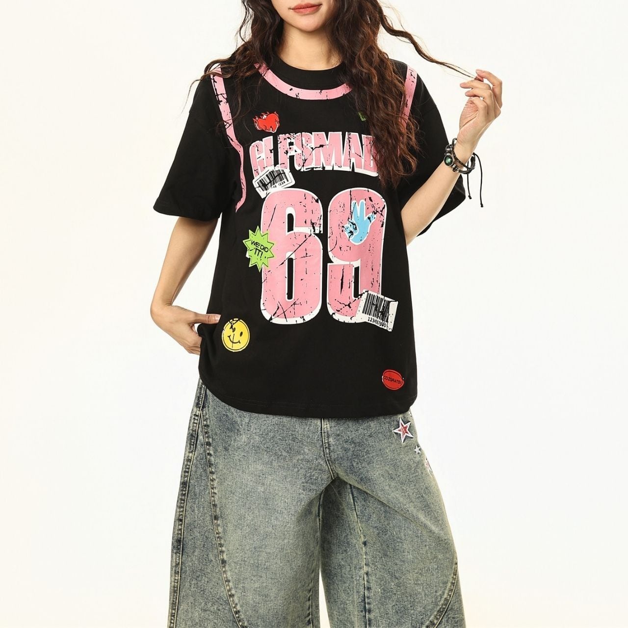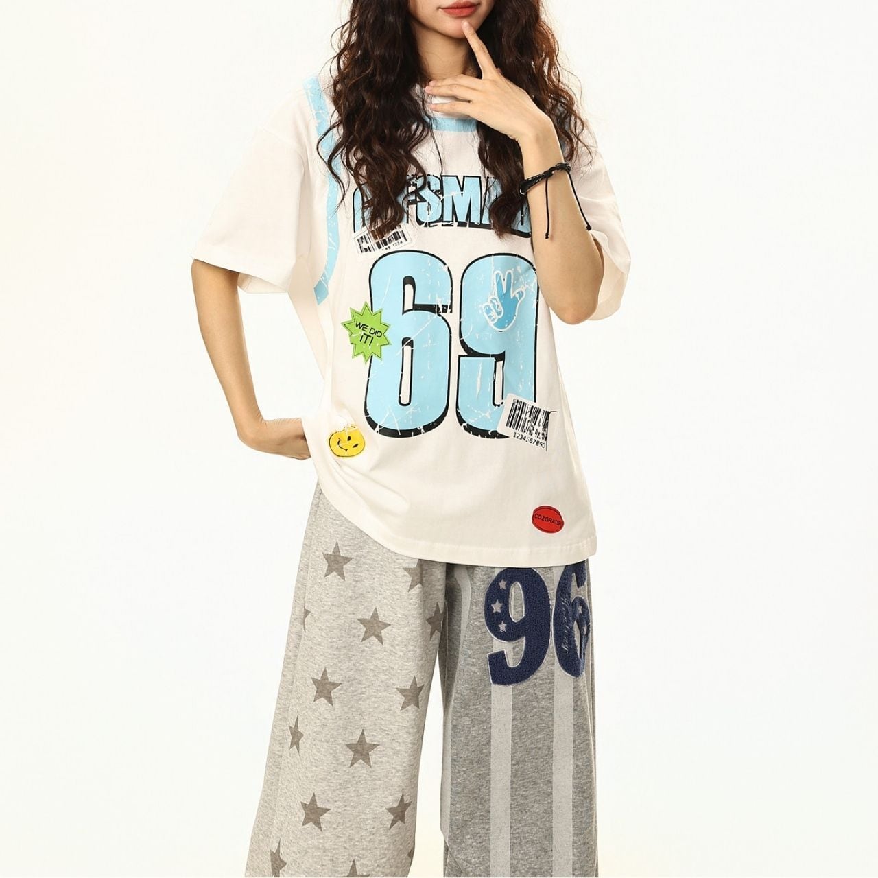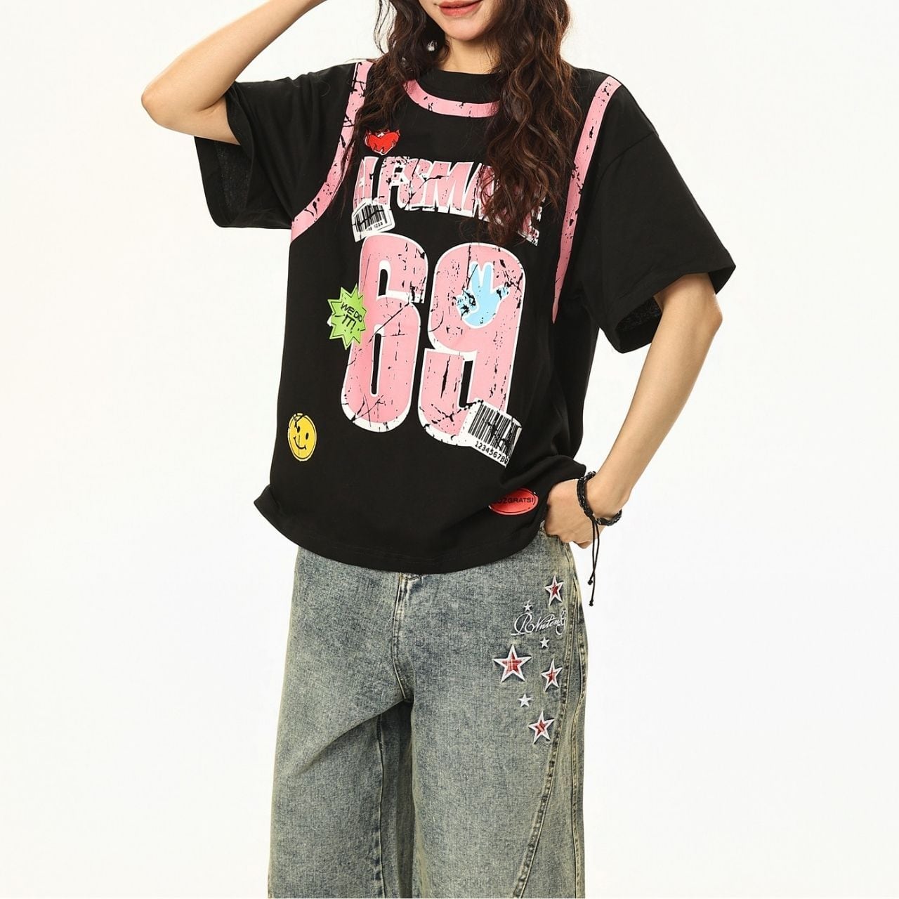 大胆なナンバーモチーフとポップなアクセントを散りばめた、ストリート感あふれるデザインTシャツ。