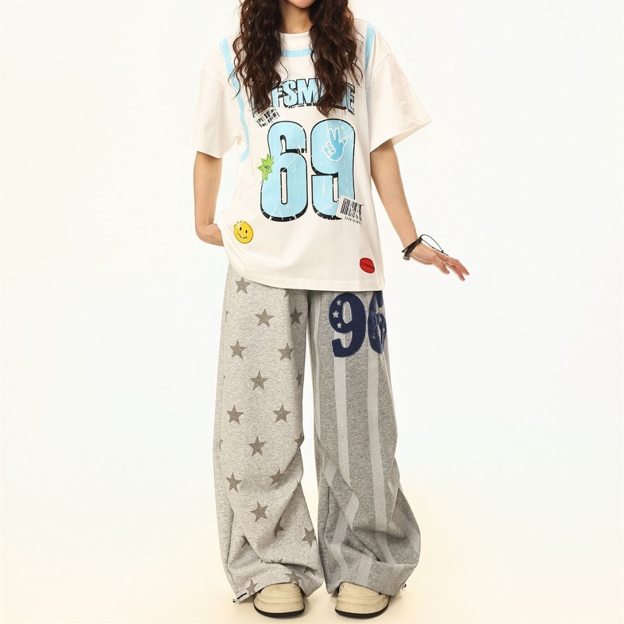 ロゴやアイコンの組み合わせがコーデに遊び心を加え、1枚で存在感を放つ仕上がり。