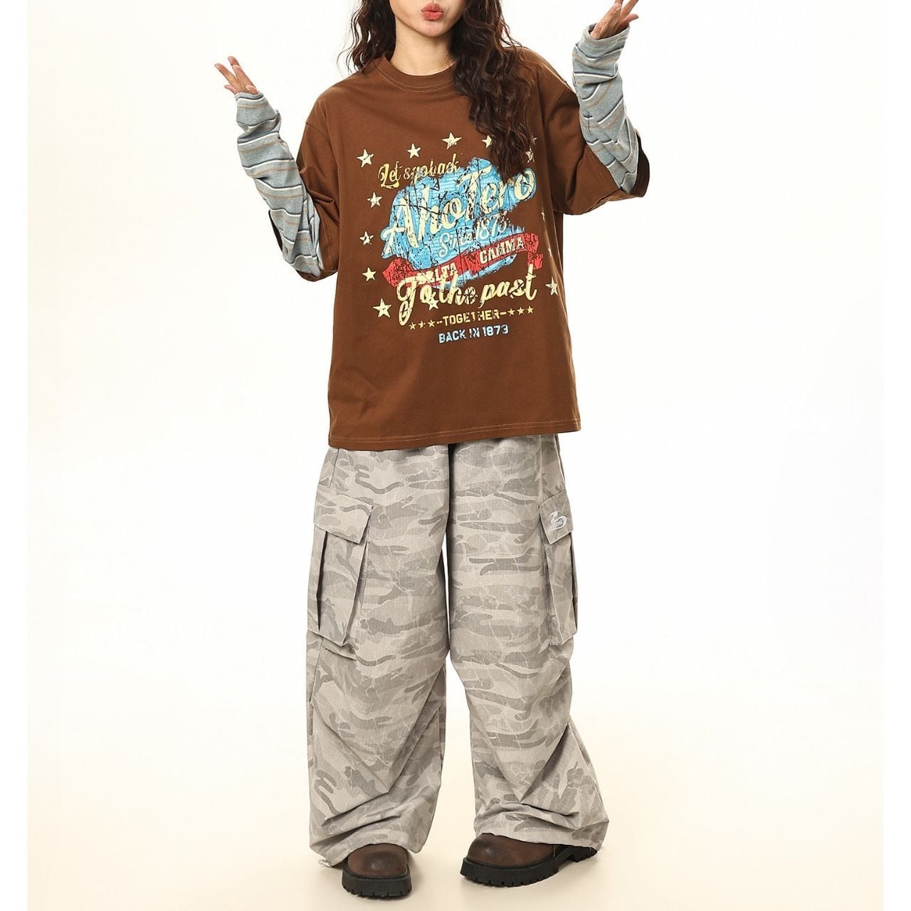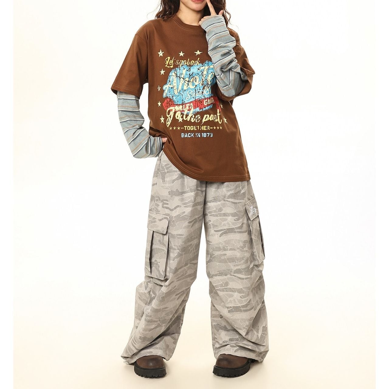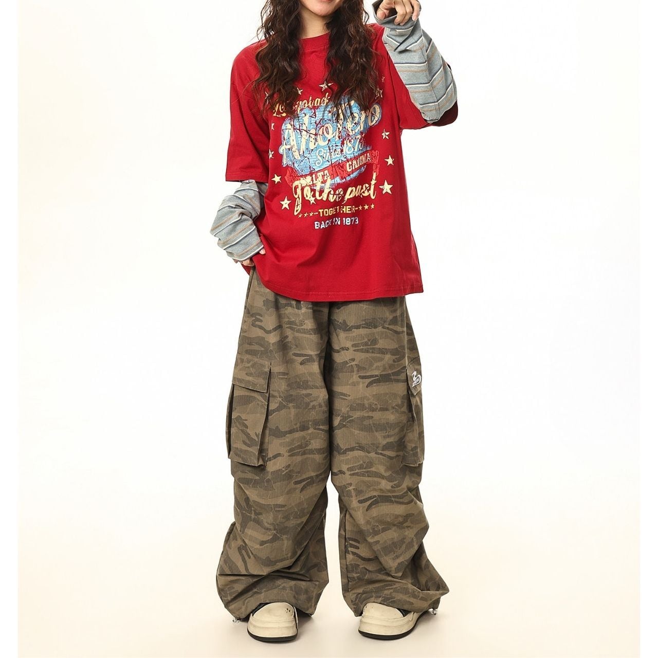 ワイドボトムやレイヤードでラフにまとめ、抜け感のあるストリートスタイルに。