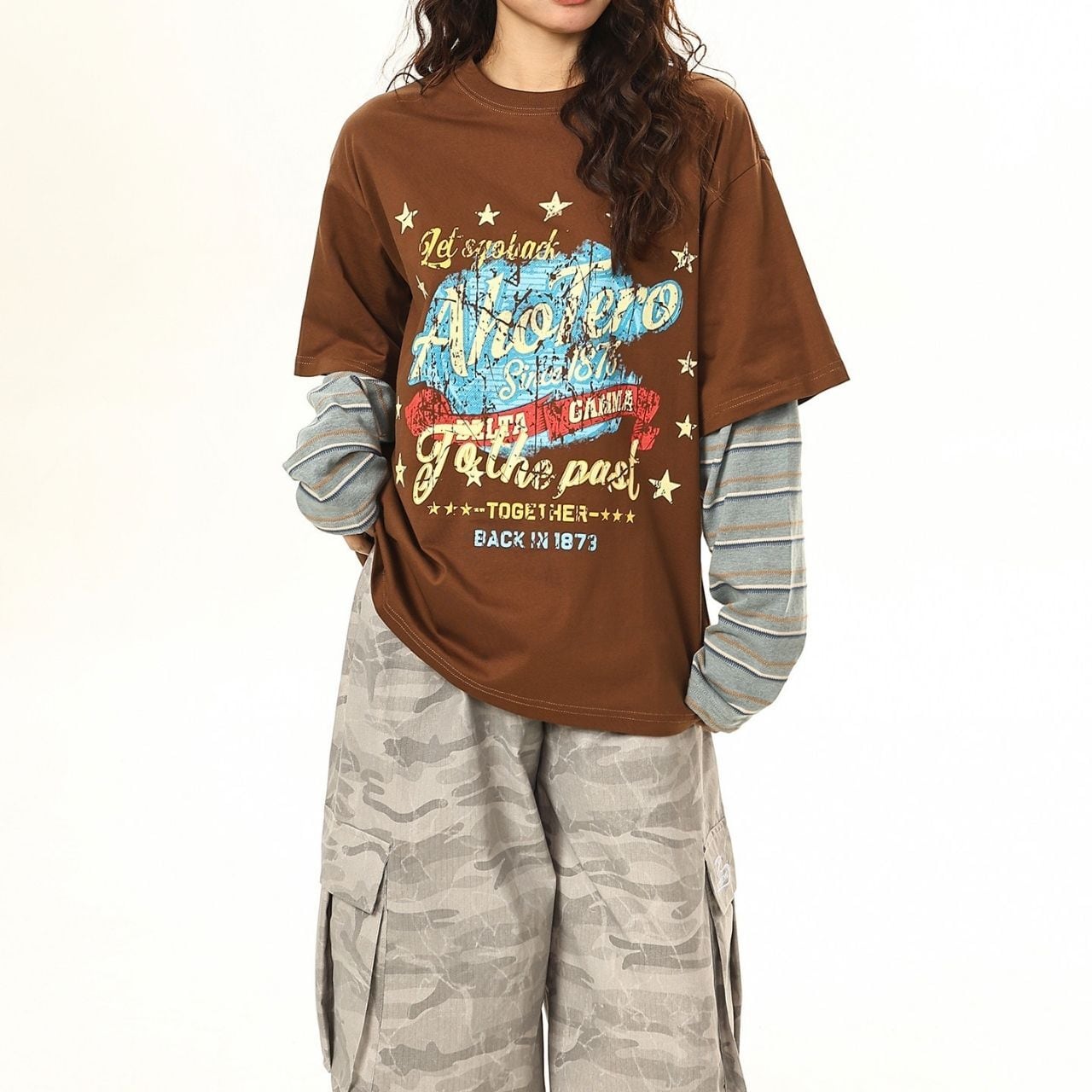 ヴィンテージライクレタリングレイヤードTシャツ 2col R01767