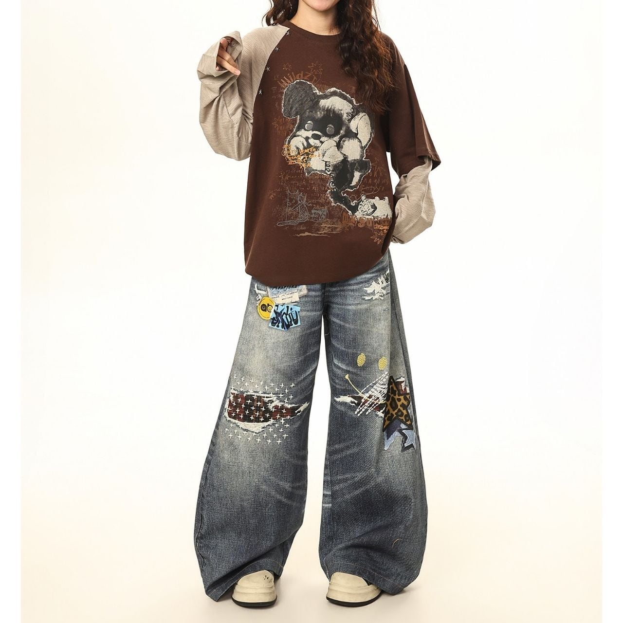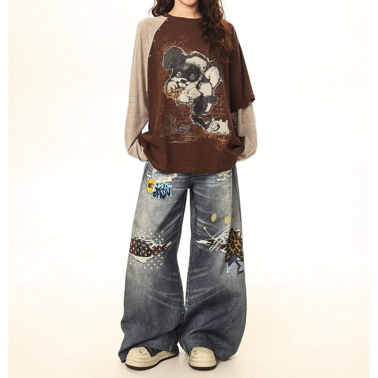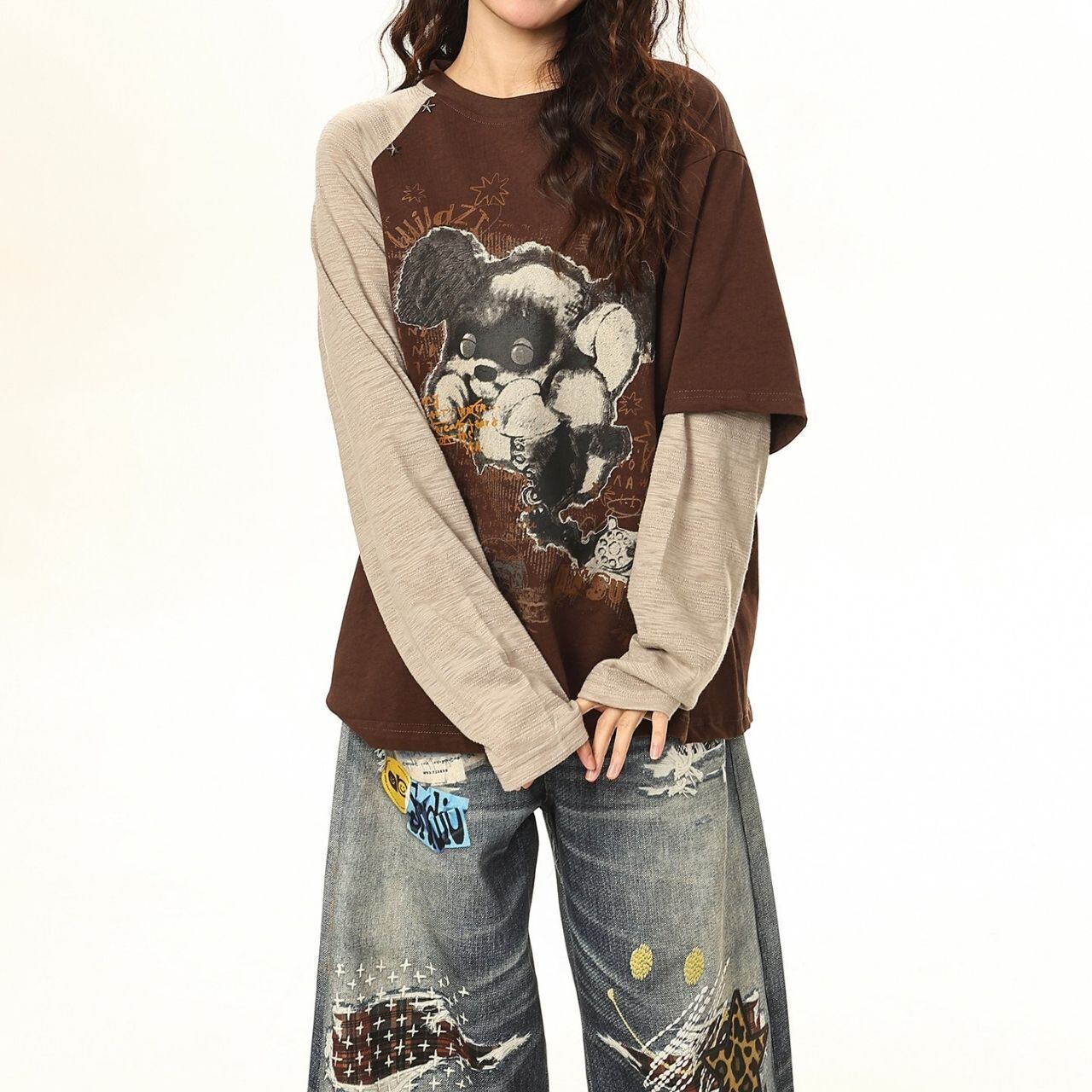 手描き風のグラフィックやレタリングが重なり、コーデに奥行きと遊び心をプラスします。