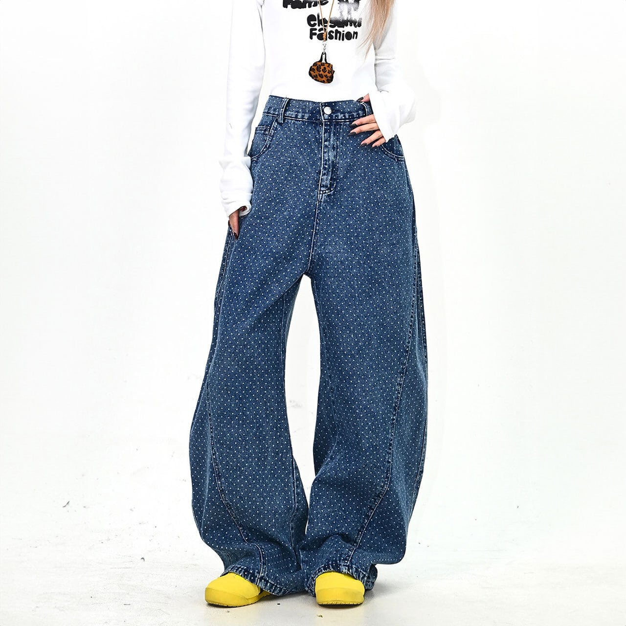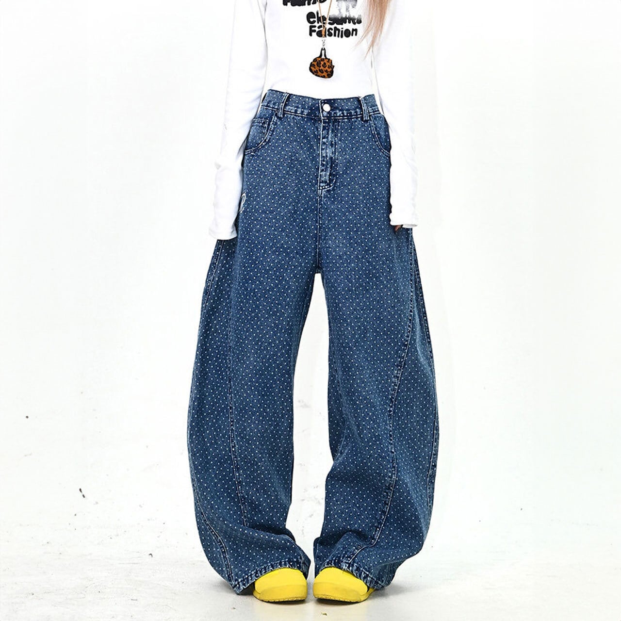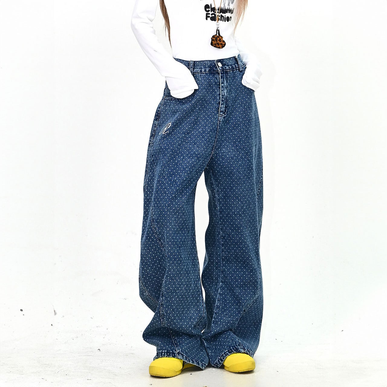 全体に散りばめられた細かなモチーフと、バックの大胆なアクセントが視線を集めるデザインデニム。