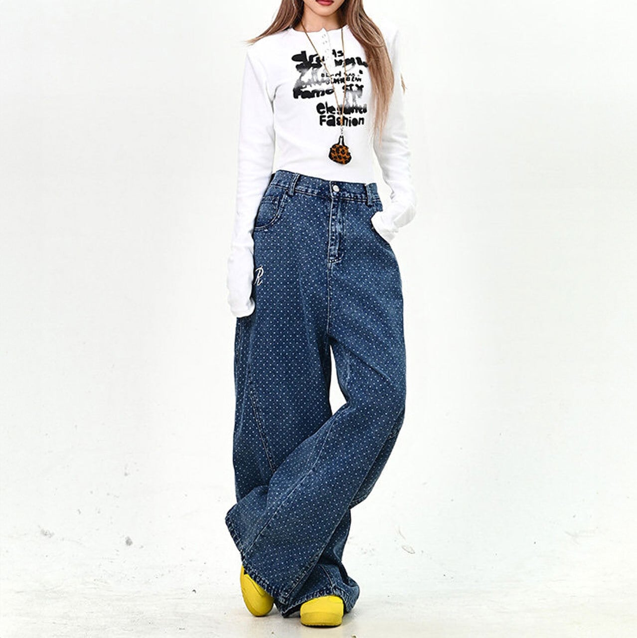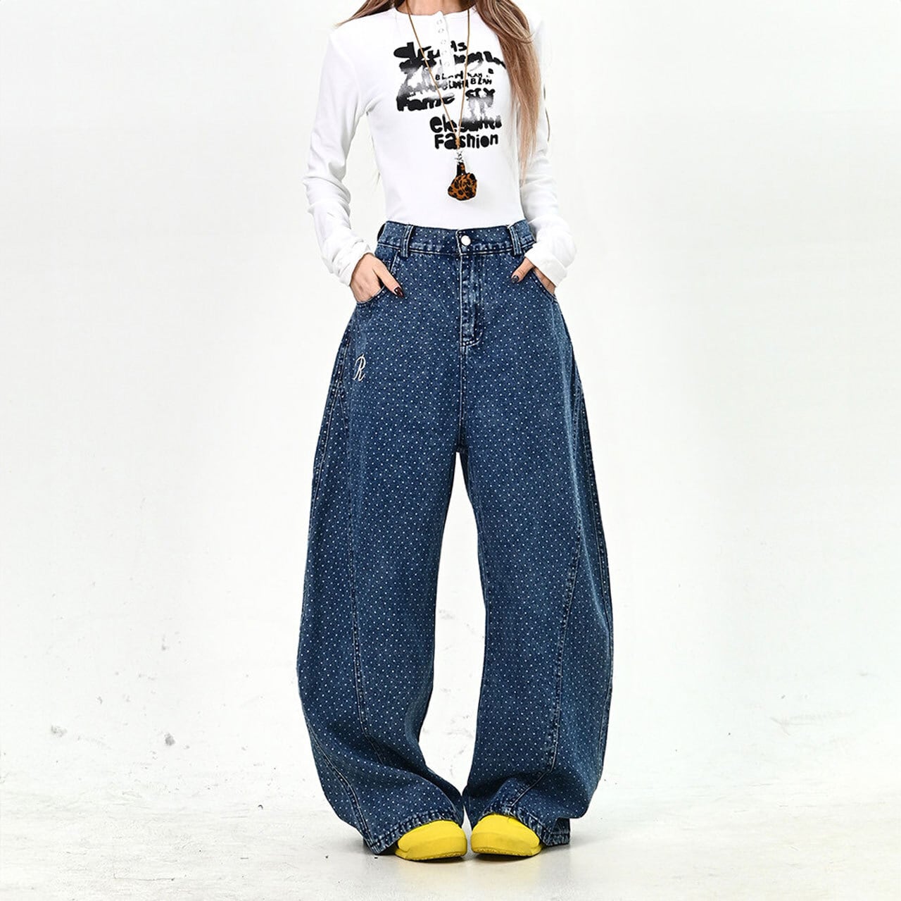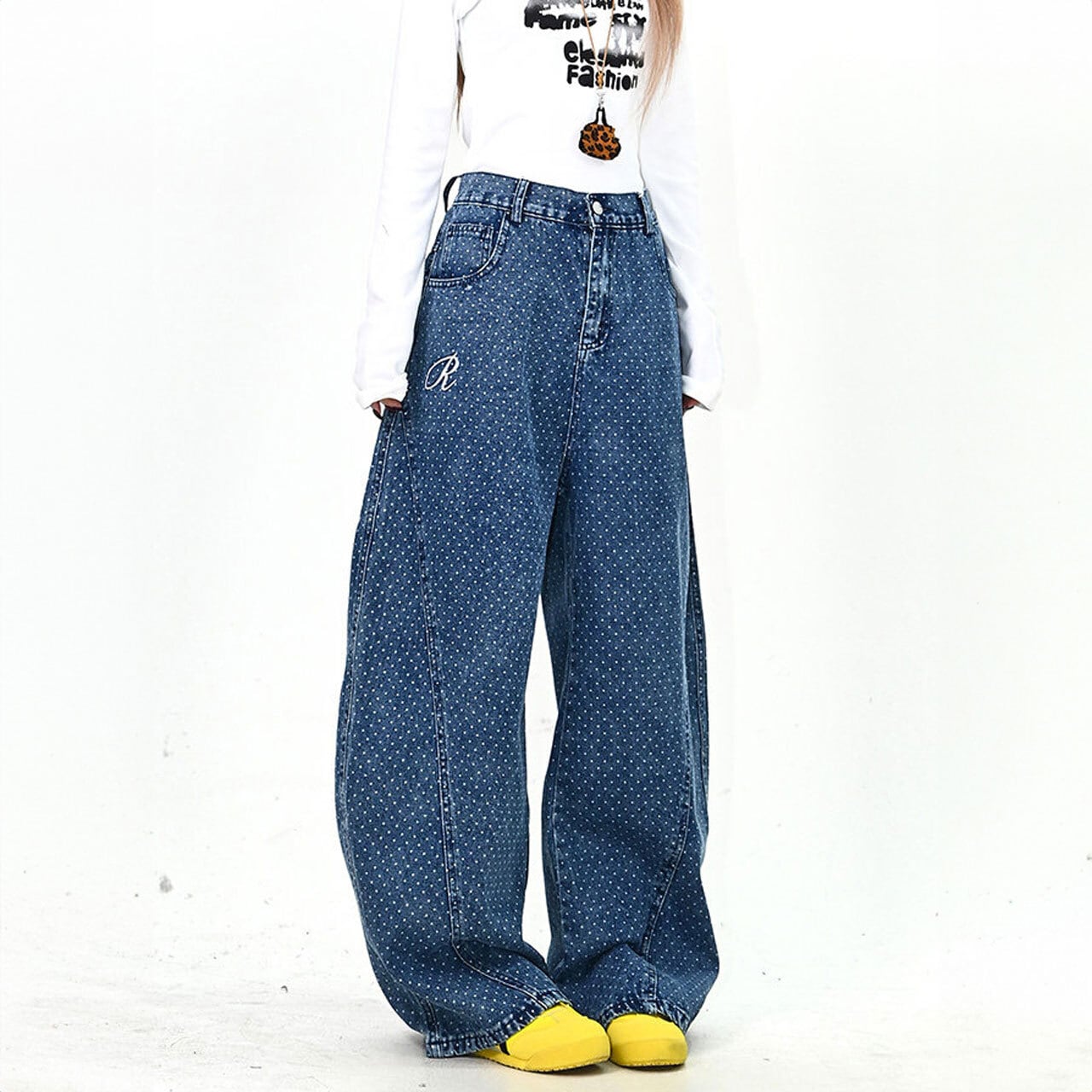 全体に散りばめられた細かなモチーフと、バックの大胆なアクセントが視線を集めるデザインデニム。