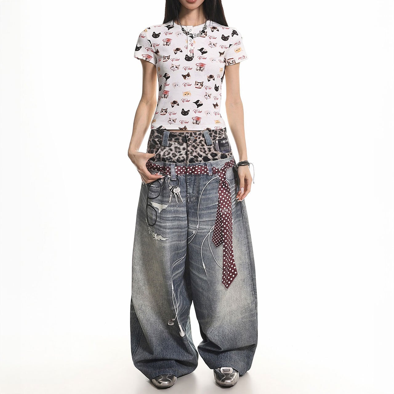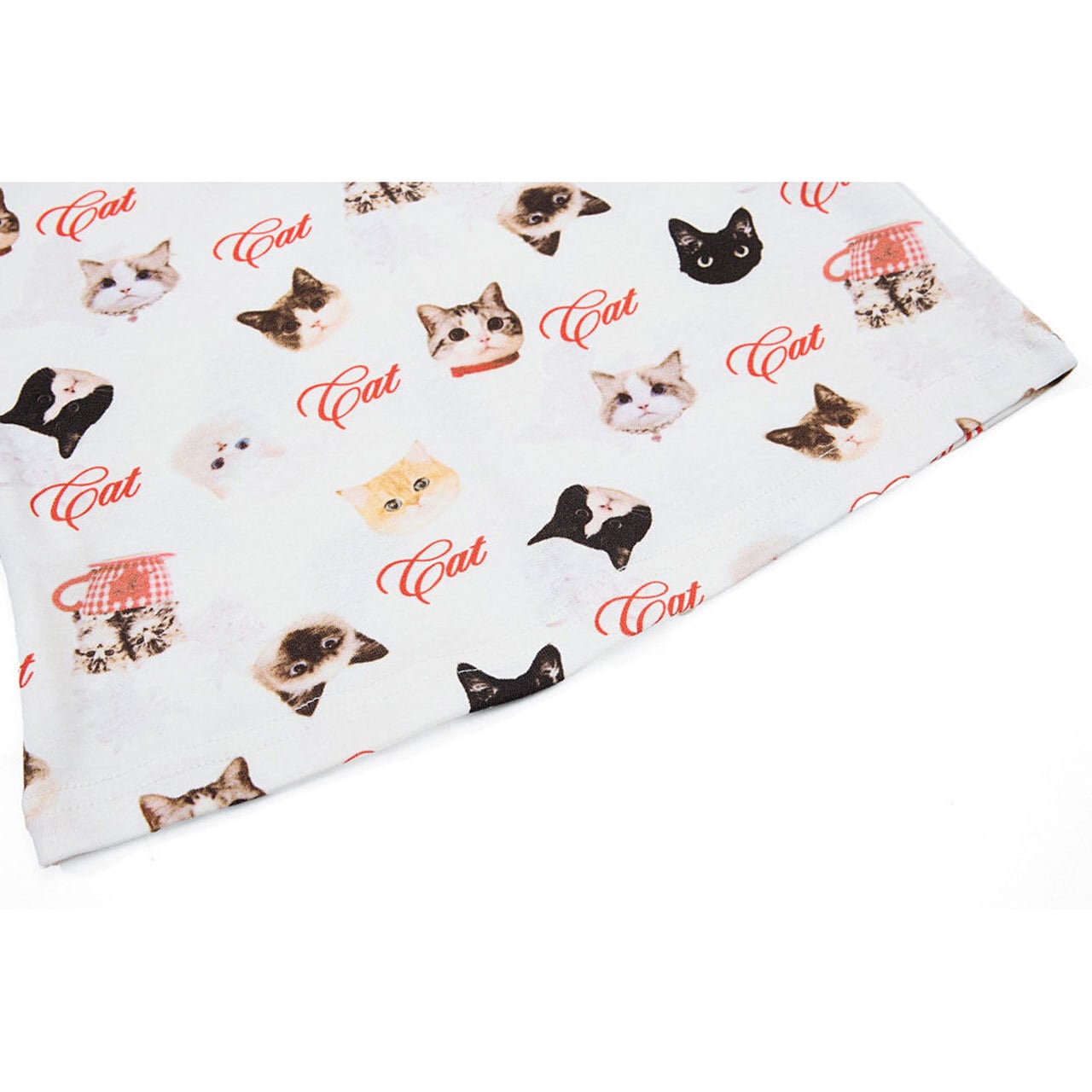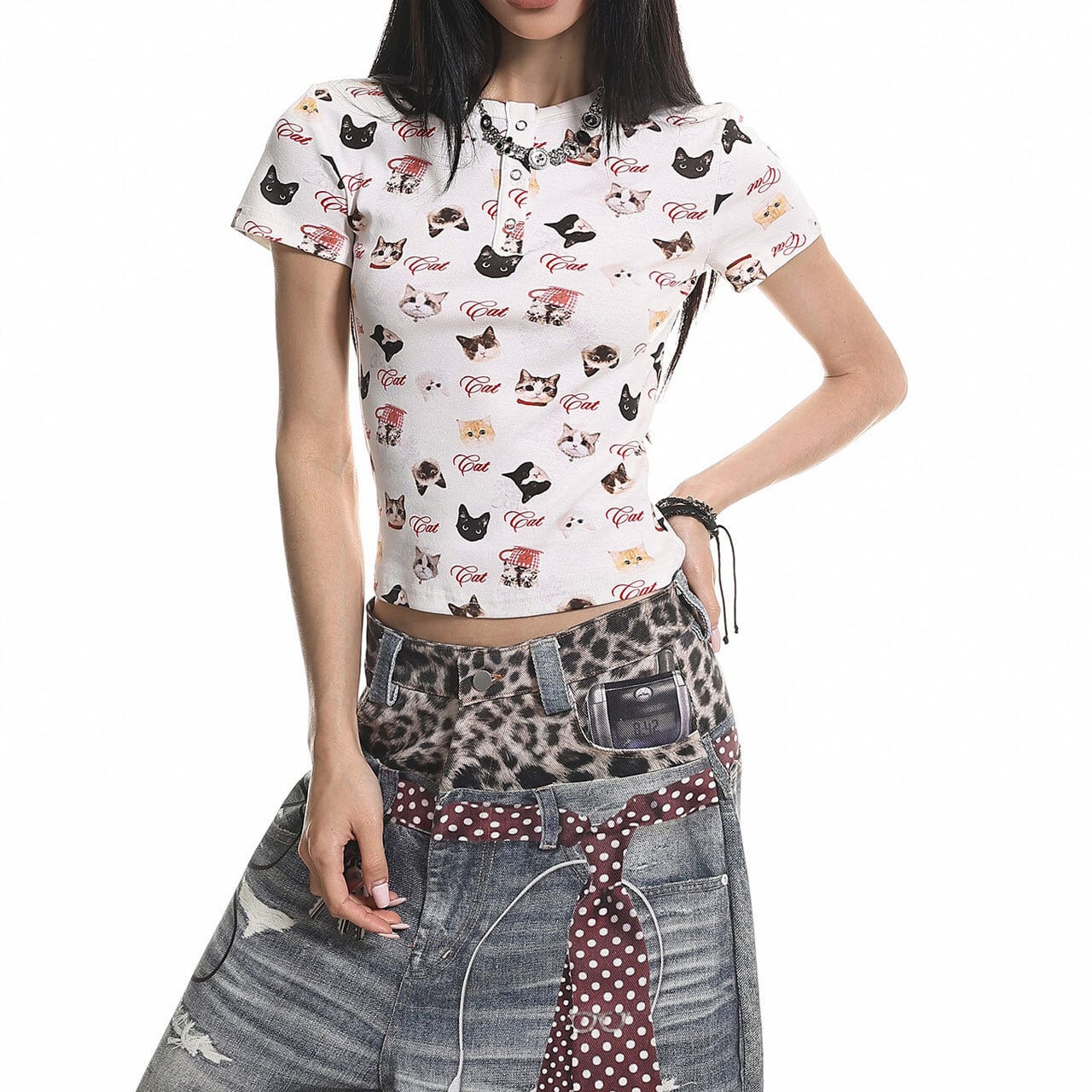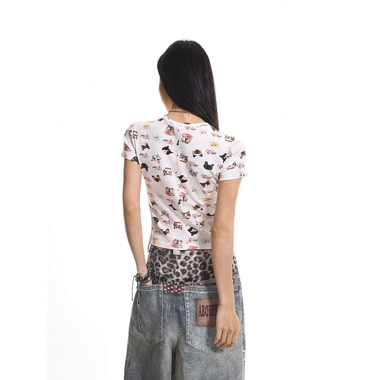 キュートなキャット総柄が目を惹く、ポップストリートなショートスリーブトップス。