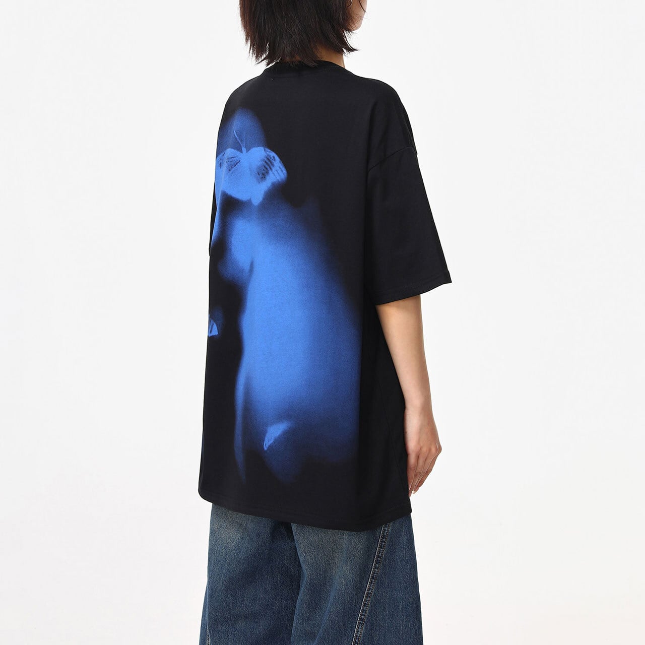 フロントいっぱいに広がるフォトアートが視線を奪う、インパクト重視のグラフィックTシャツ。
