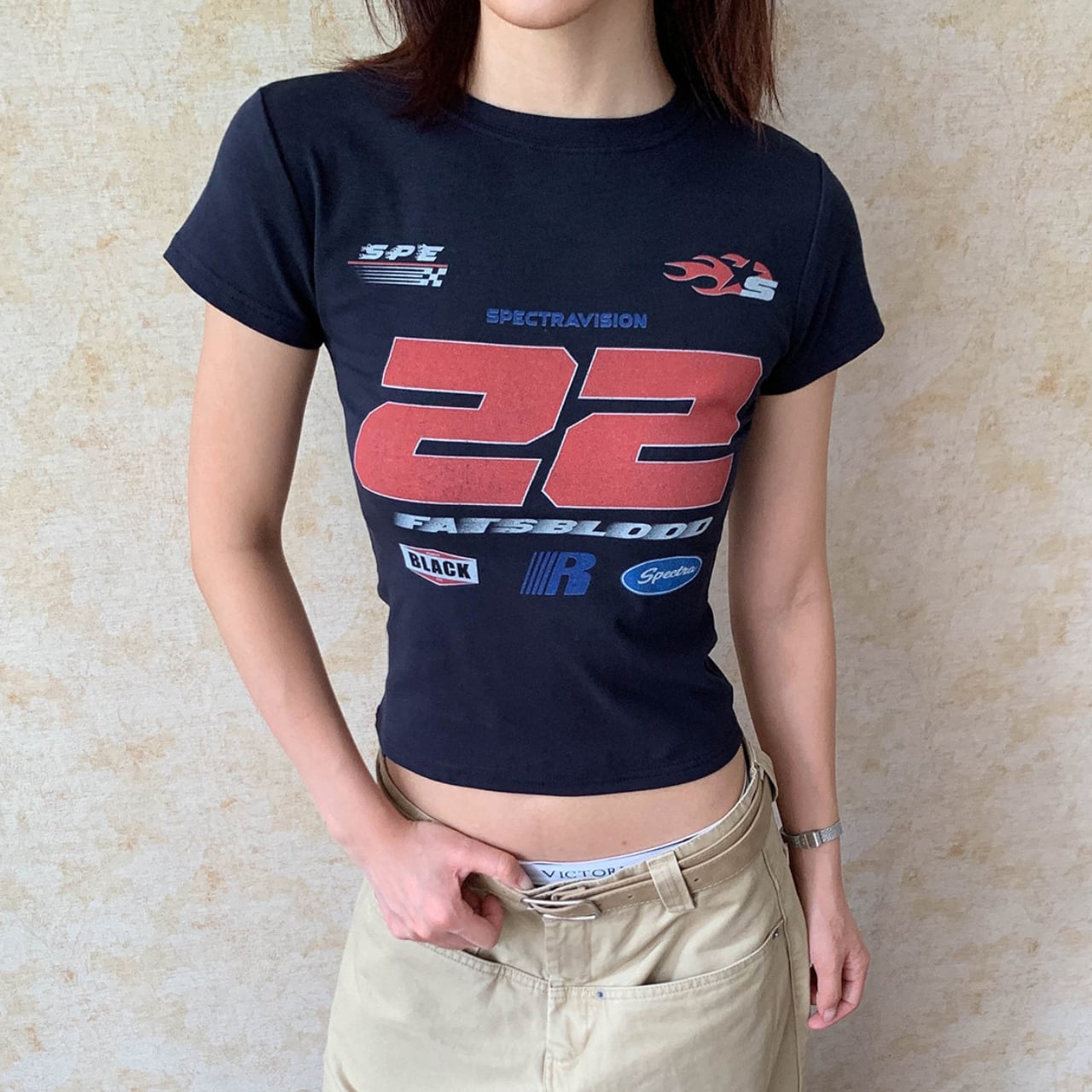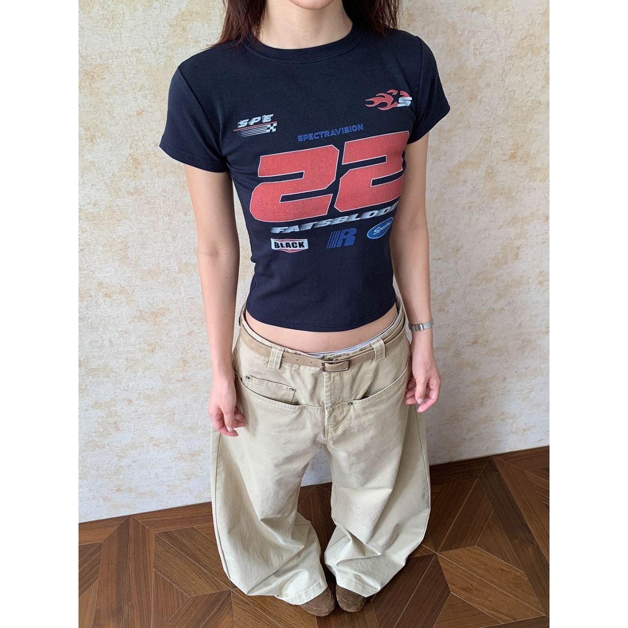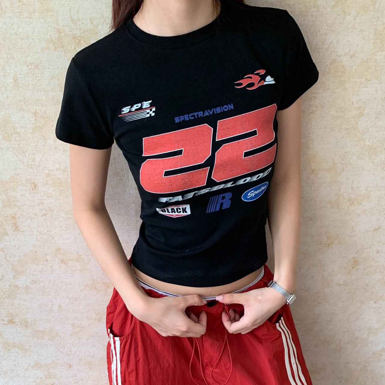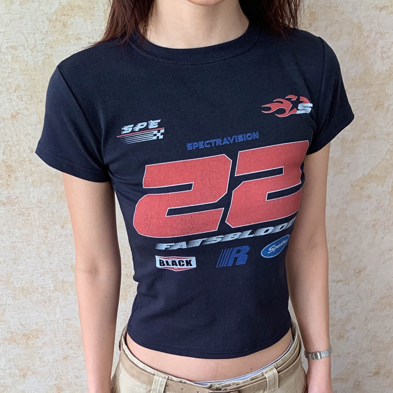目を引くグラフィックプリントが印象的なクロップド丈Tシャツ。