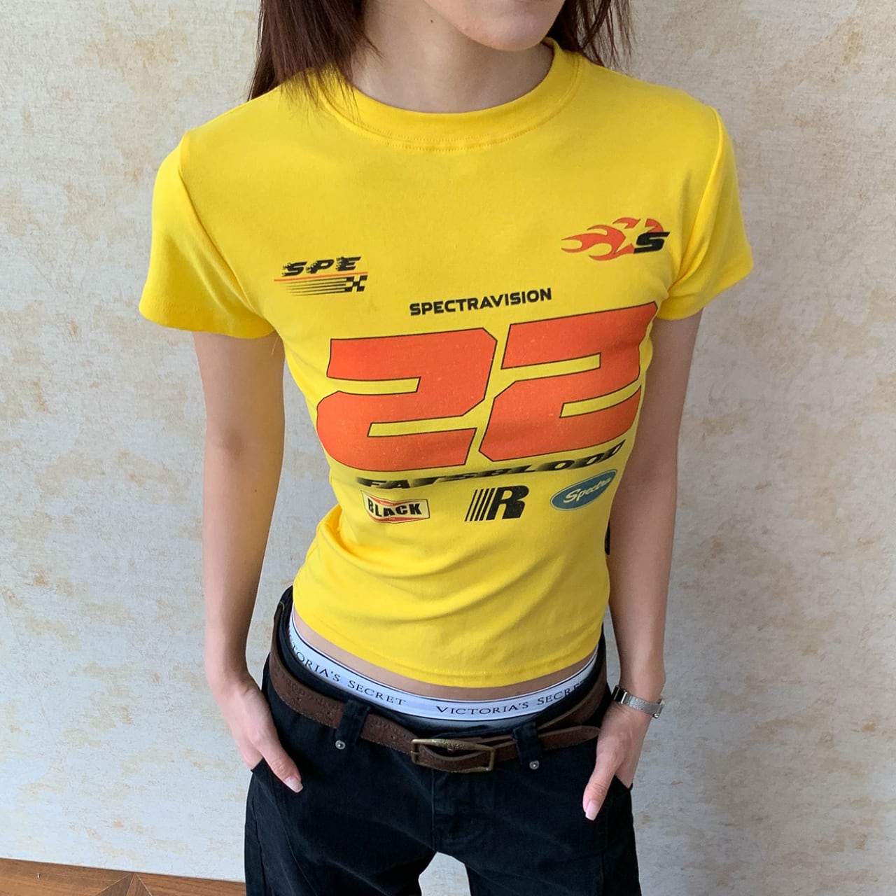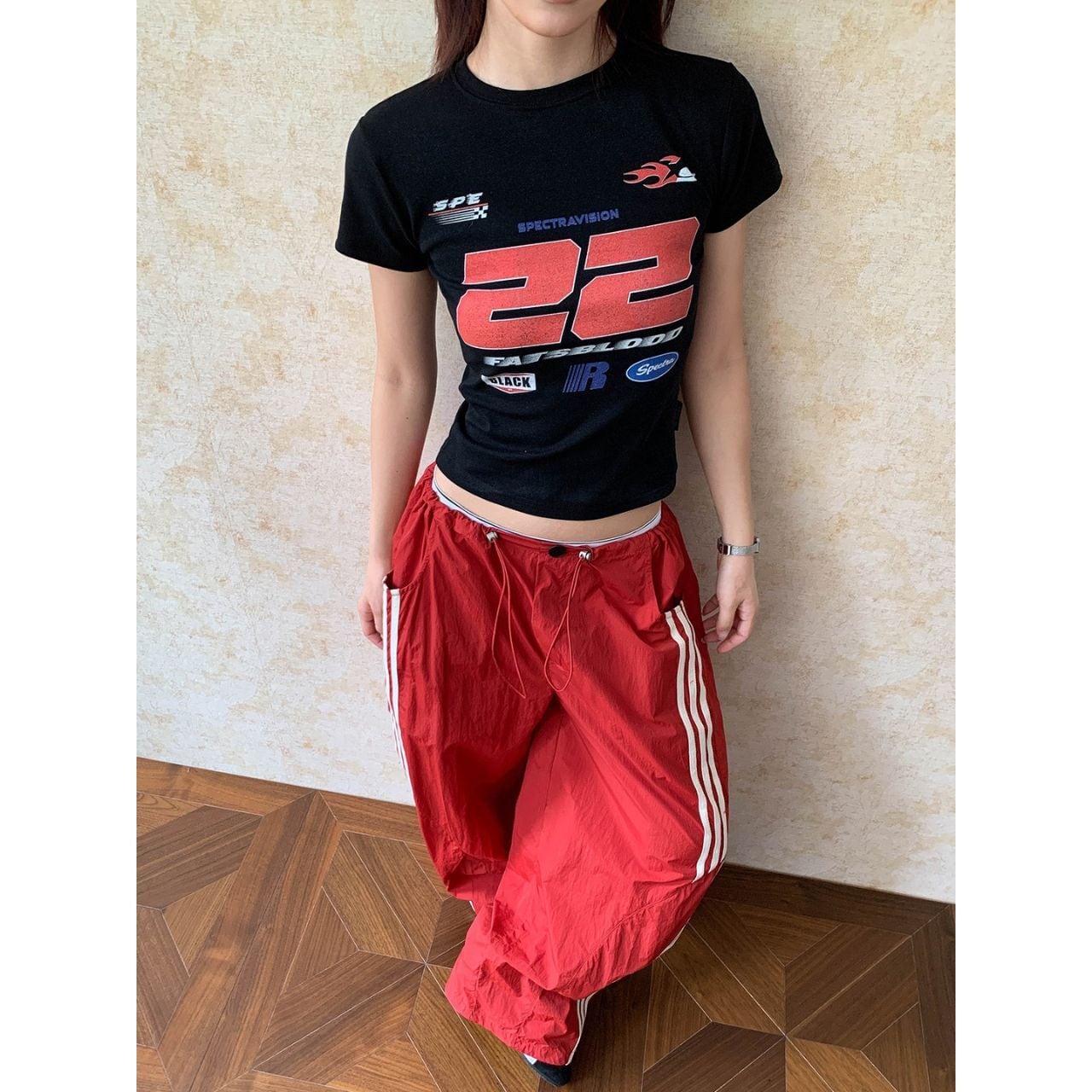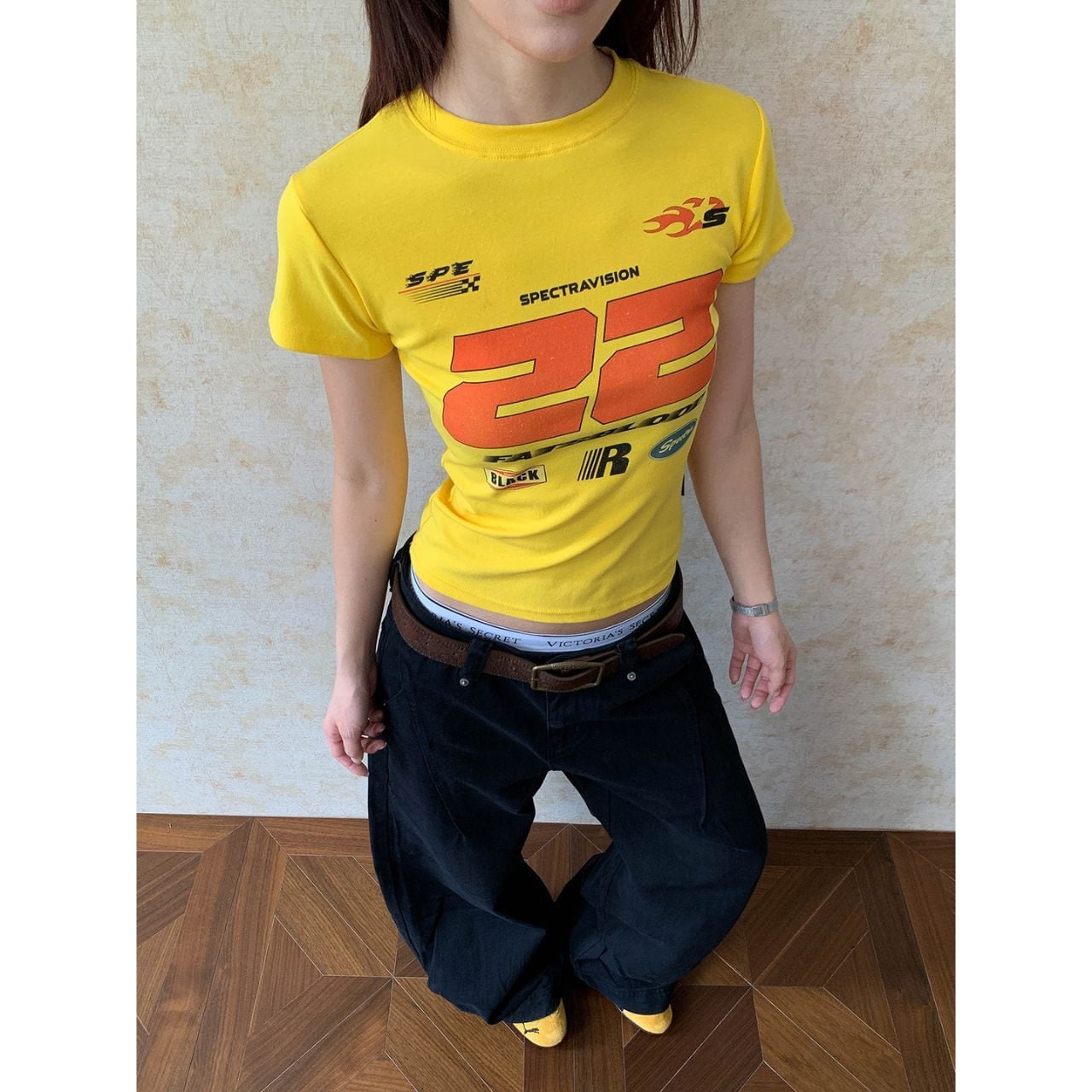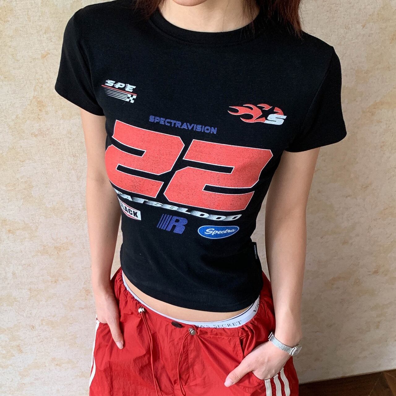 目を引くグラフィックプリントが印象的なクロップド丈Tシャツ。