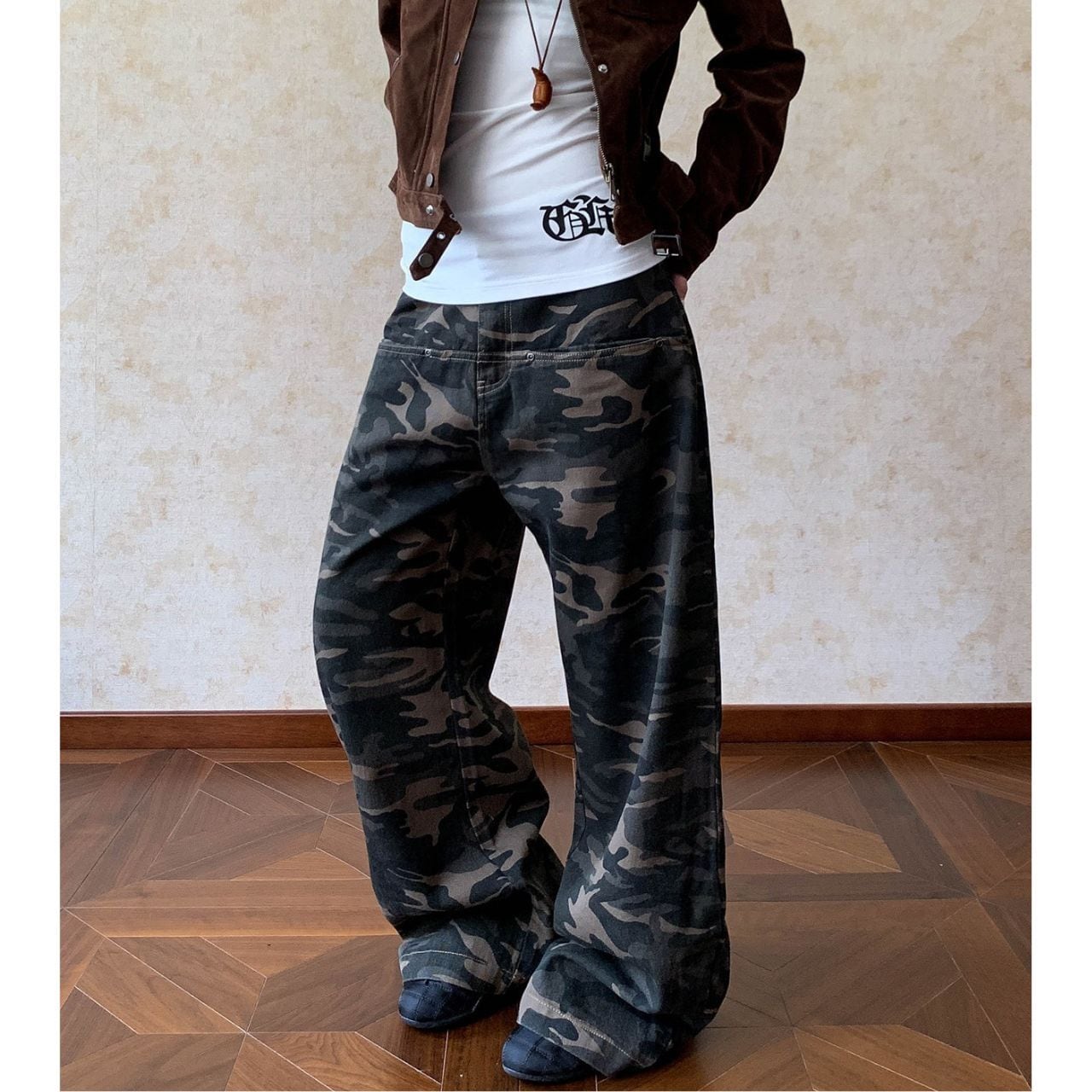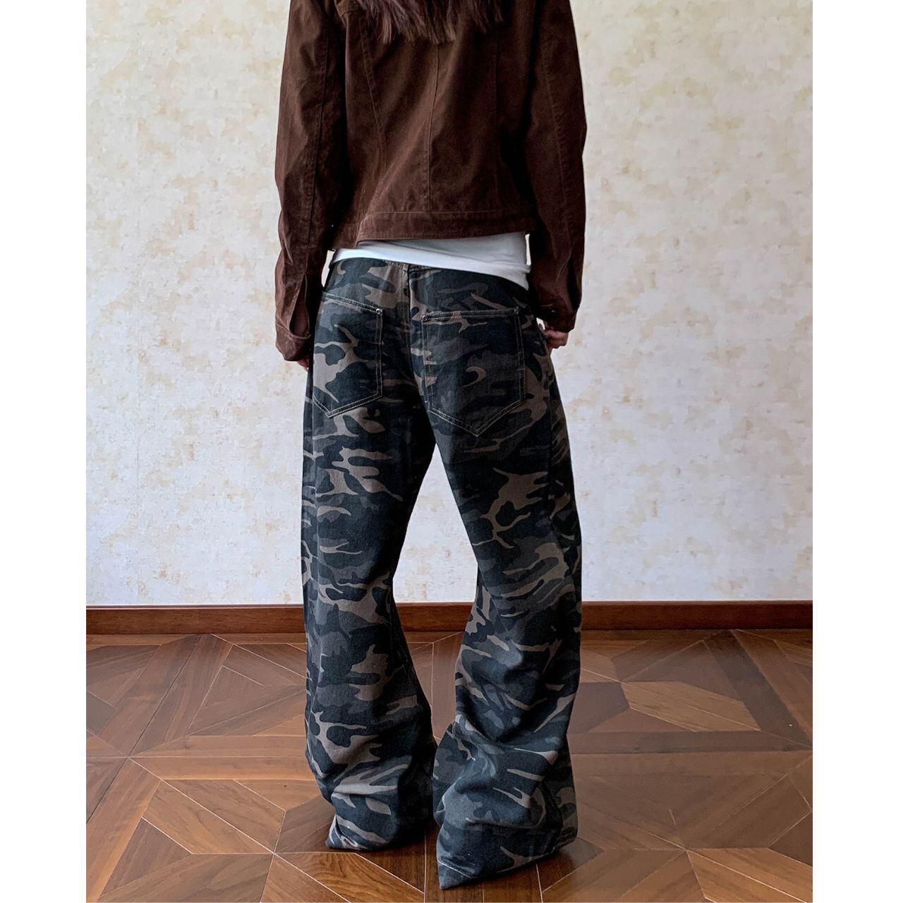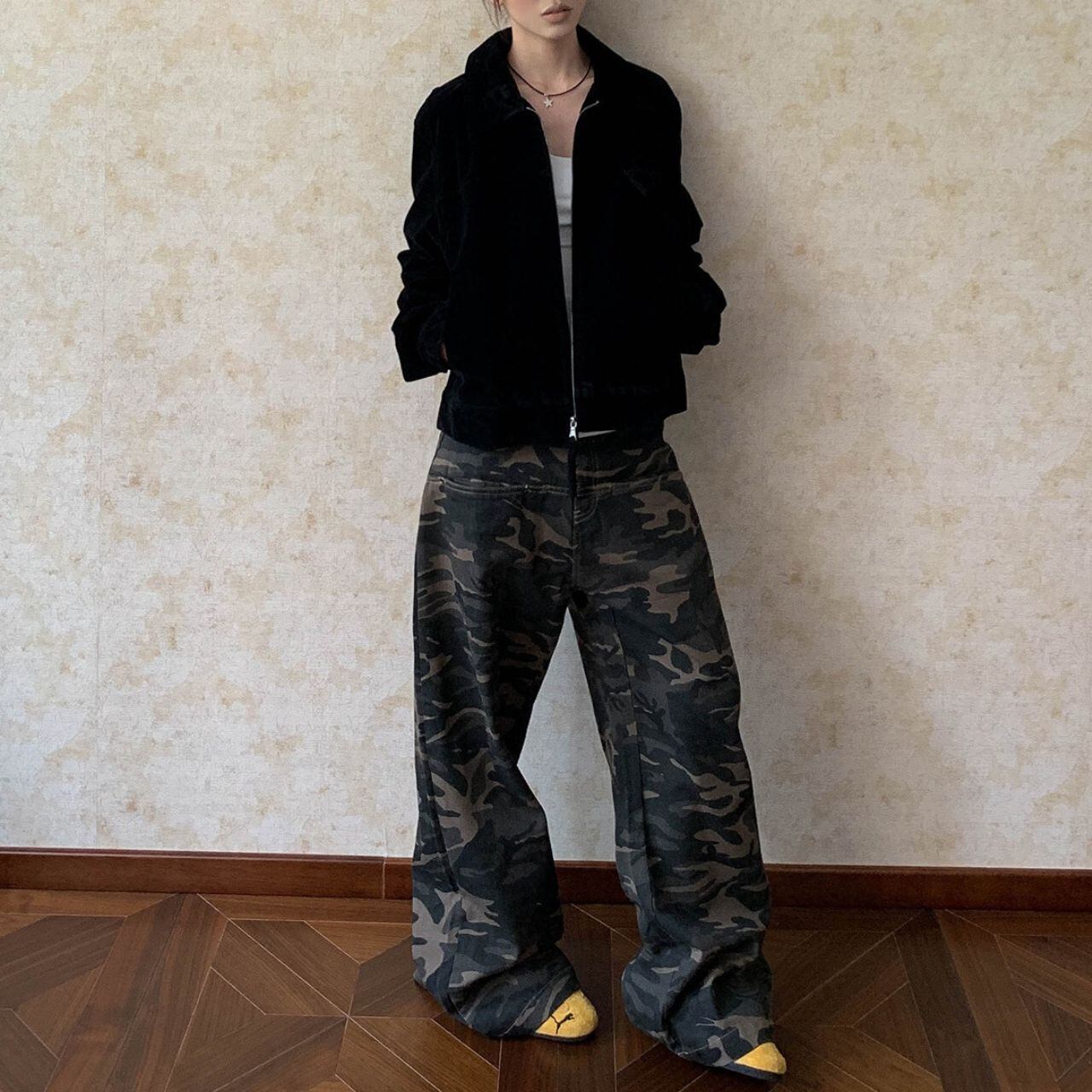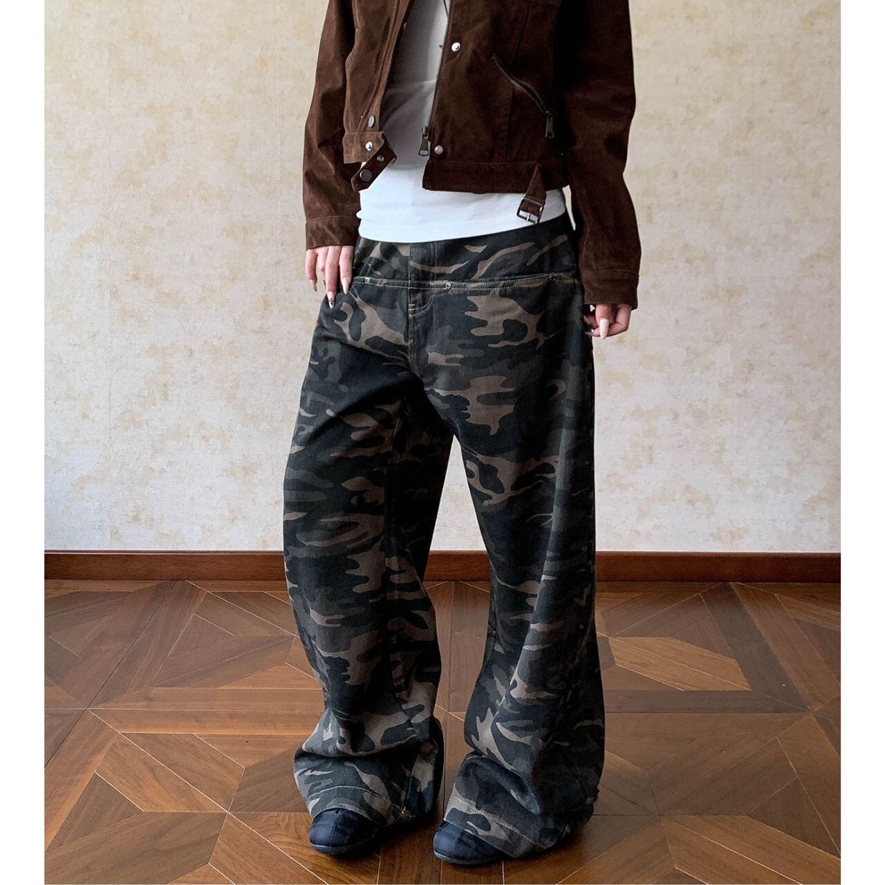 カモフラージュ柄がコーディネートのアクセントになり、ストリートスタイルにマッチします。