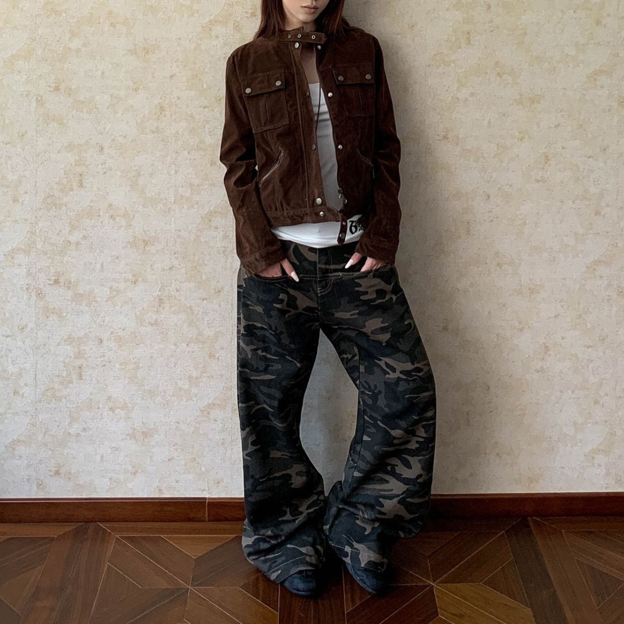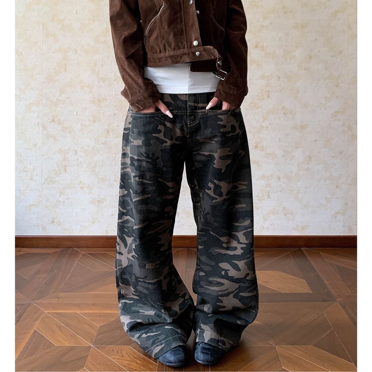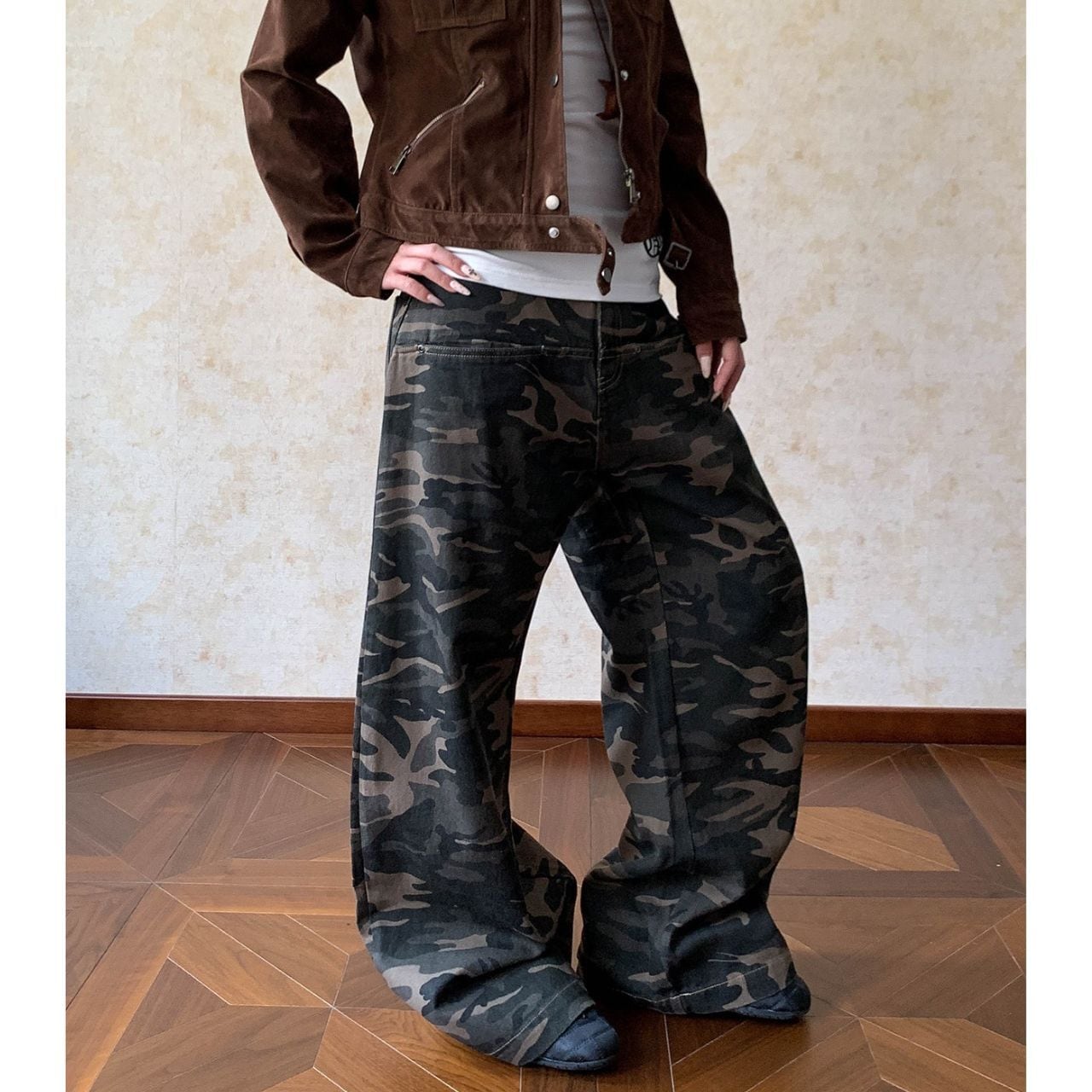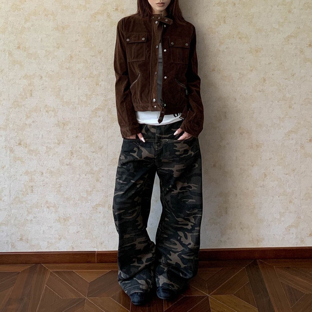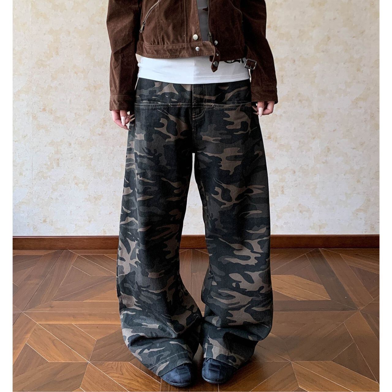 カモフラージュ柄がコーディネートのアクセントになり、ストリートスタイルにマッチします。
