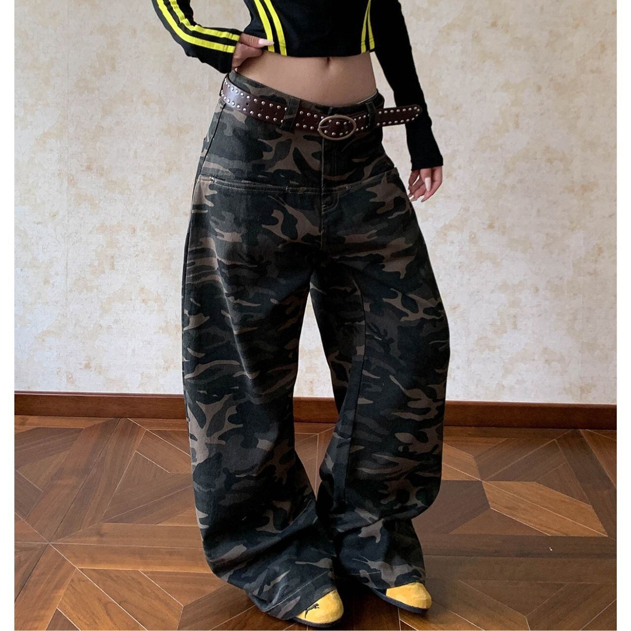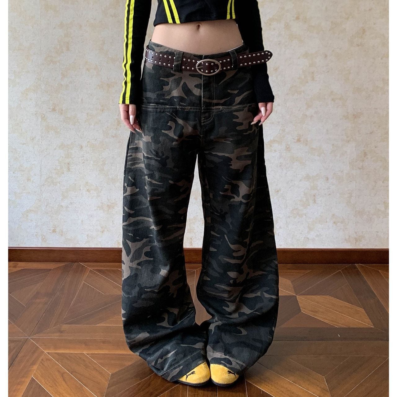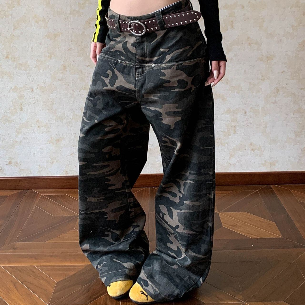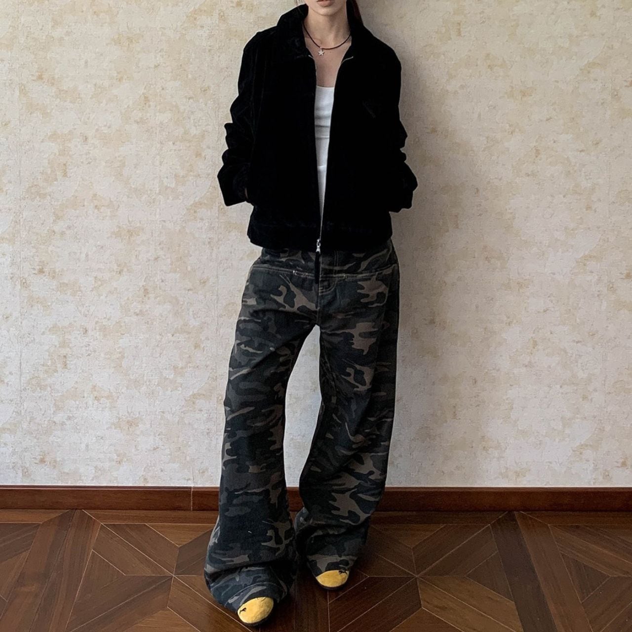 カモフラージュ柄がコーディネートのアクセントになり、ストリートスタイルにマッチします。