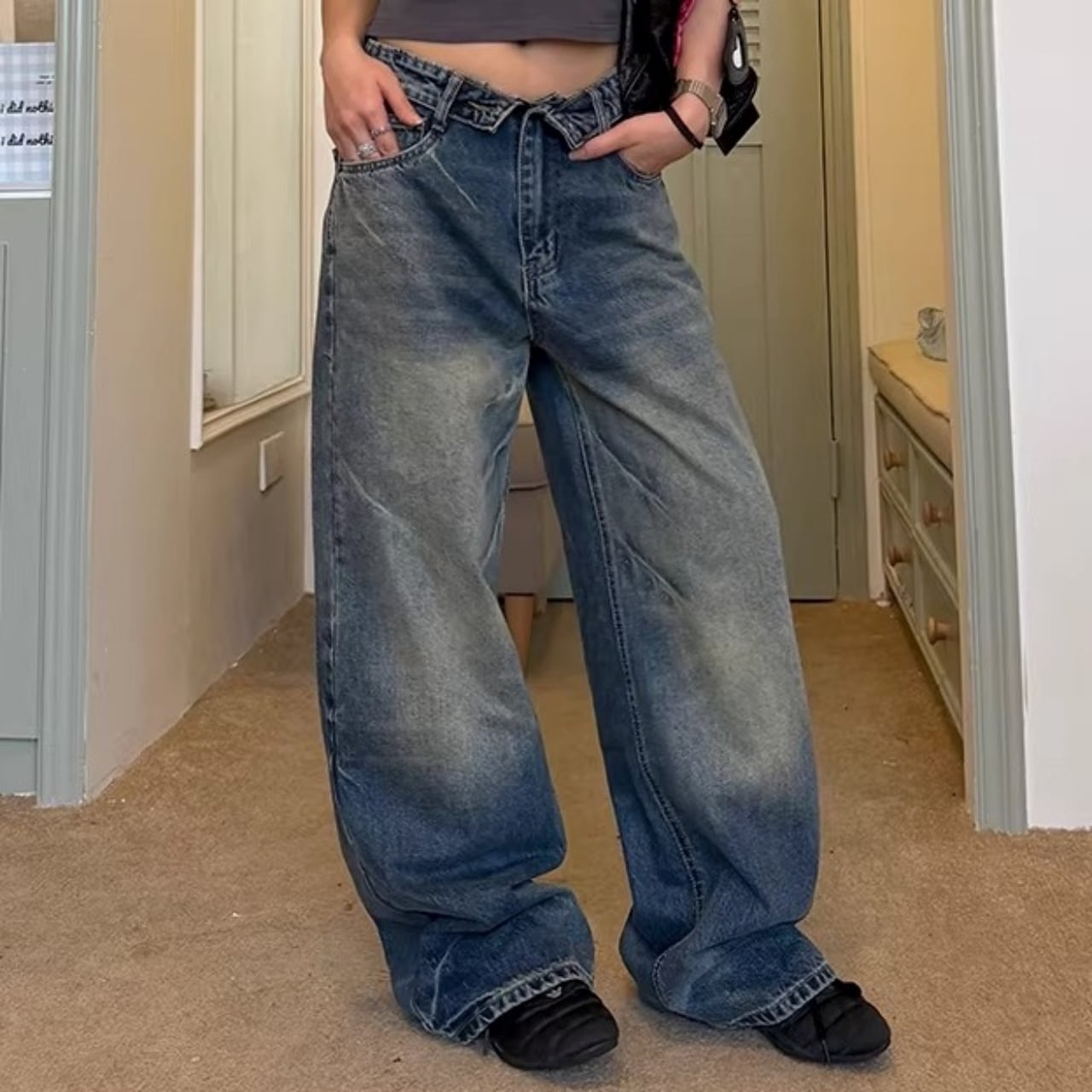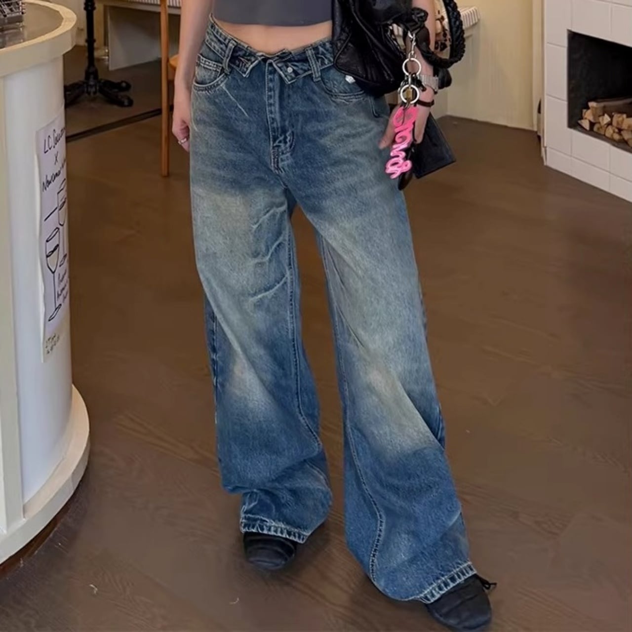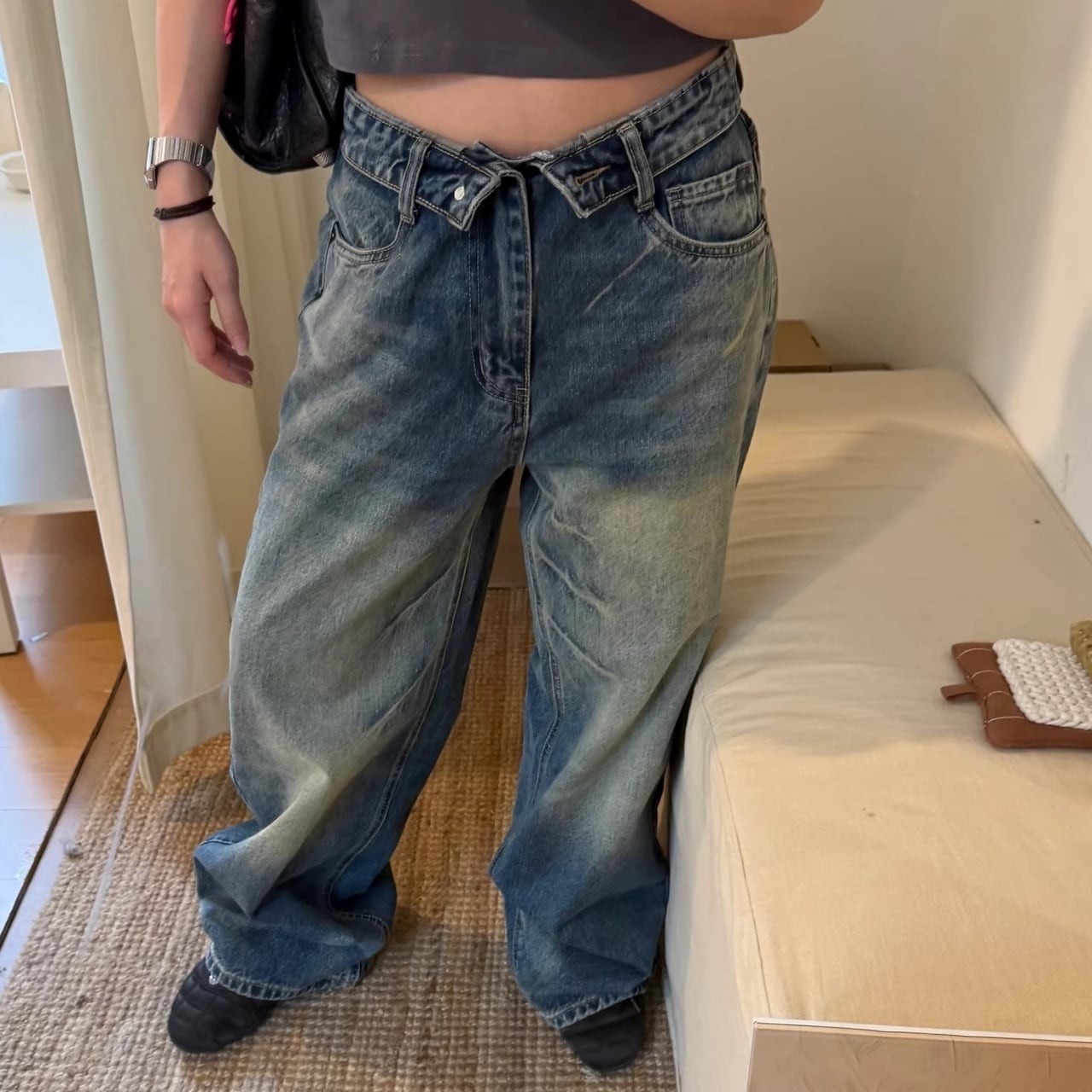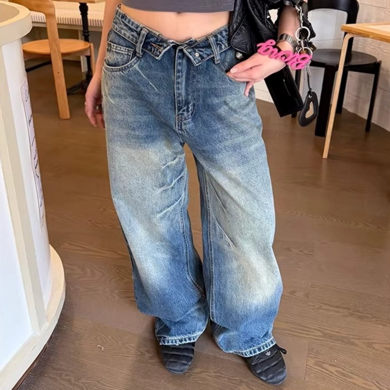 フロントの折り返しディテールが目を惹く、ストリート感満載のワイドデニム。