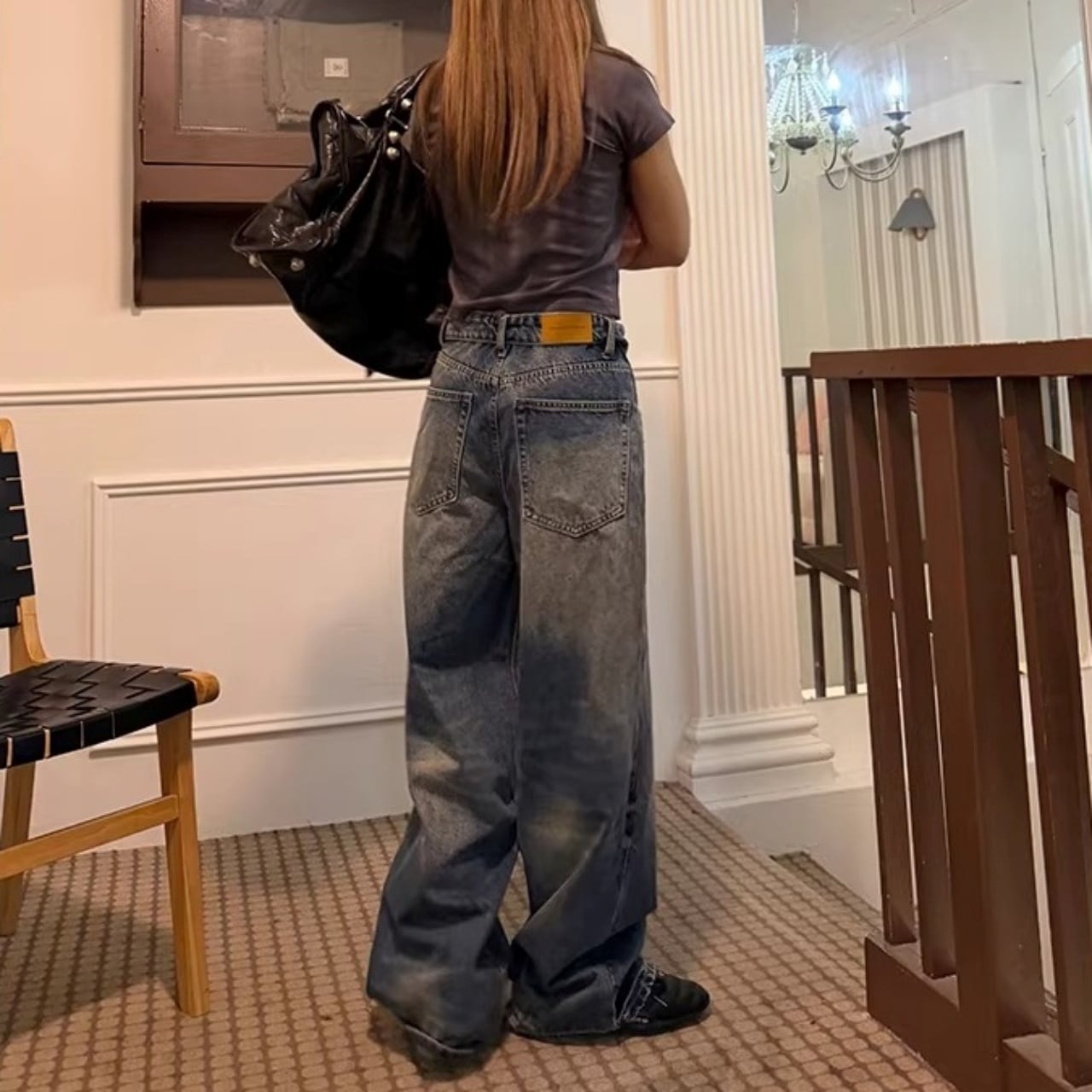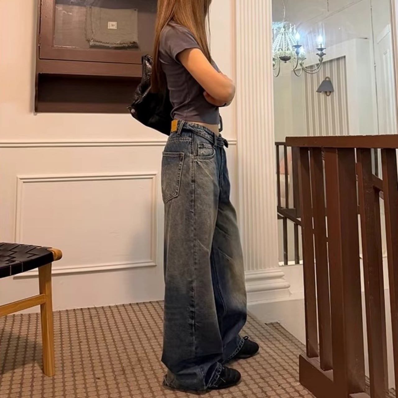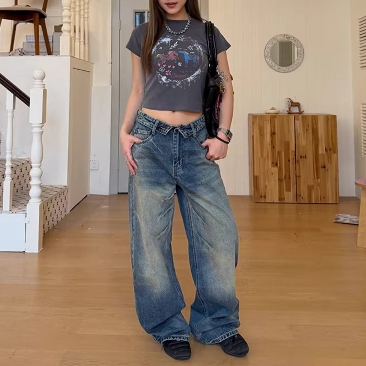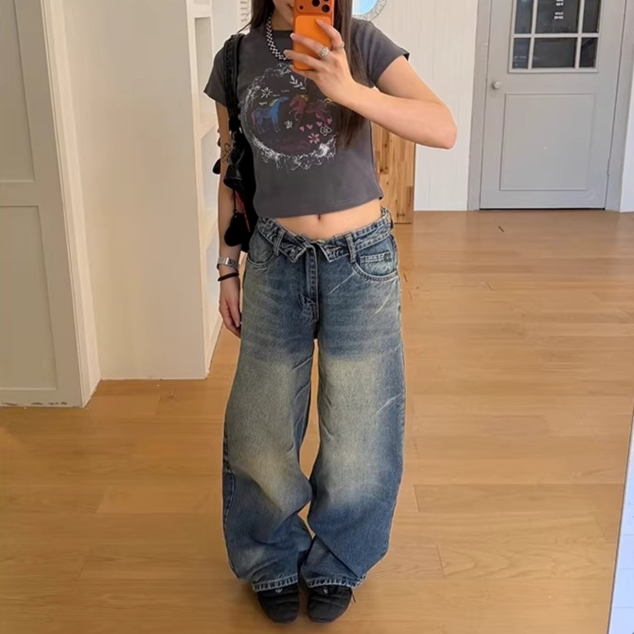 フロントの折り返しディテールが目を惹く、ストリート感満載のワイドデニム。