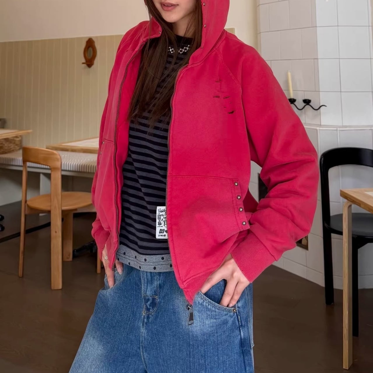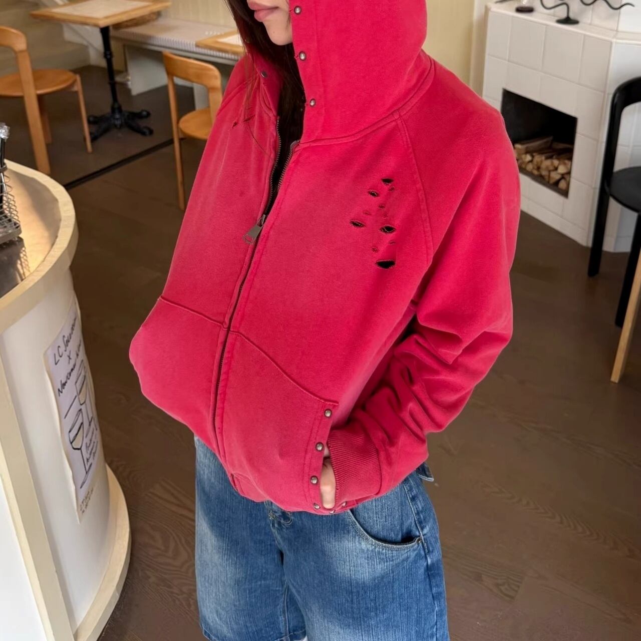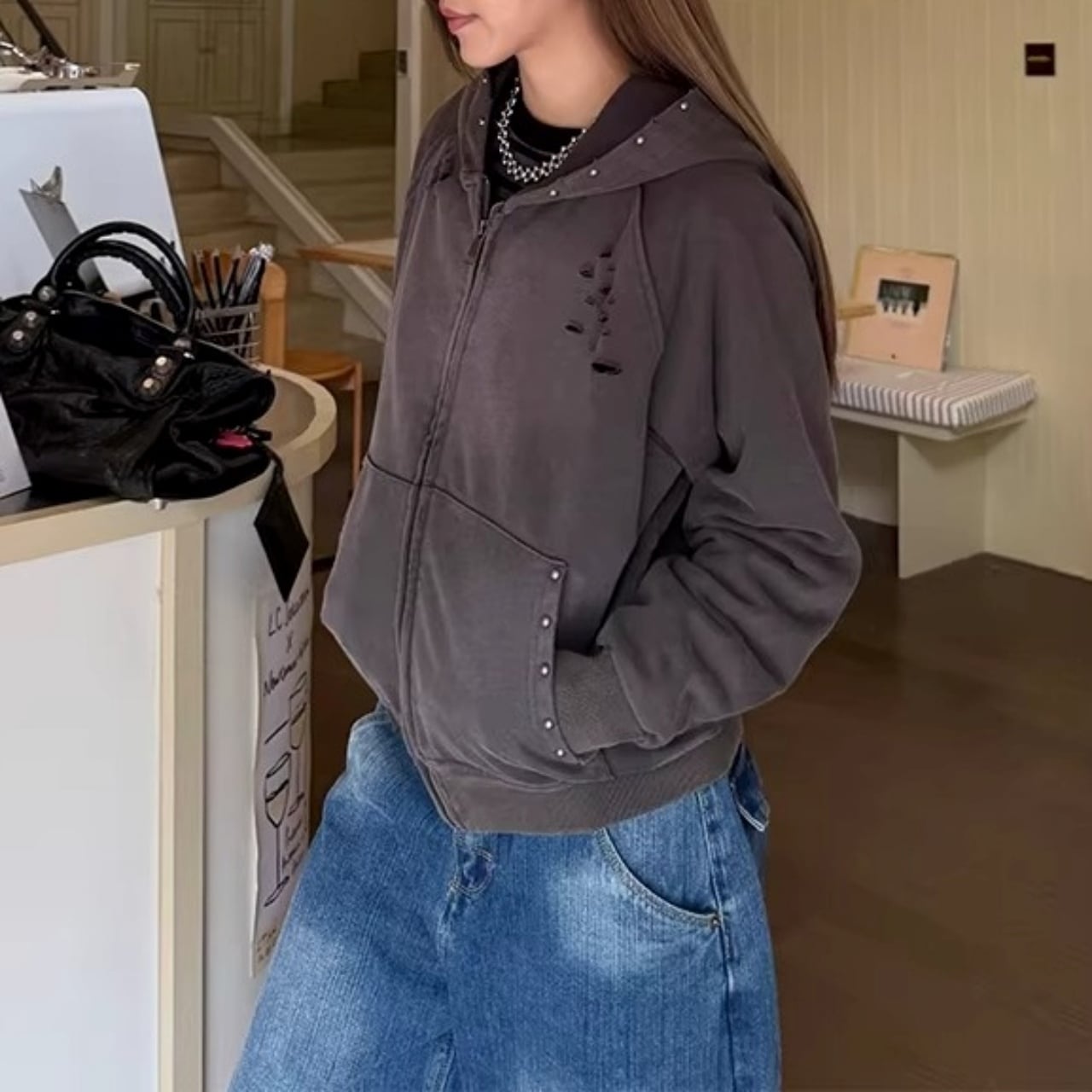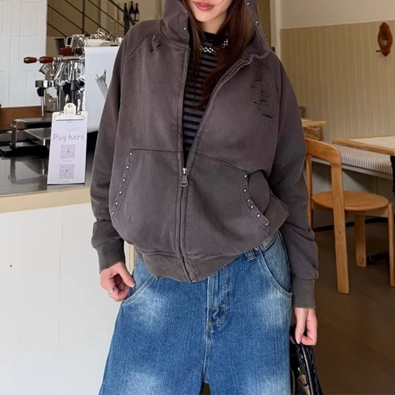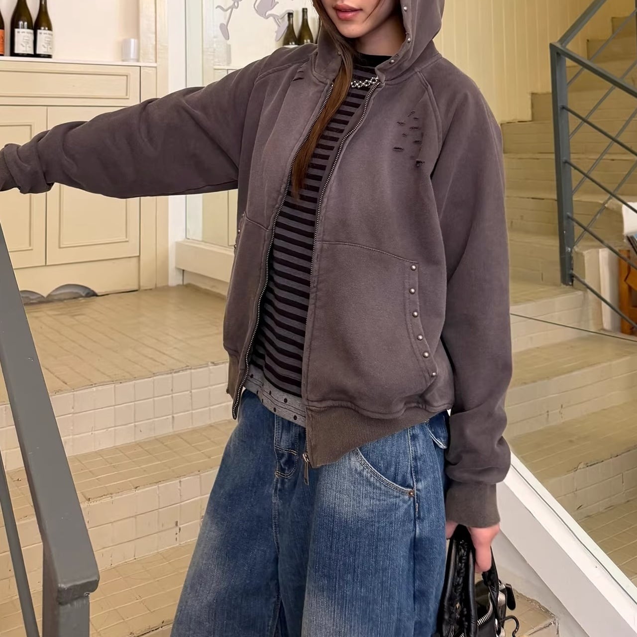 エッジの効いたダメージ加工とスタッズディテールが映えるフルジップフーディー。