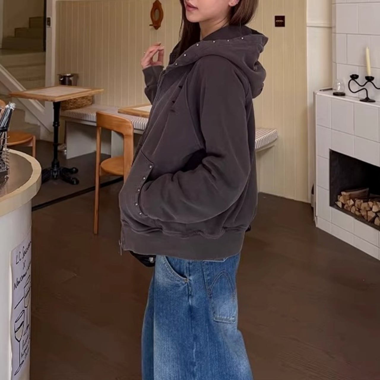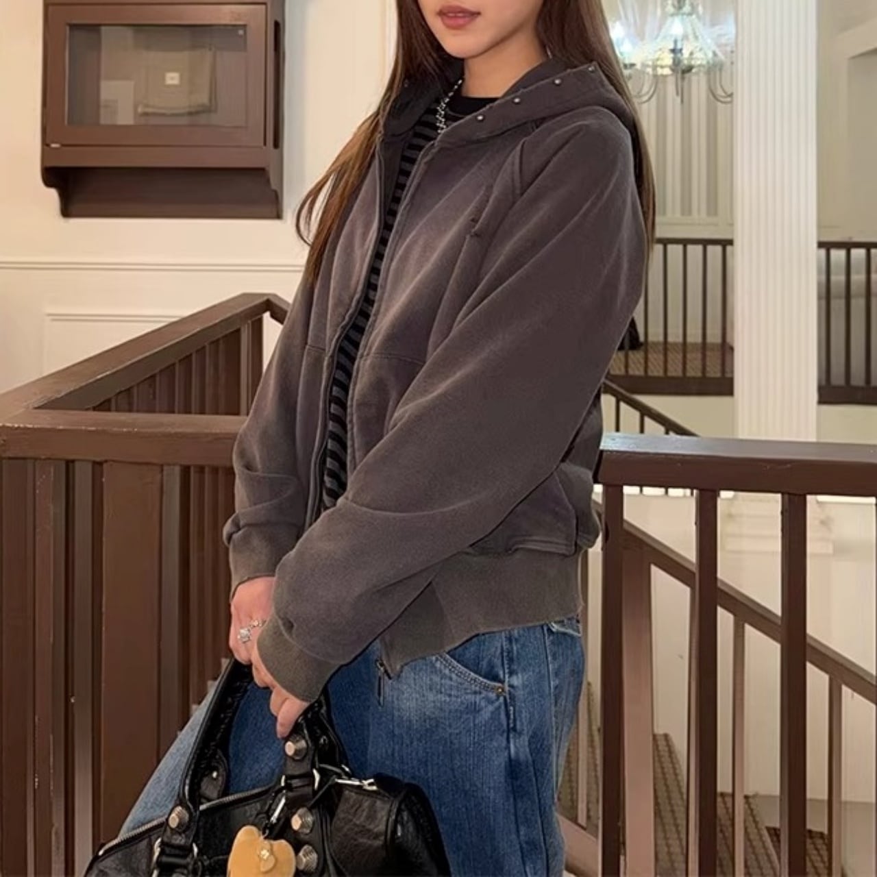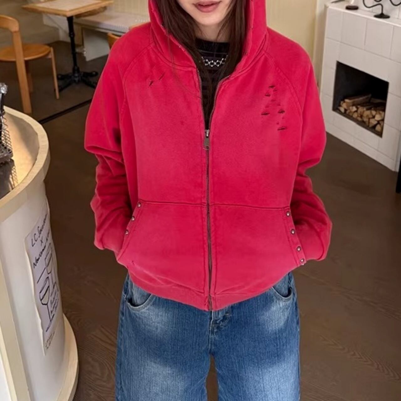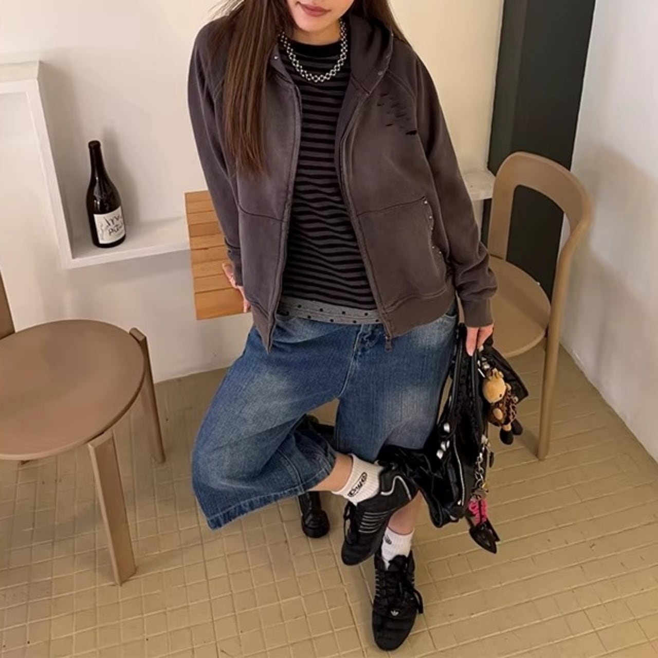 エッジの効いたダメージ加工とスタッズディテールが映えるフルジップフーディー。