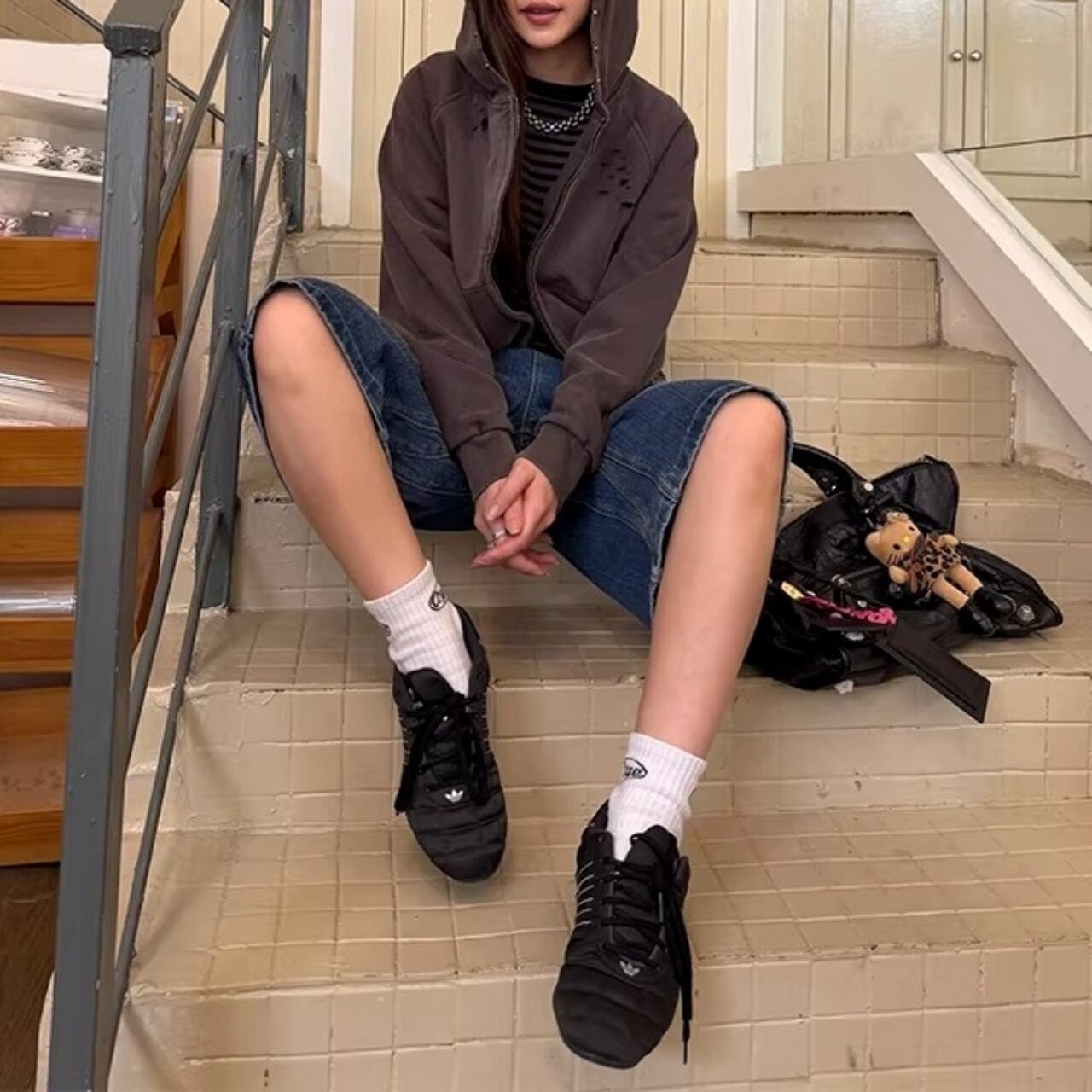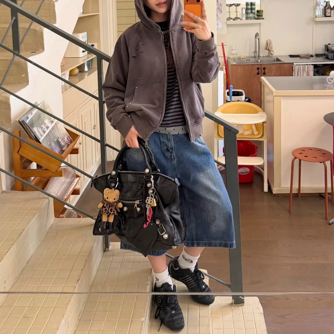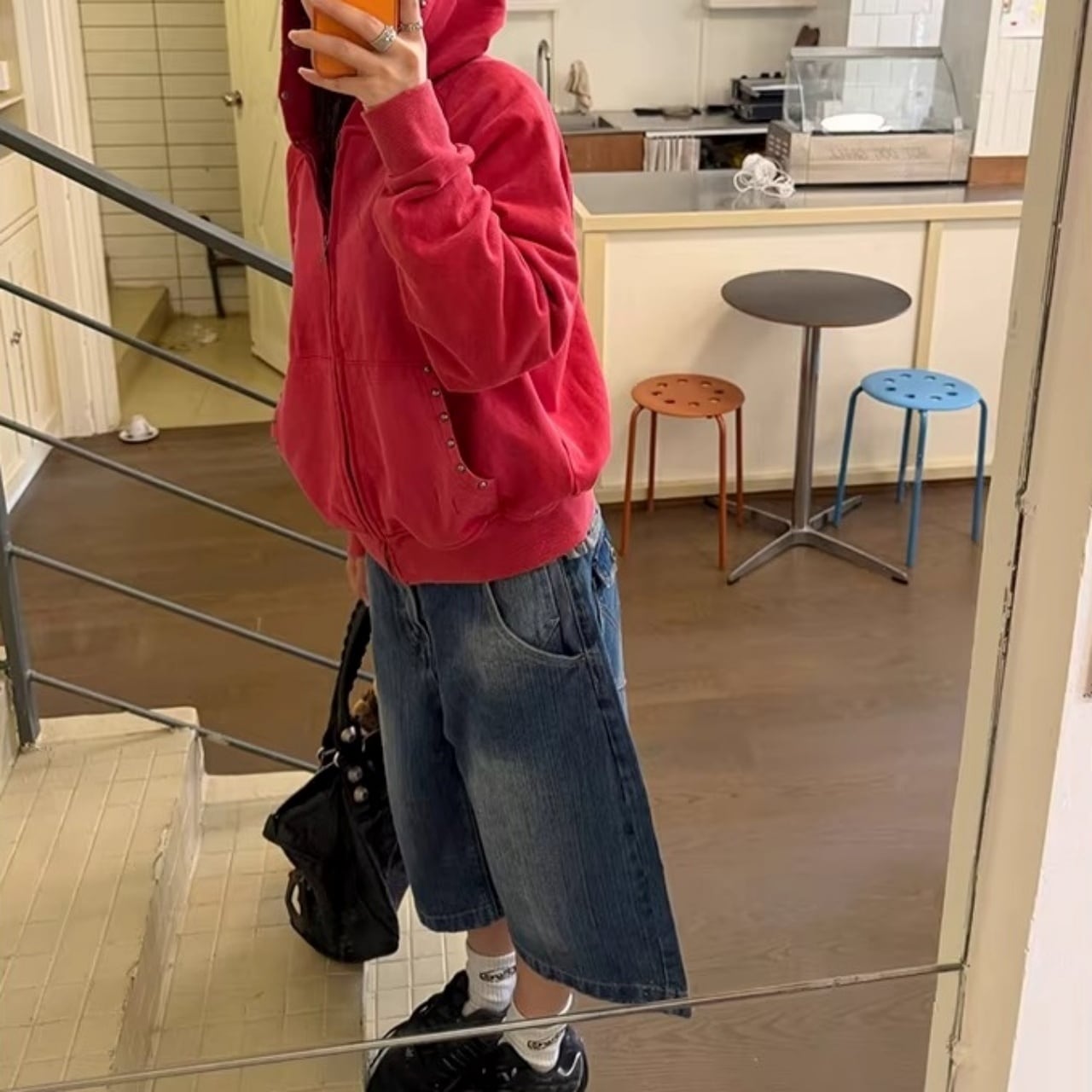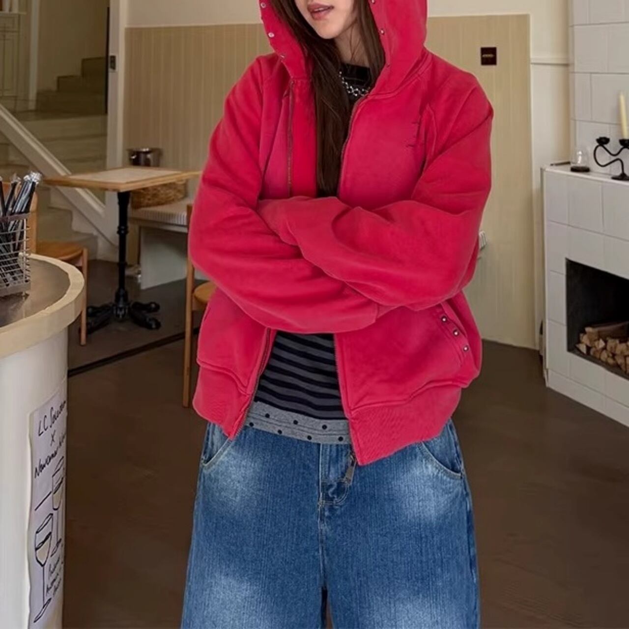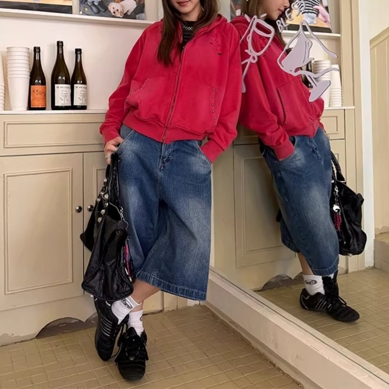 エッジの効いたダメージ加工とスタッズディテールが映えるフルジップフーディー。
