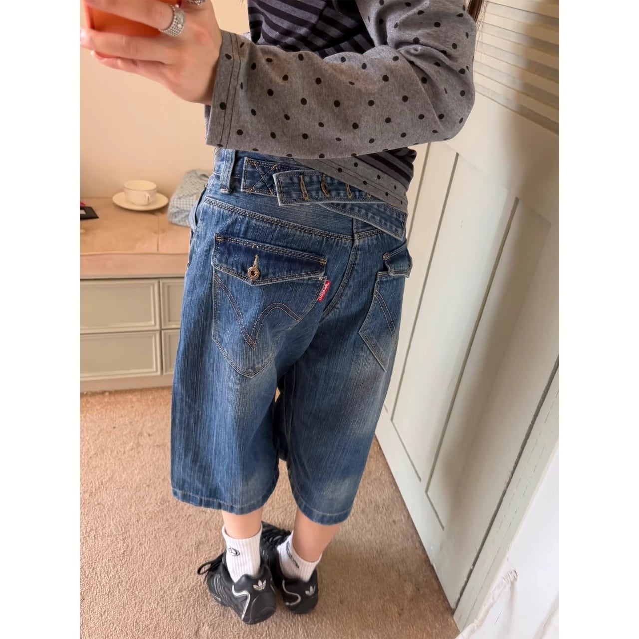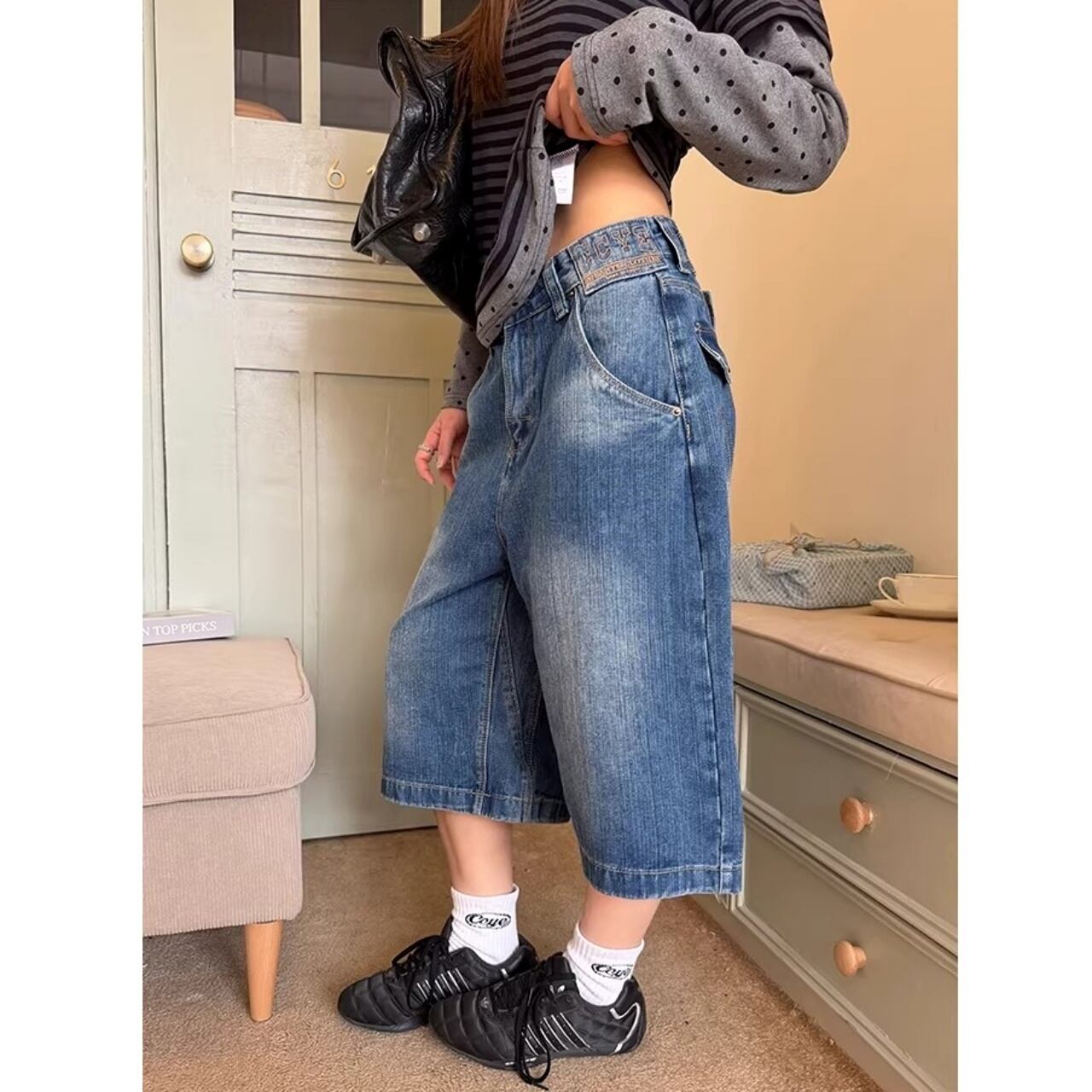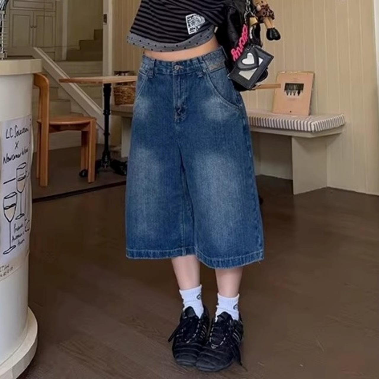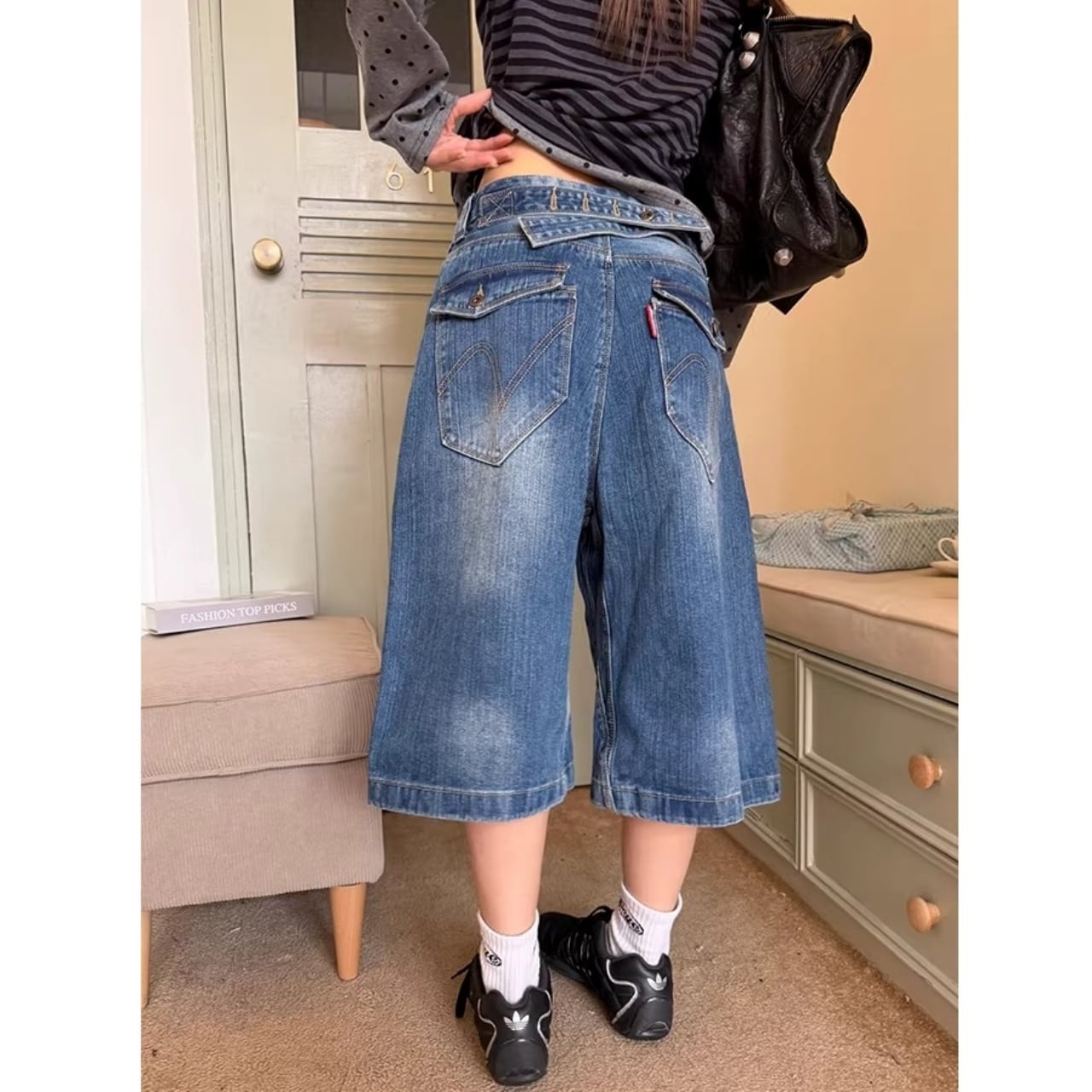 ウエストのクロスデザインが目を惹く、遊び心たっぷりのデニムクロップドパンツ。