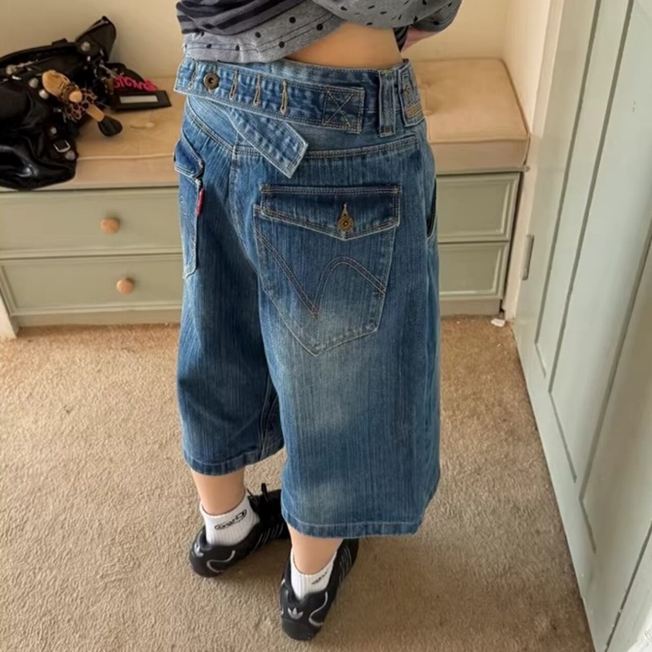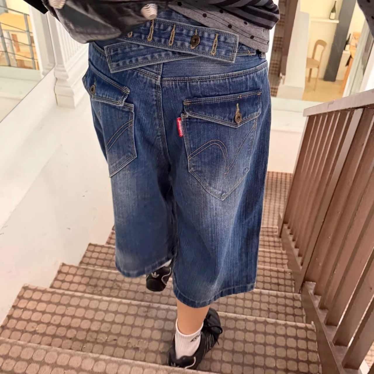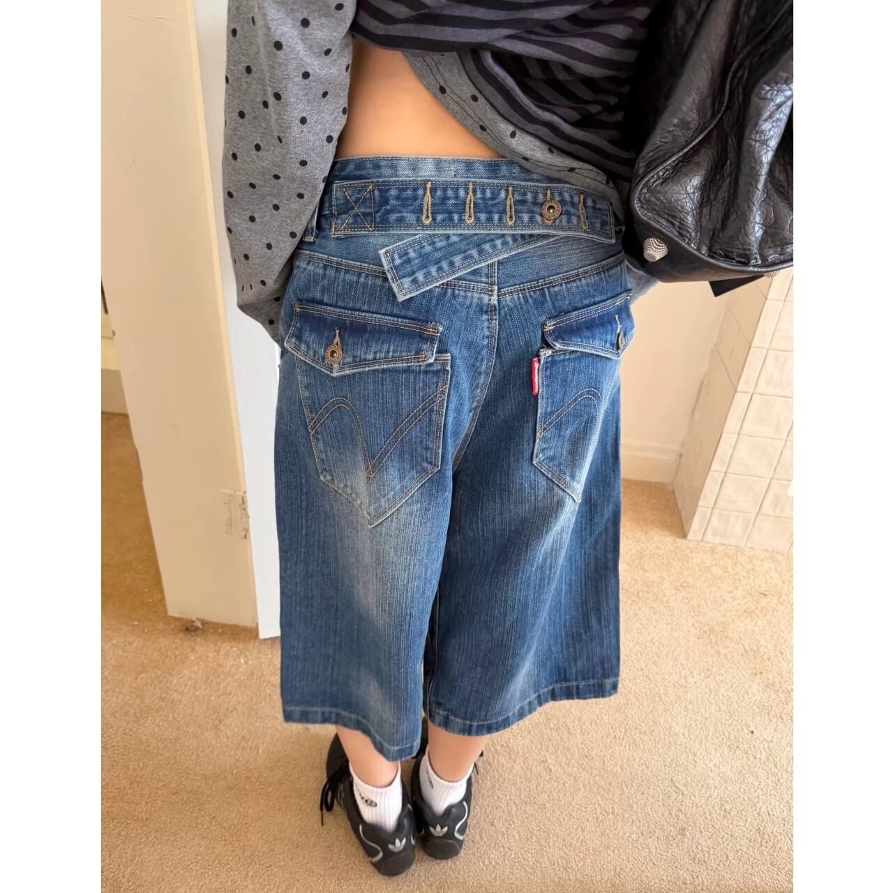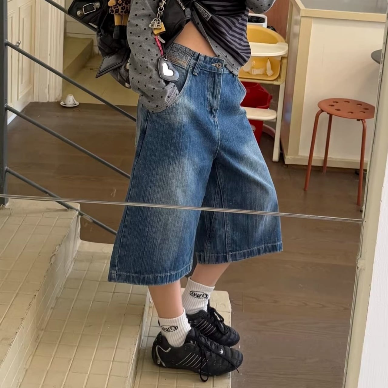 ウエストのクロスデザインが目を惹く、遊び心たっぷりのデニムクロップドパンツ。