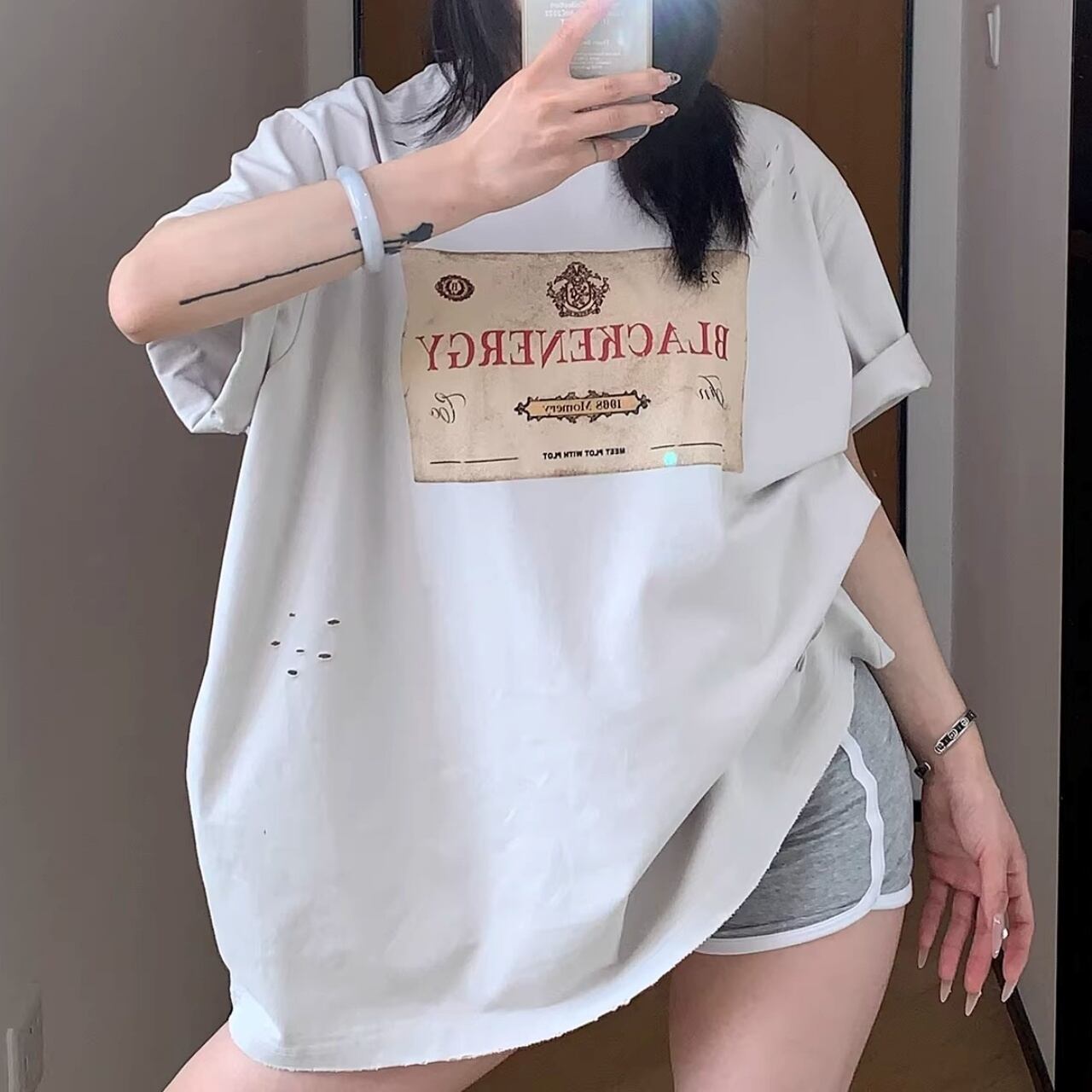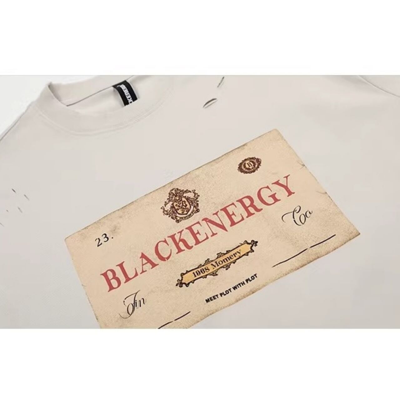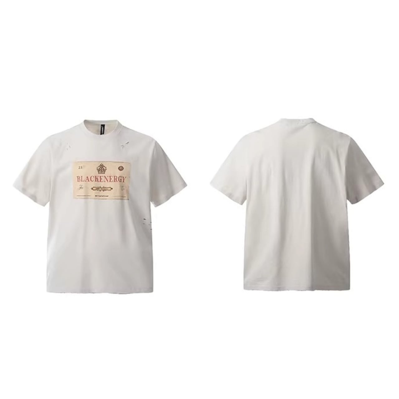 クラシカルなラベルモチーフを大胆に配置し、ダメージディテールでエッジを効かせたTシャツ。
