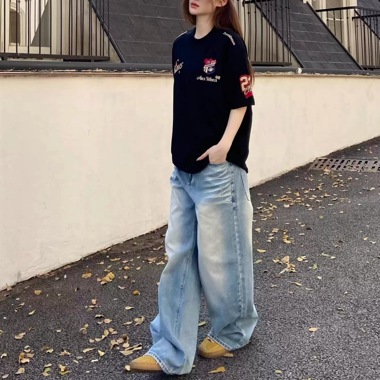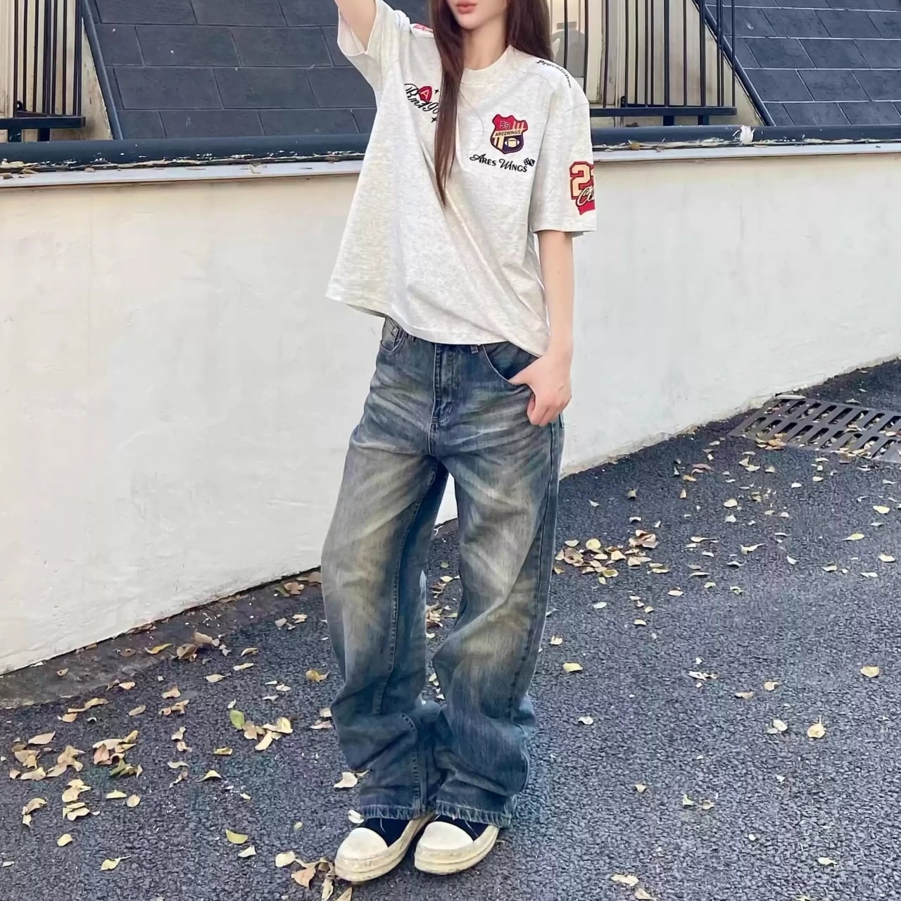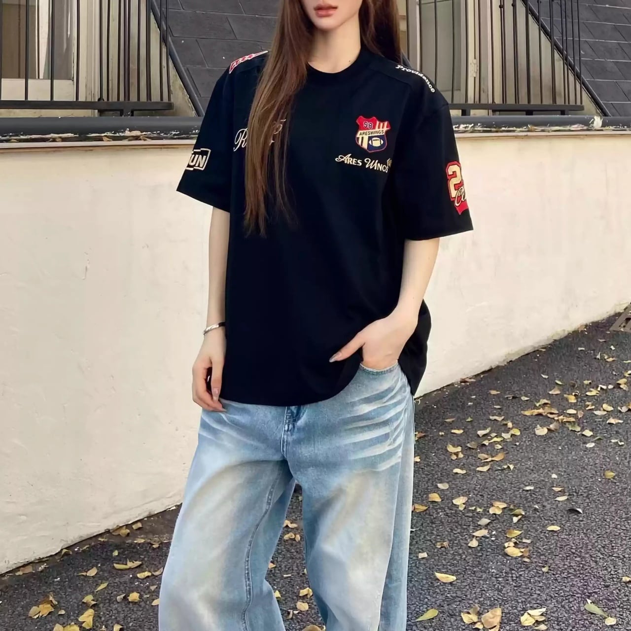 散りばめられたモチーフと袖のアクセントが、ストリートライクな遊び心を演出します。