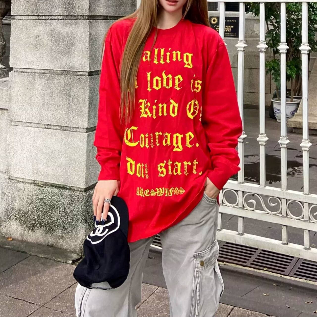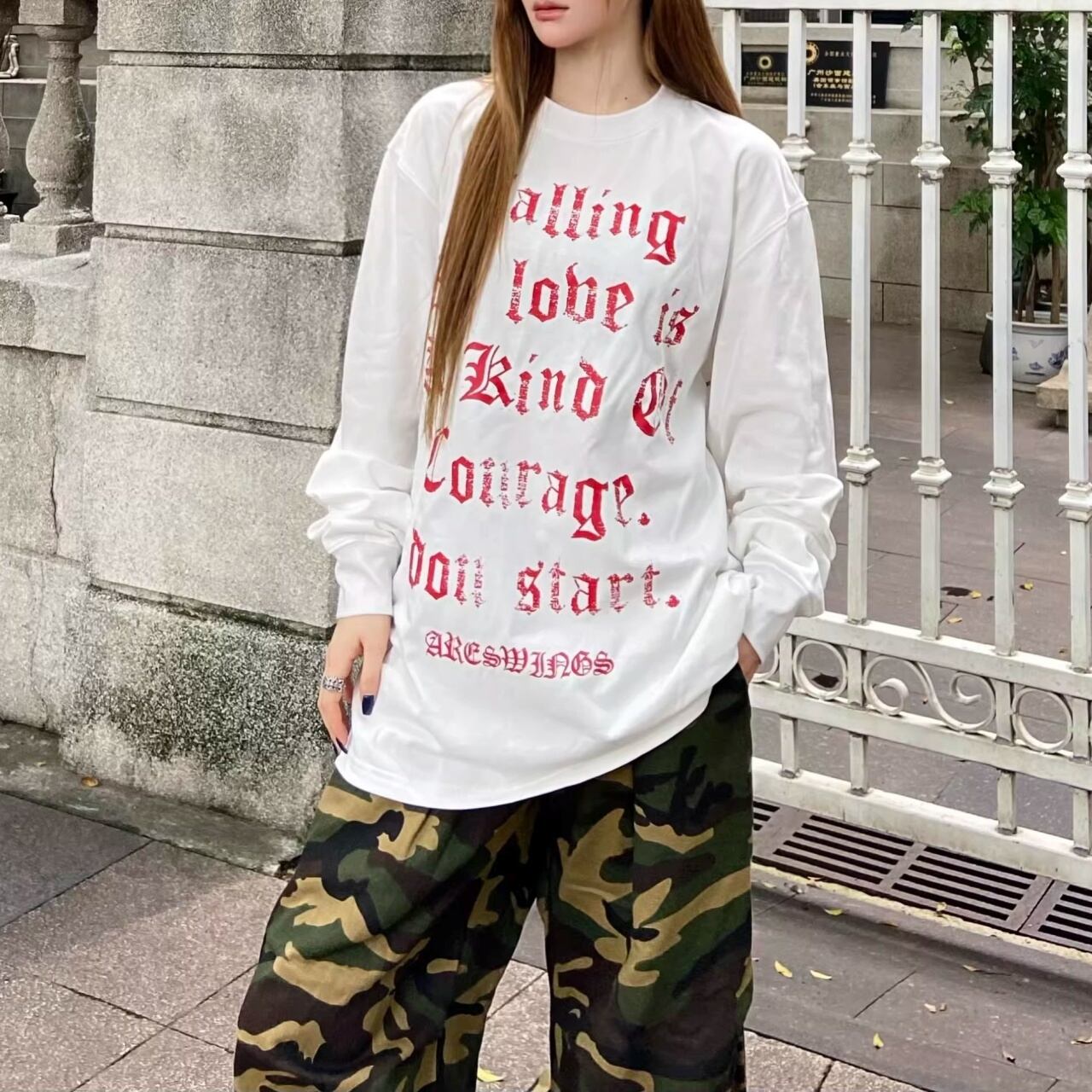 インパクトのあるゴシックロゴプリントが特徴の、ストリートな存在感を放つロングスリーブTシャツ。