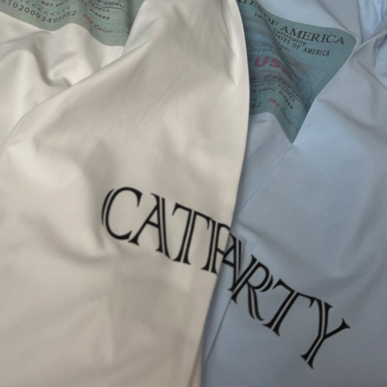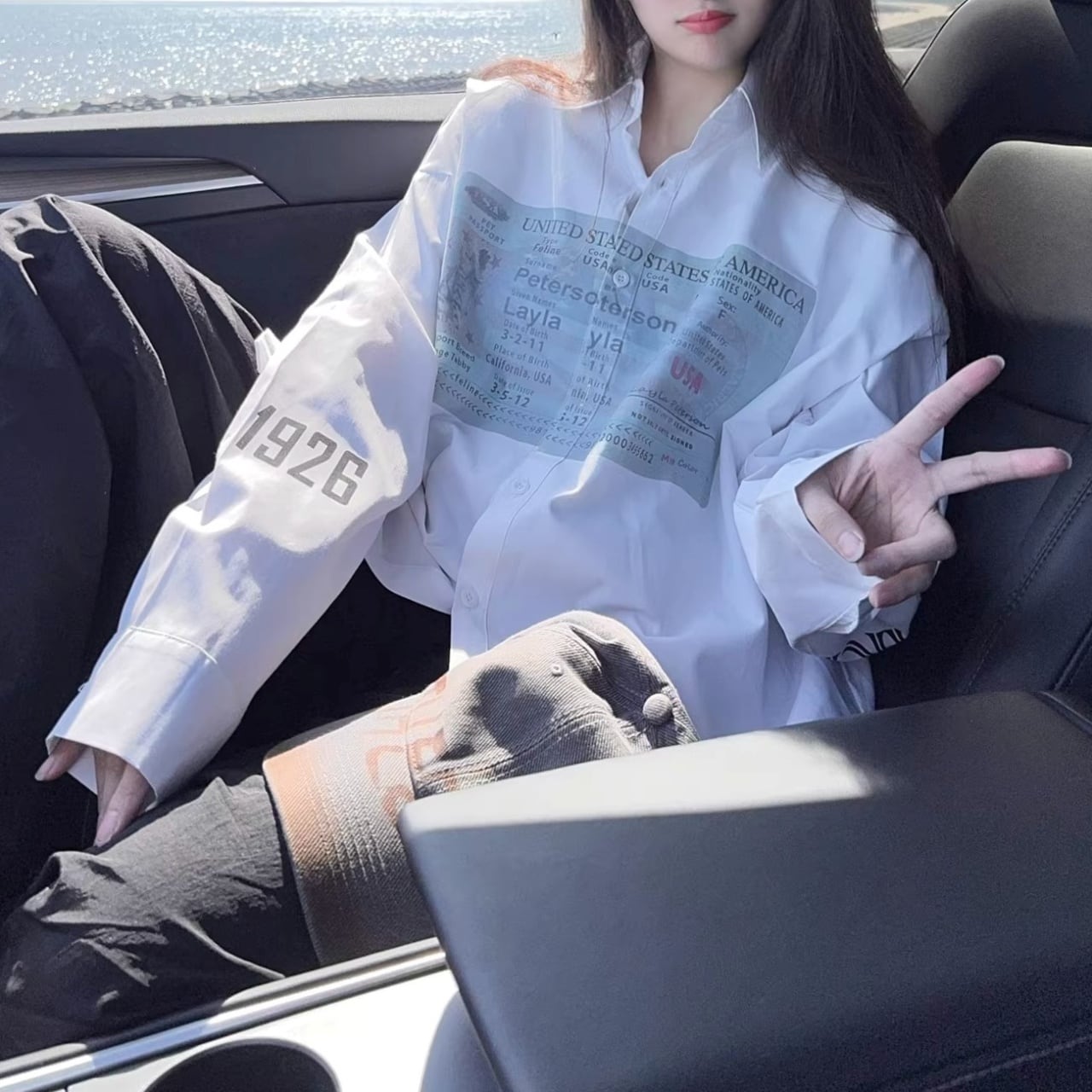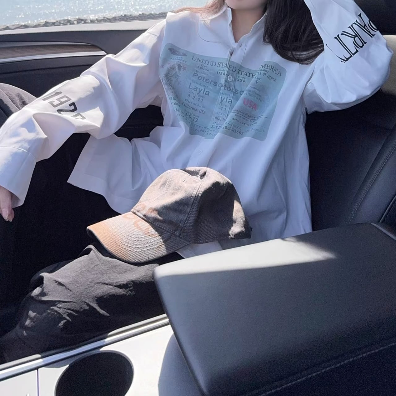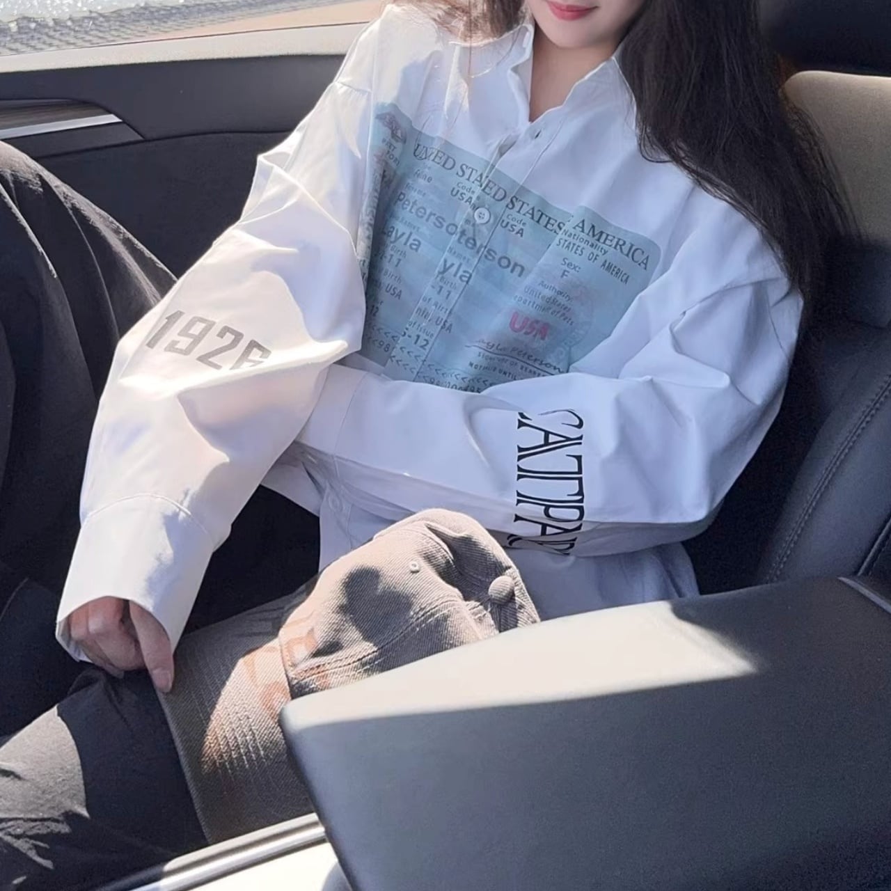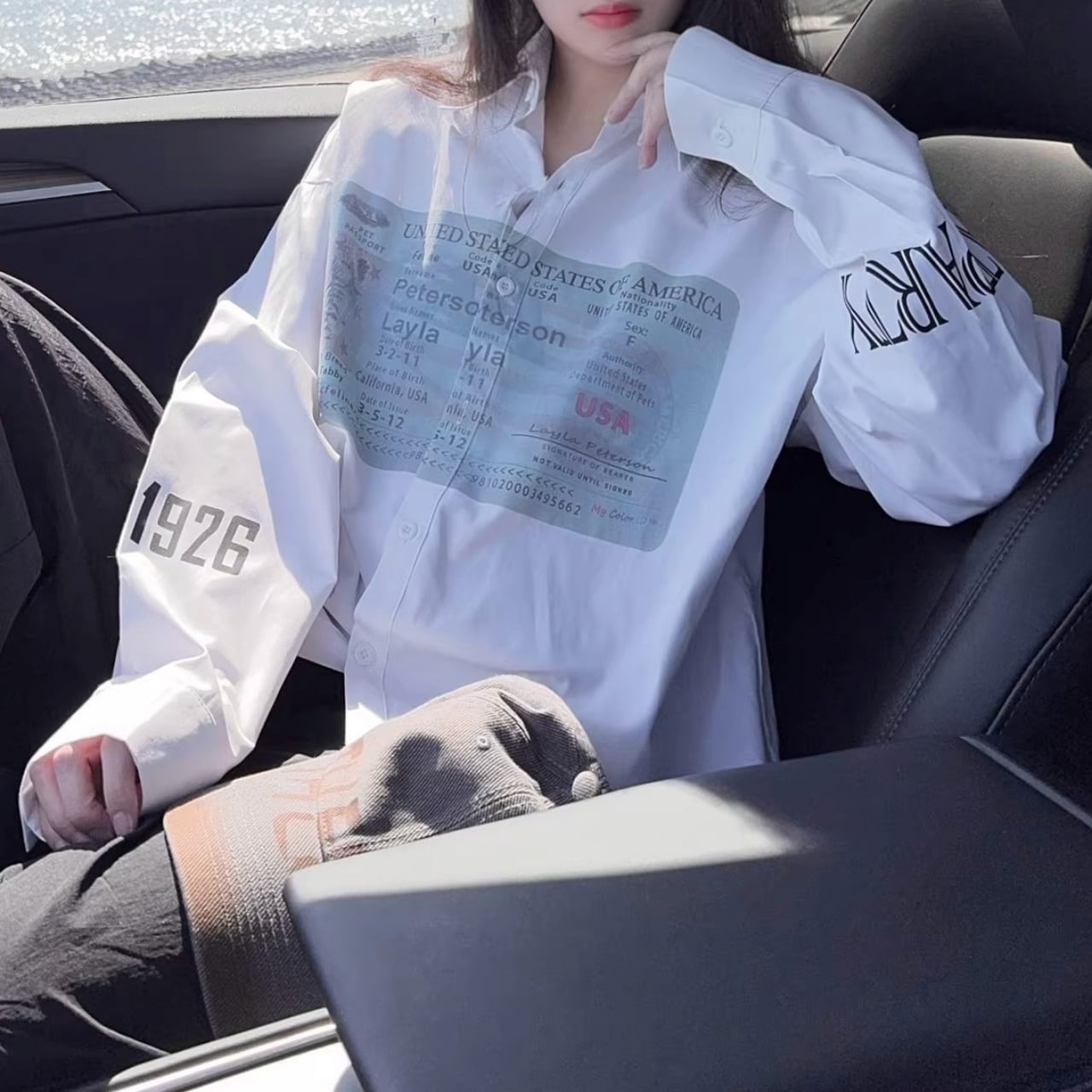 大胆なパスポート風のグラフィックが目を引く、遊び心溢れる1着。