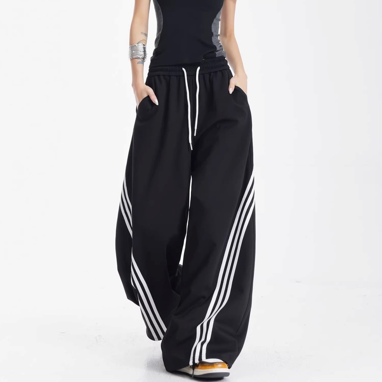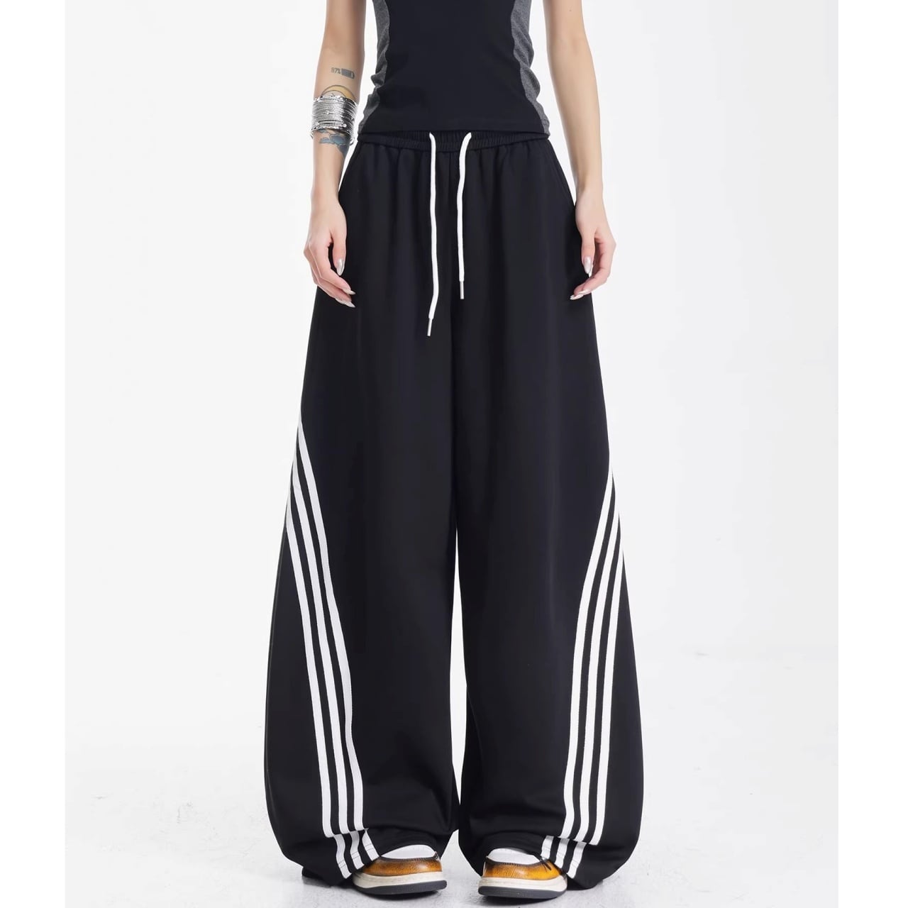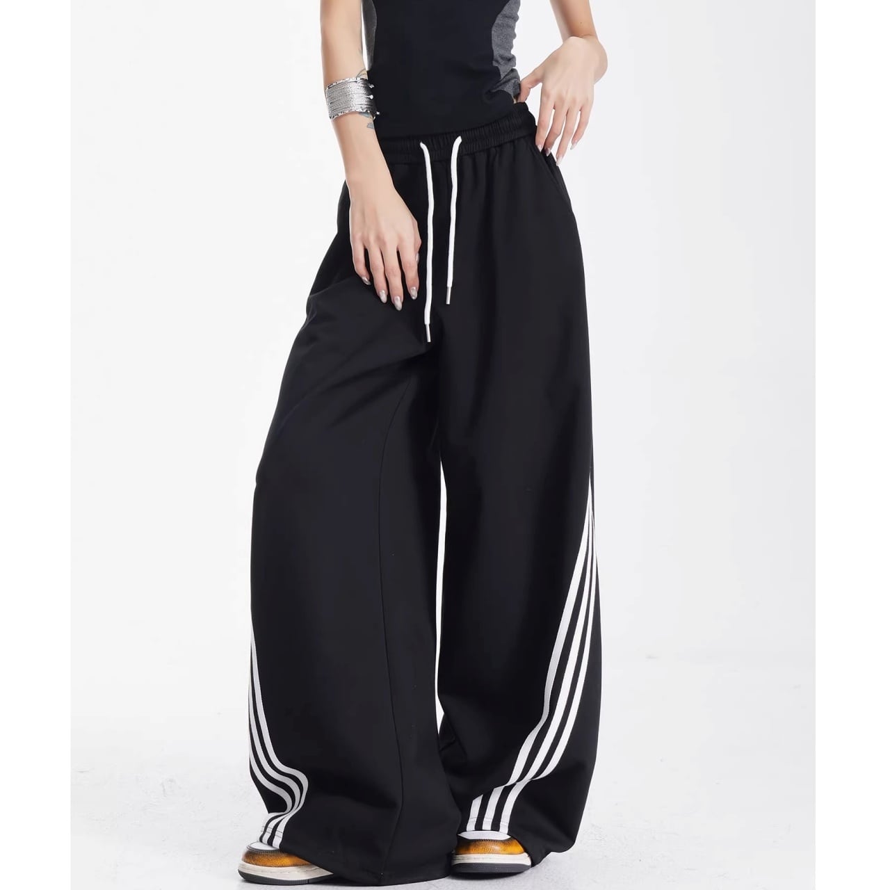 サイドからフロントへと流れるような曲線を描く3連ラインが、圧倒的な存在感を放つワイドパンツ。