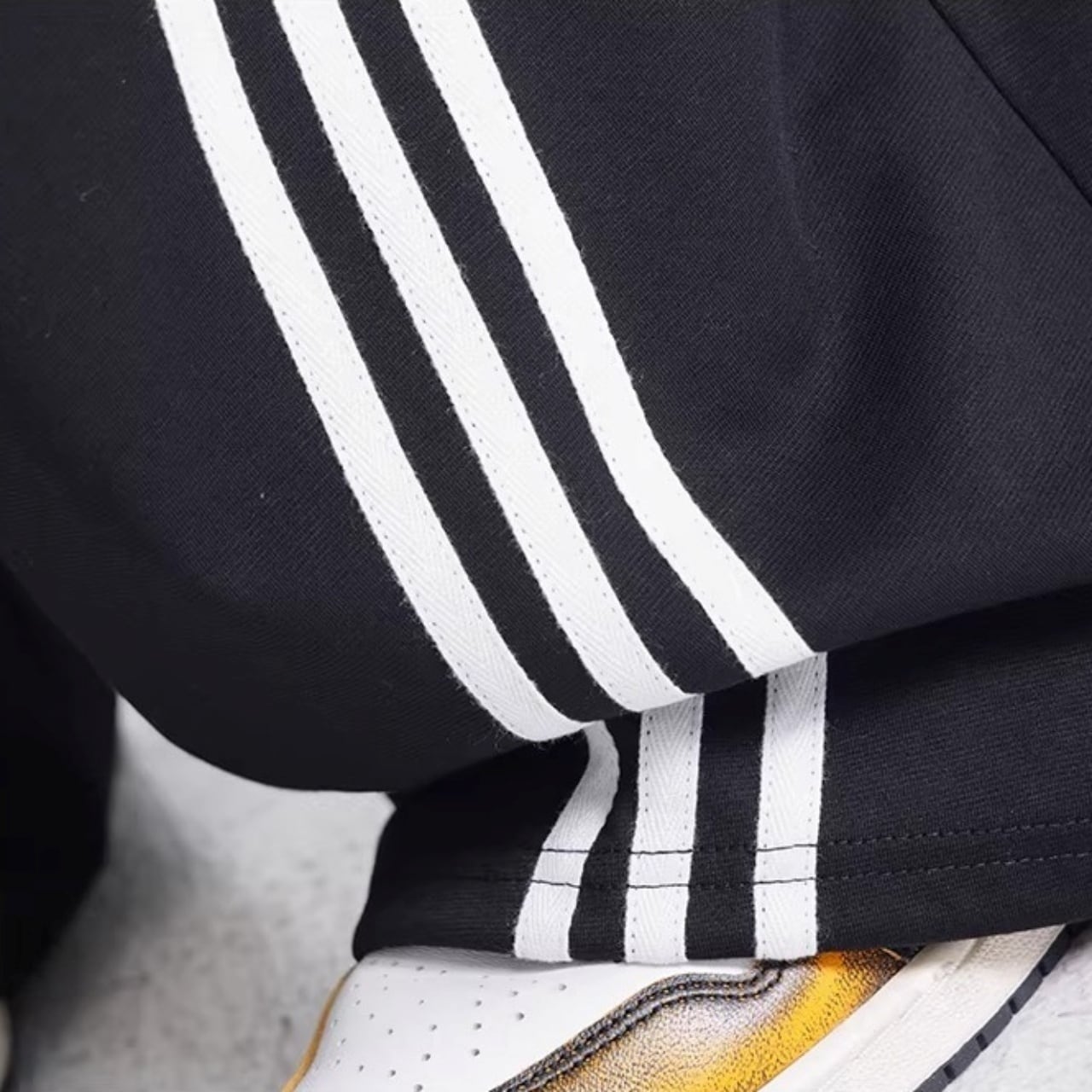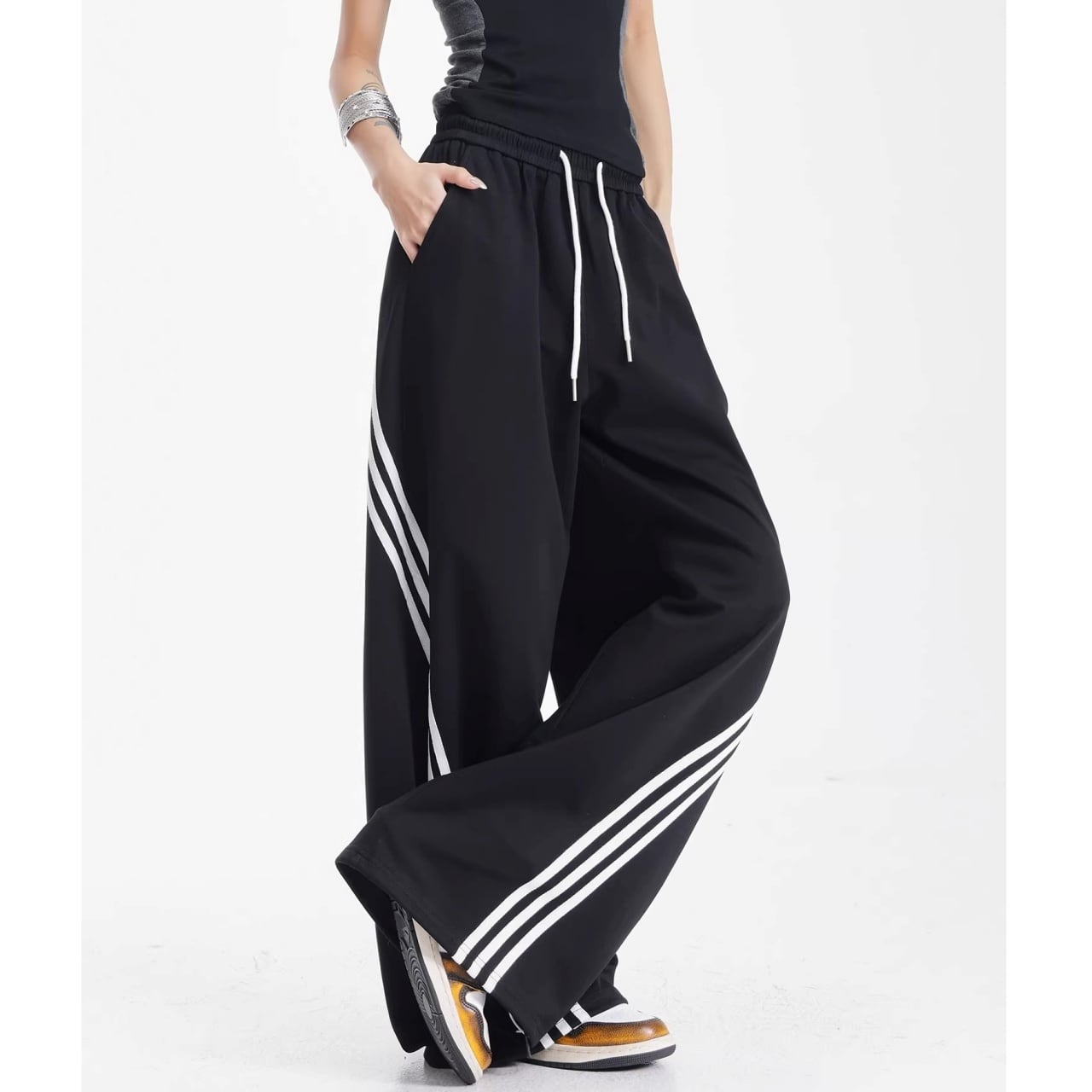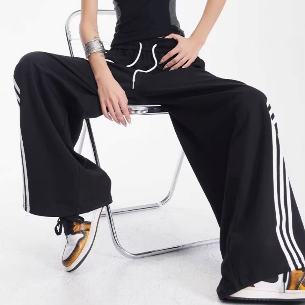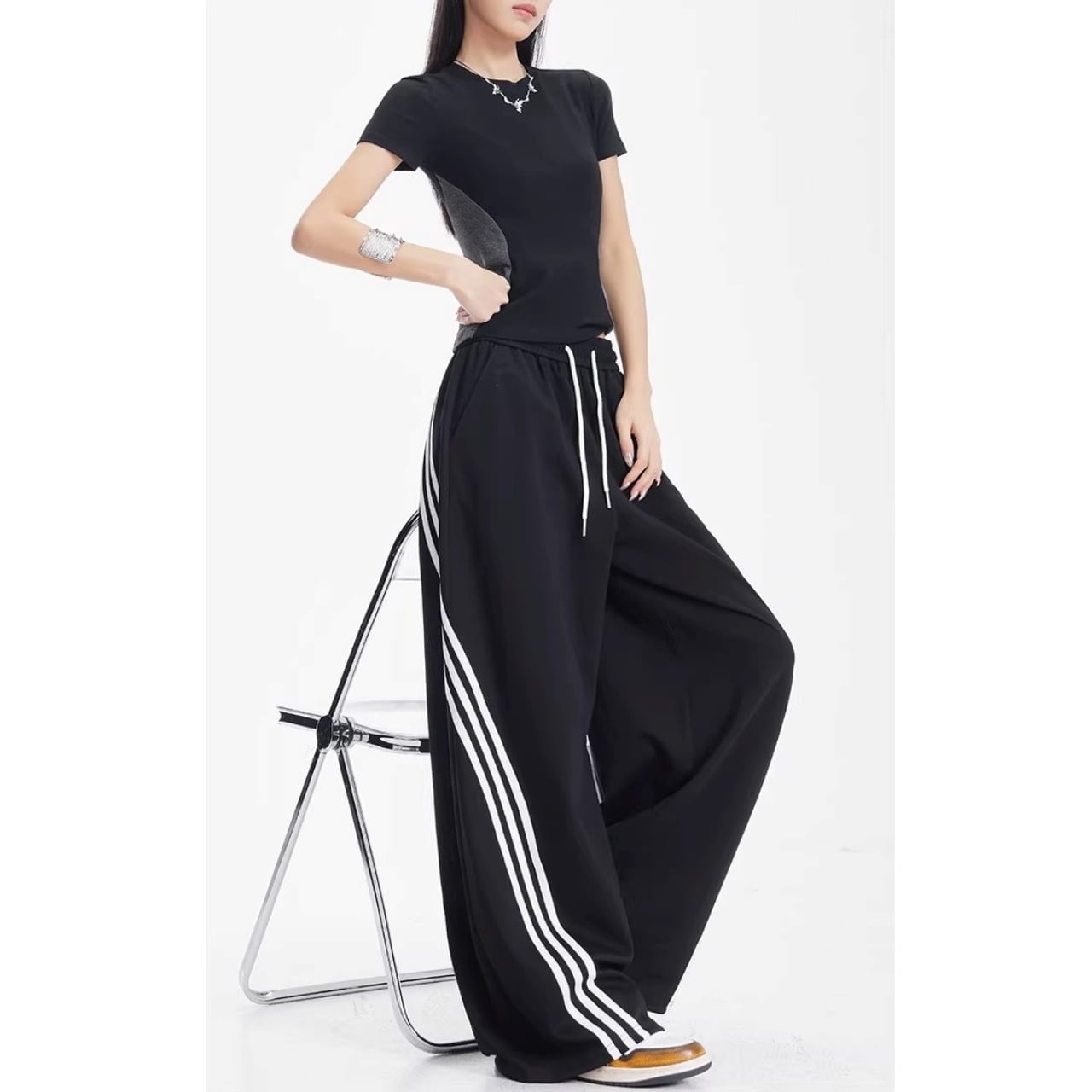 サイドからフロントへと流れるような曲線を描く3連ラインが、圧倒的な存在感を放つワイドパンツ。