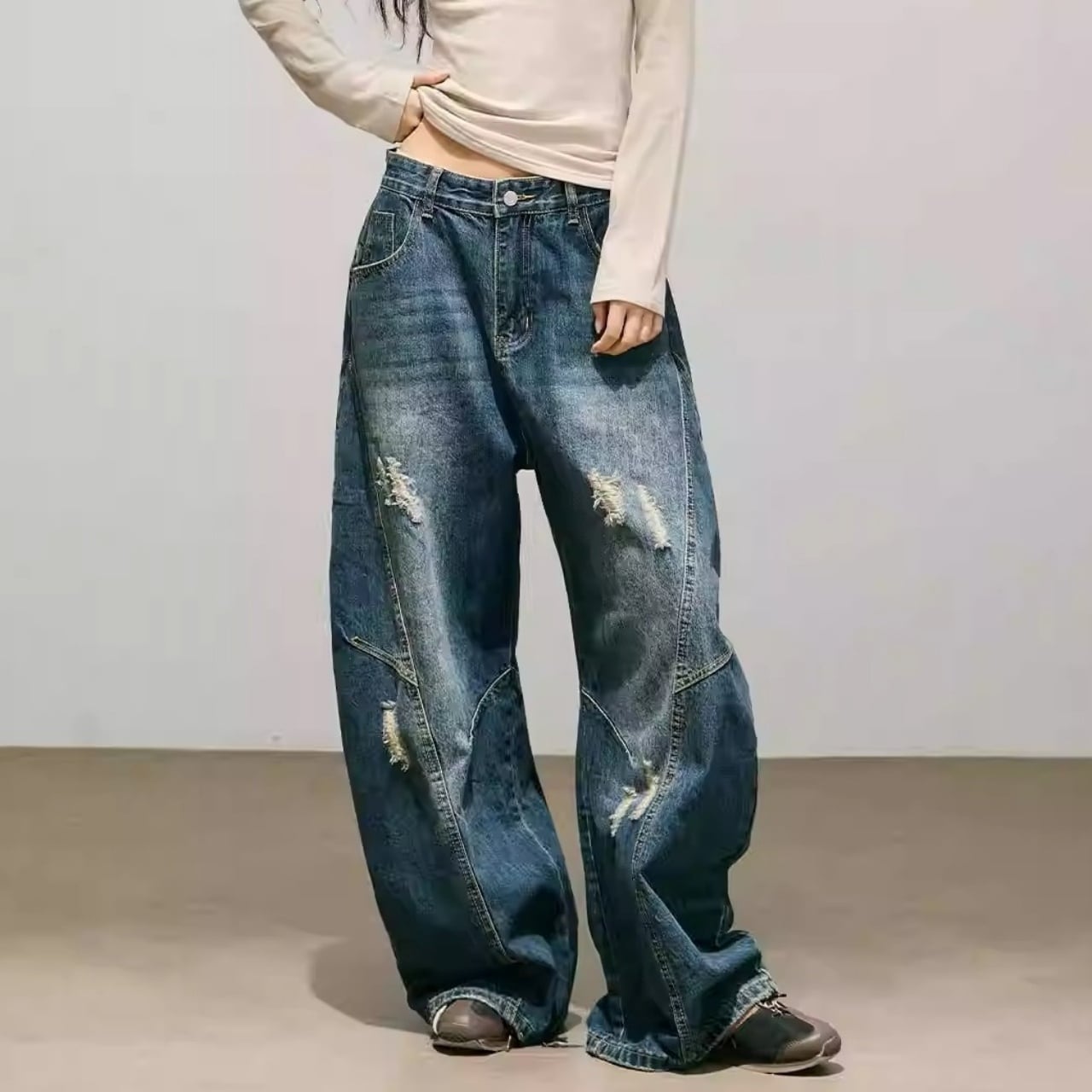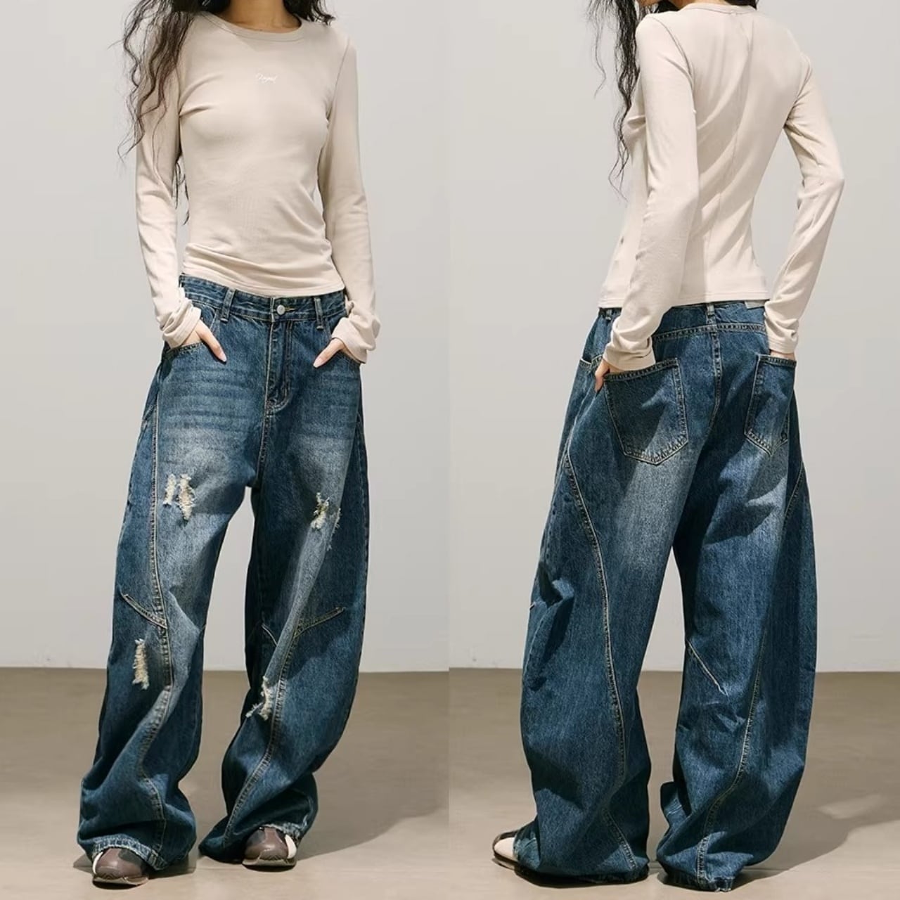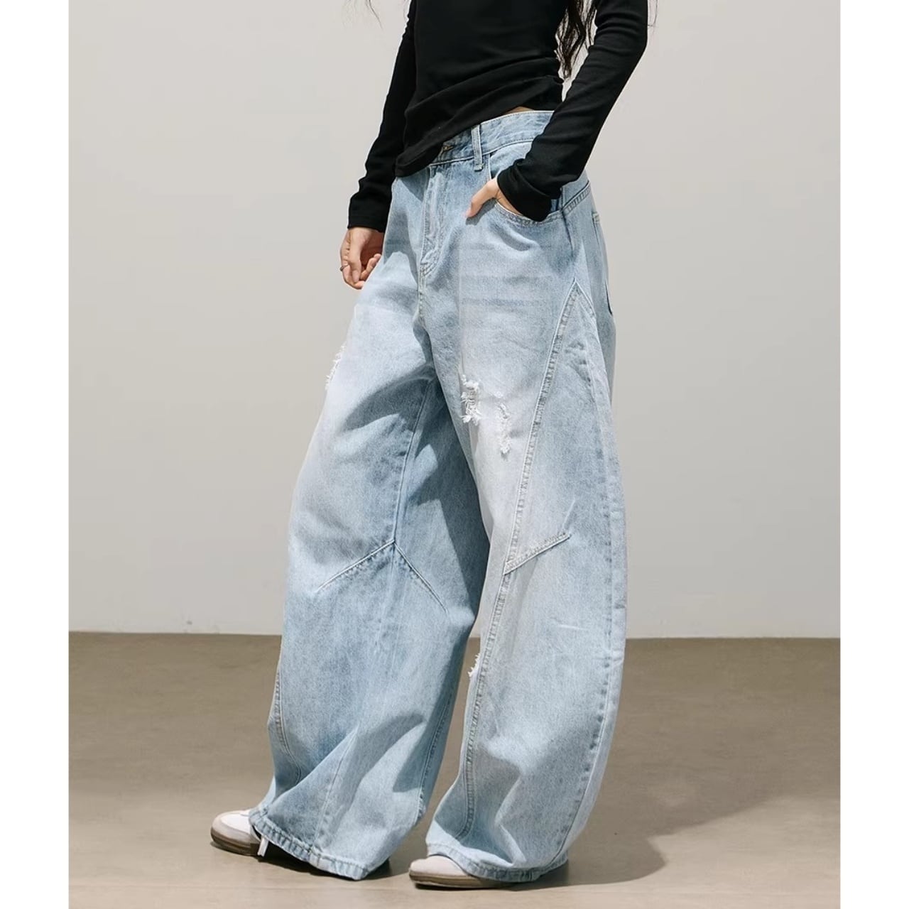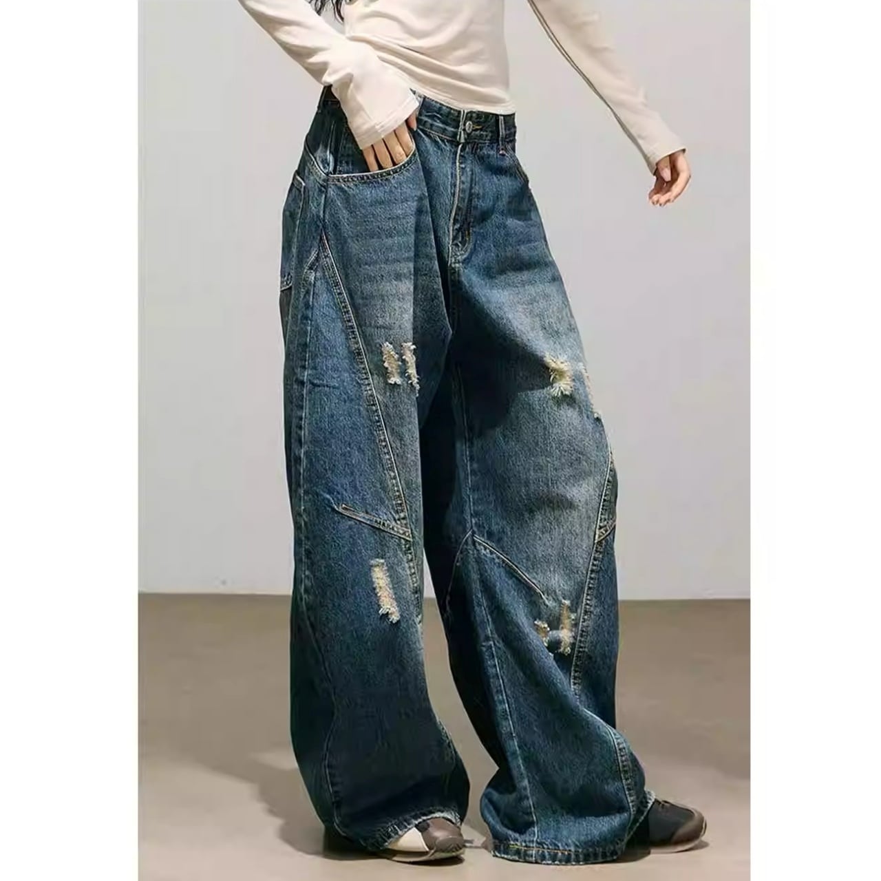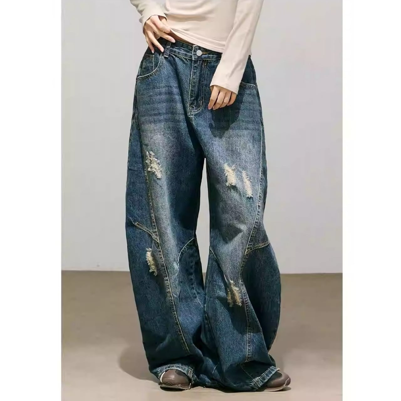 パネルデザインダメージカーブデニムパンツ 2col R01870
