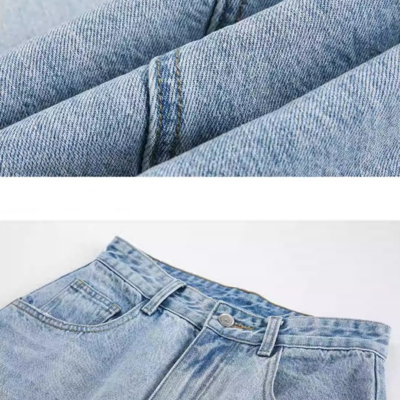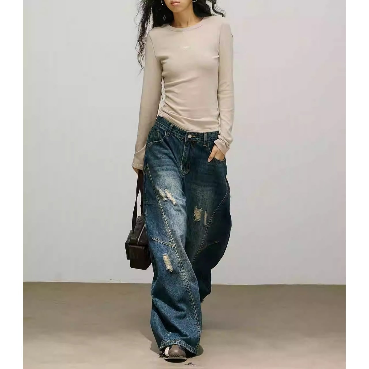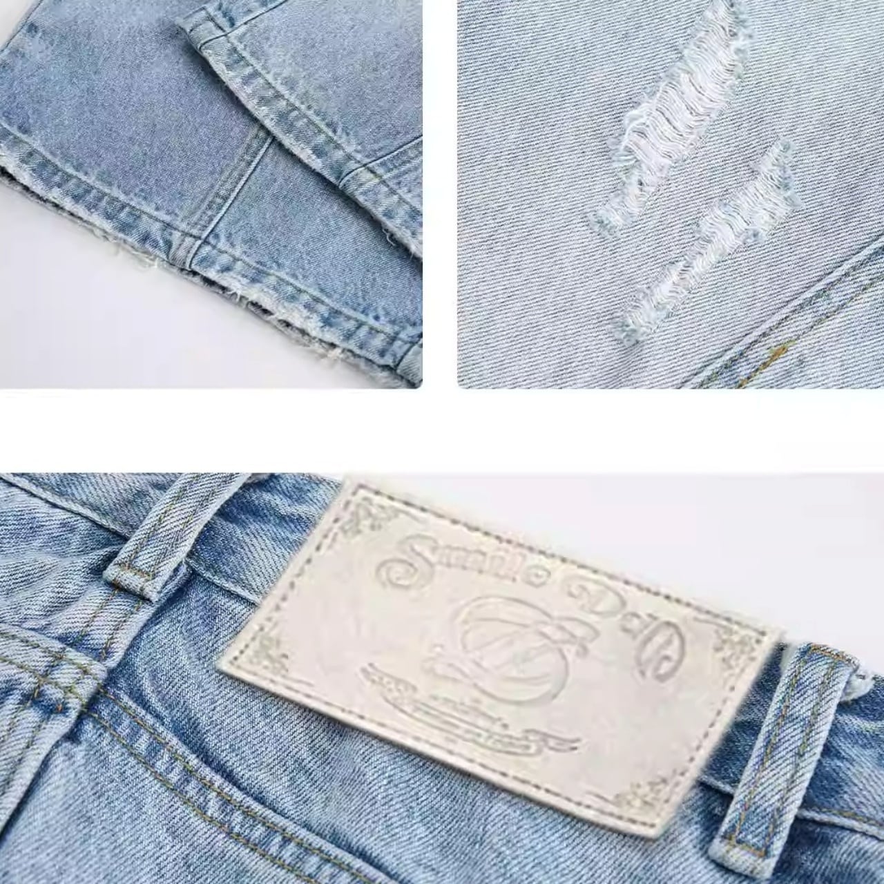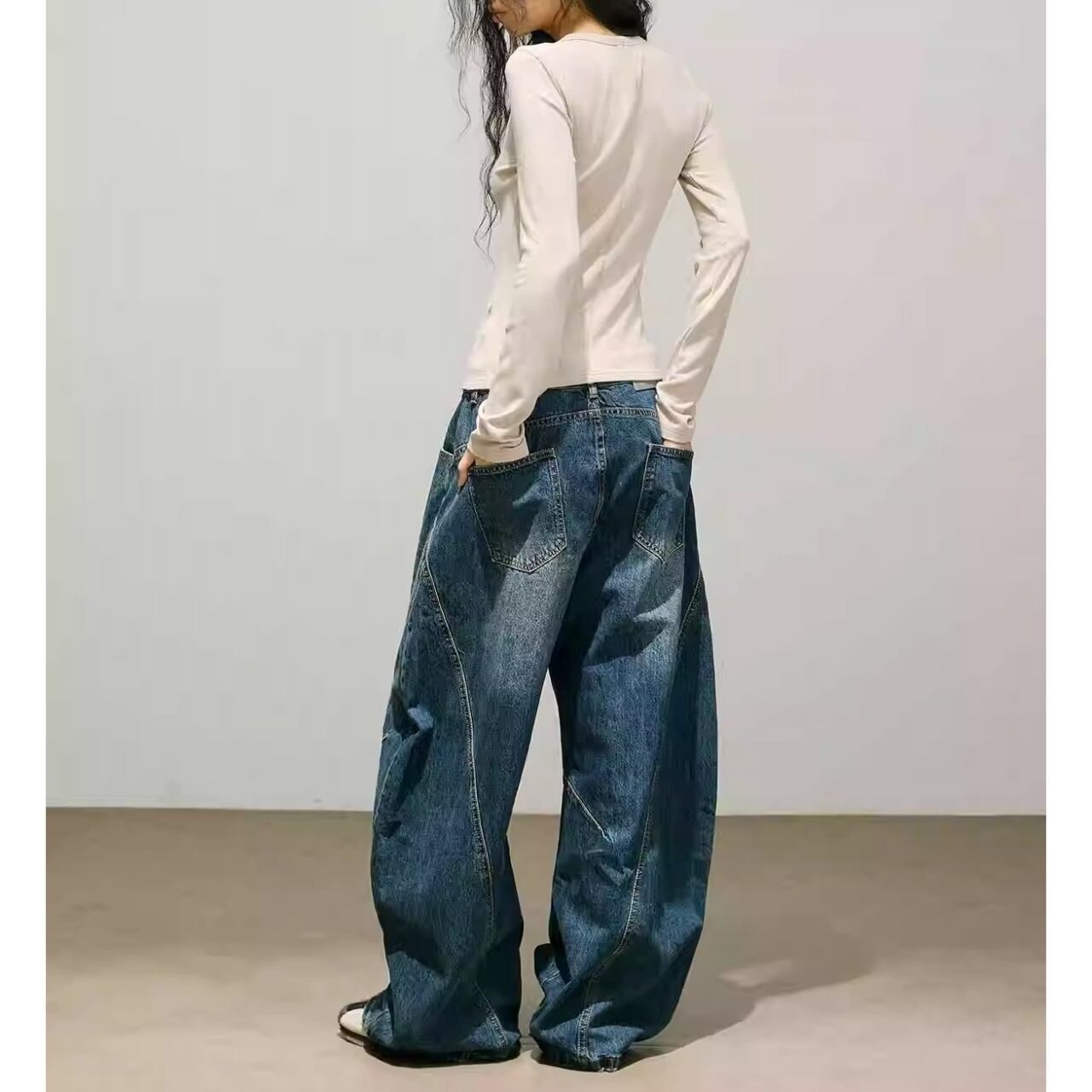カーブを描くステッチラインと、ダメージのディテールが目を引く1着です。