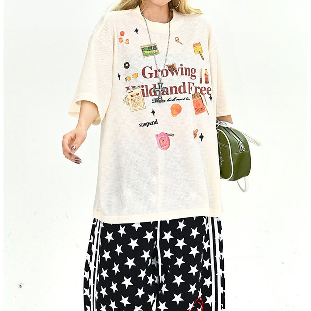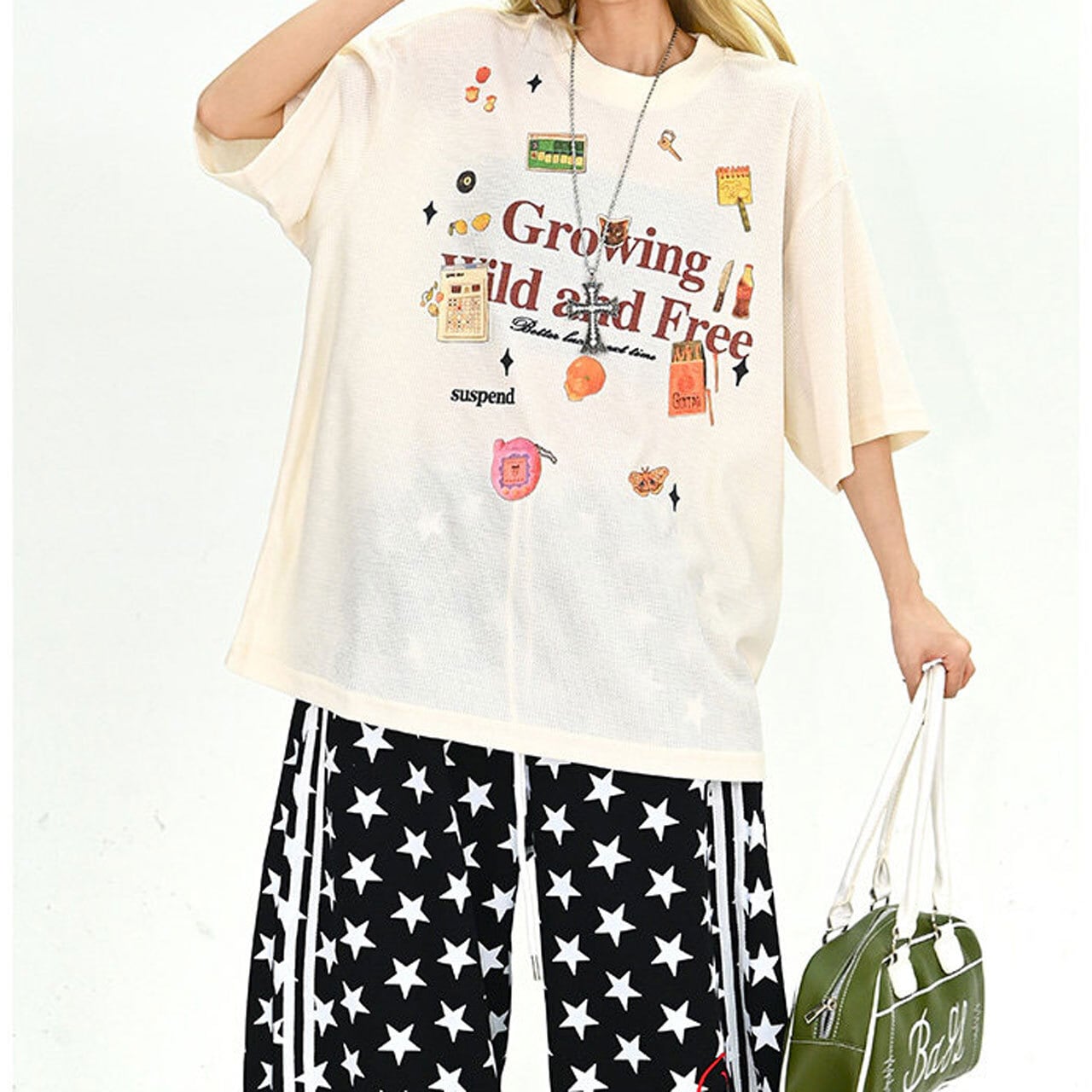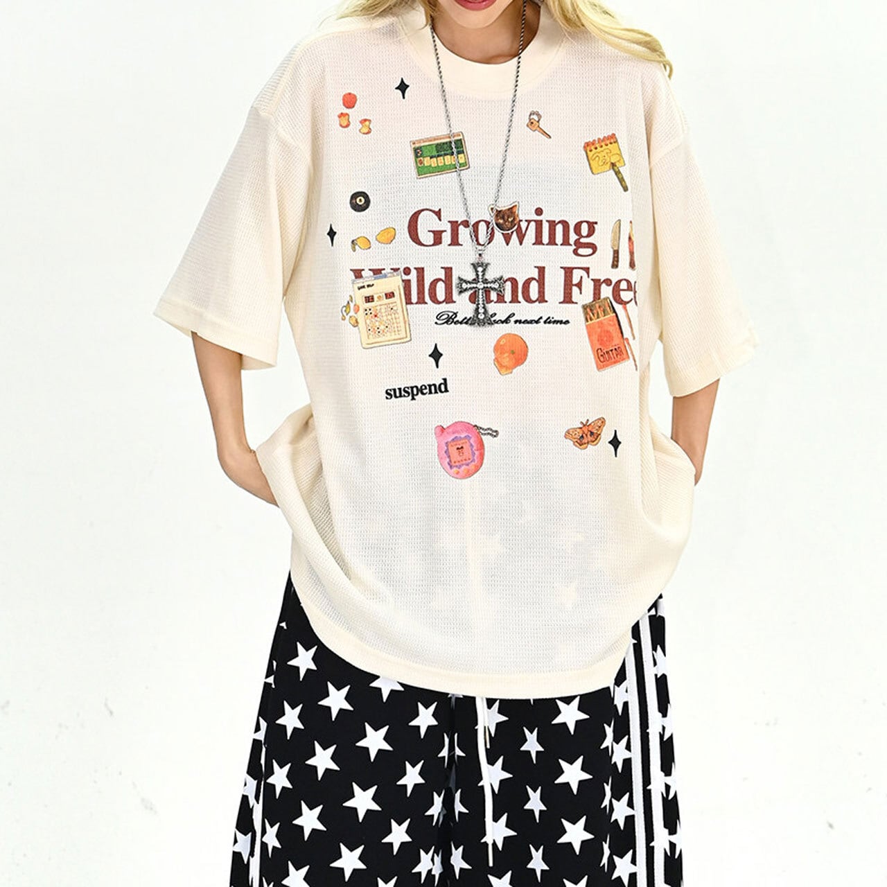 フロントには存在感のあるグラフィックと繊細なディテールが混ざり合い、ストリート感漂う絶妙なニュアンスを演出します。