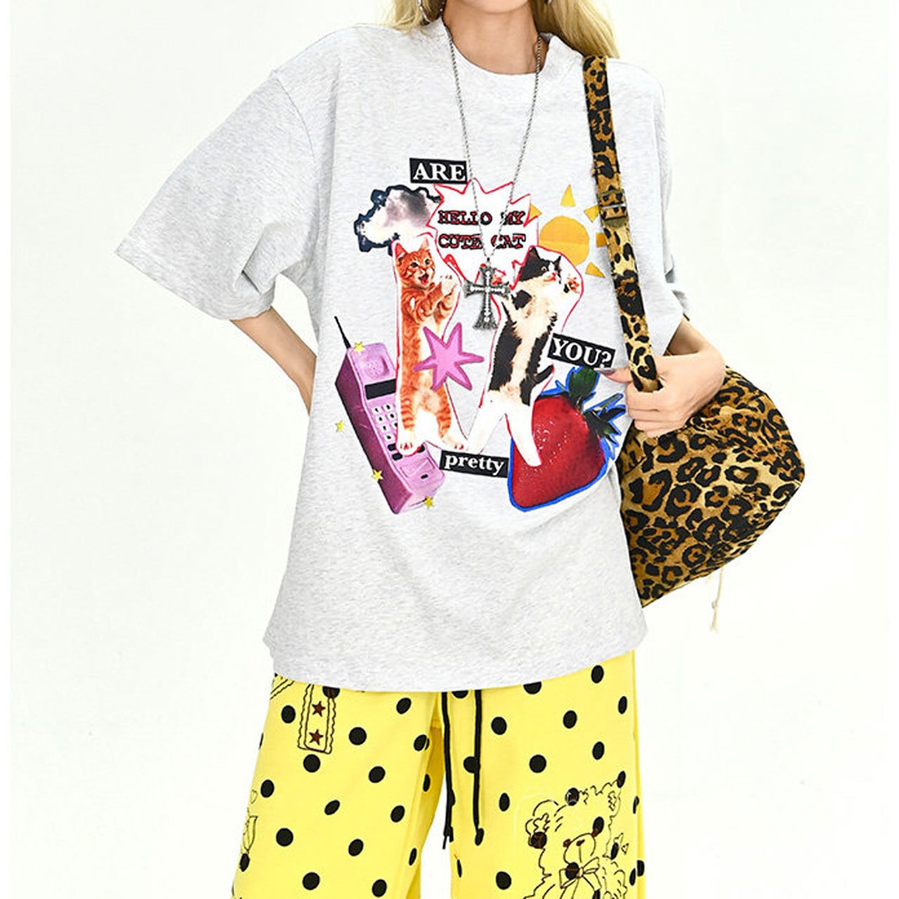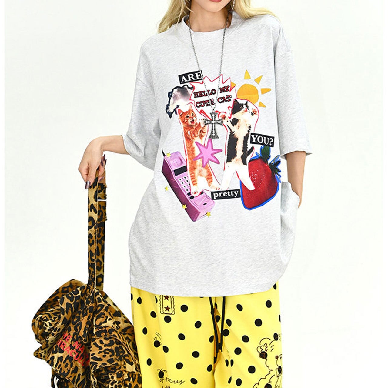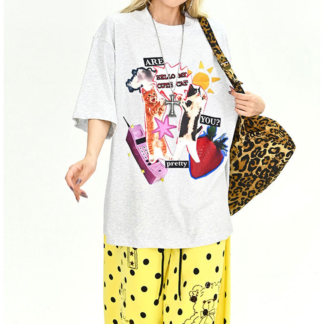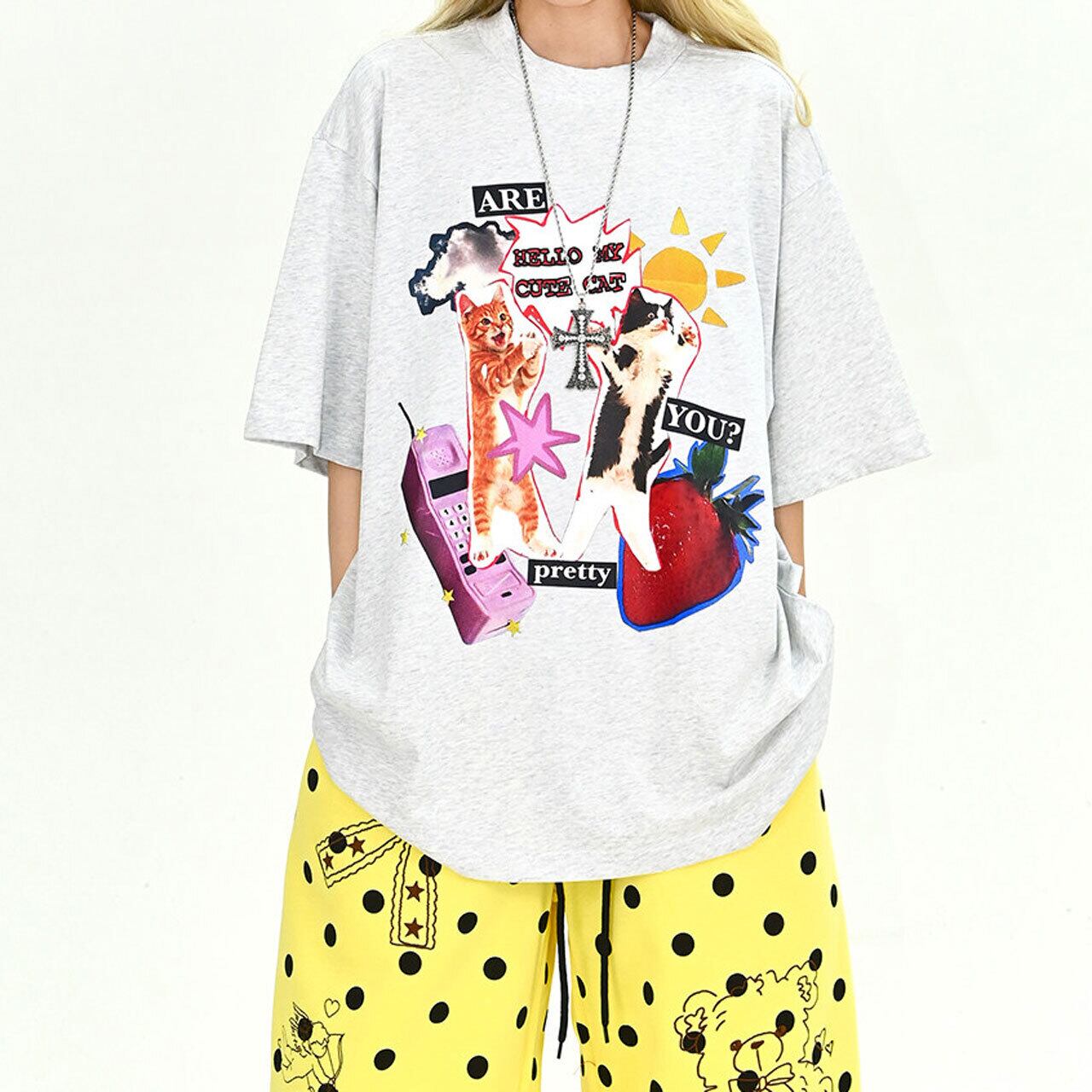 ファンシーアニマルコラージュグラフィックルーズTシャツ 2col R01900