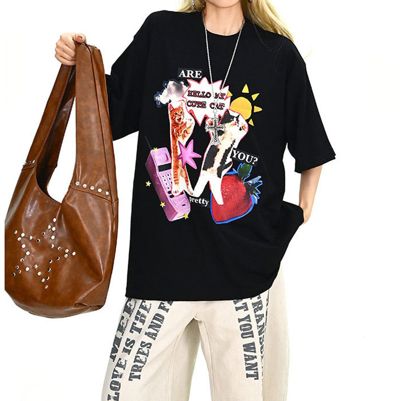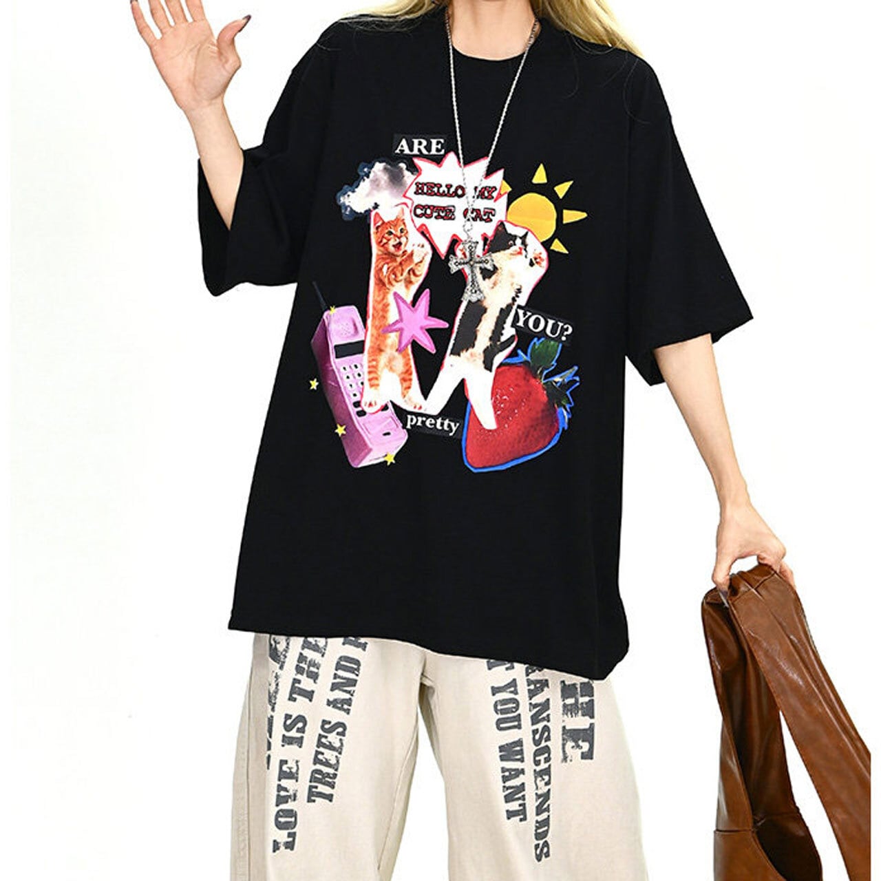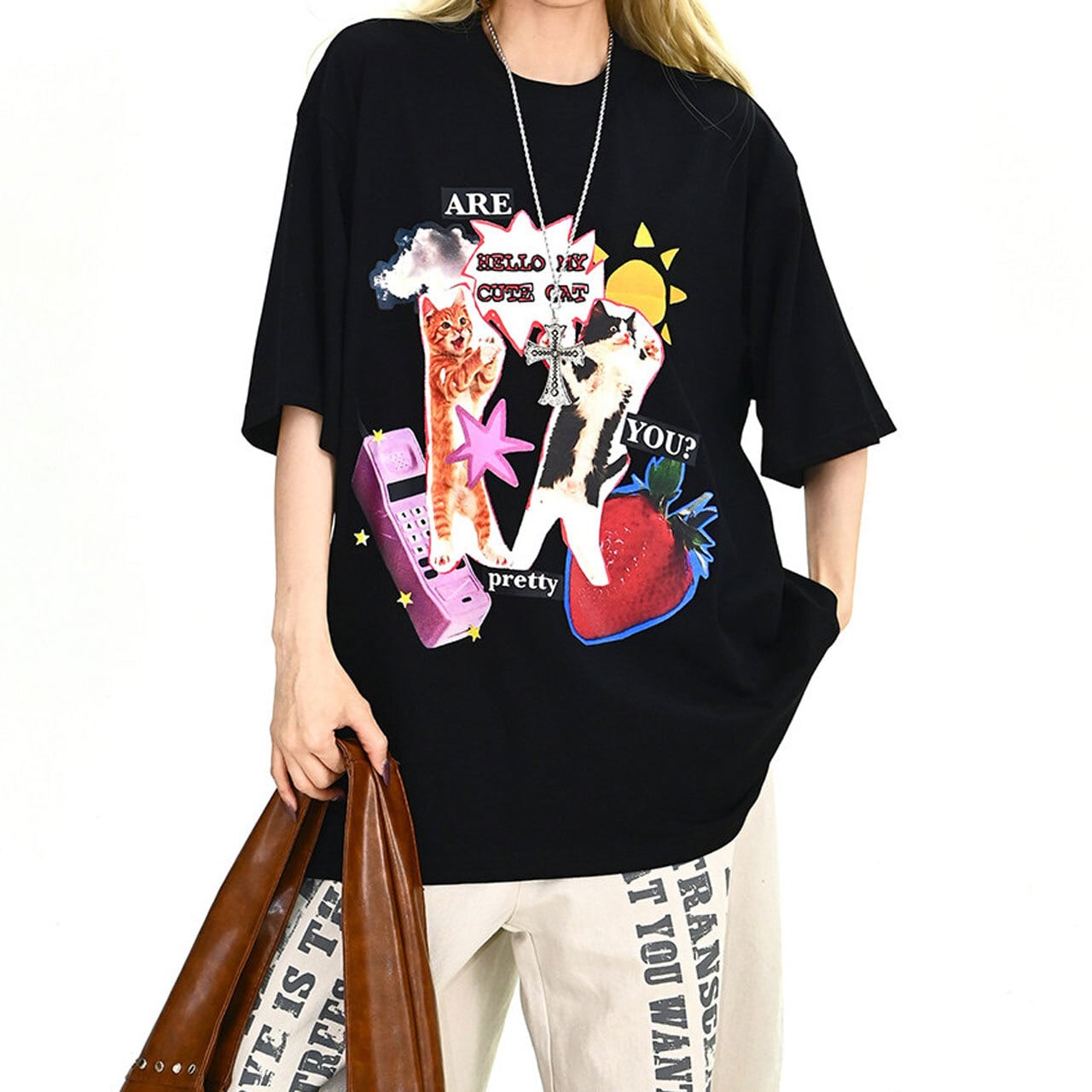 コラージュ風のデザインがフロントで強烈な個性を放ち、ストリートシーンでの視線を独占します。