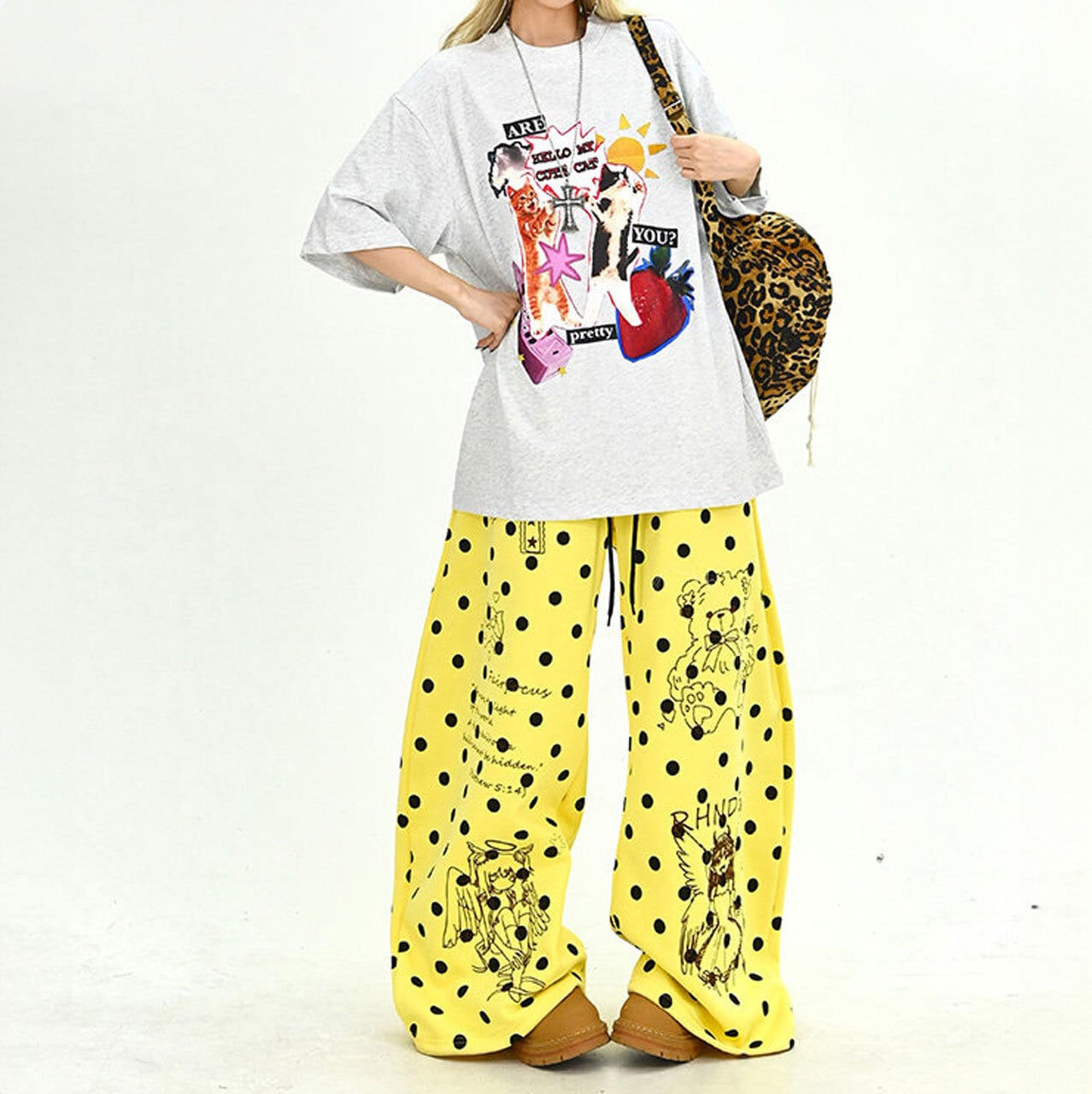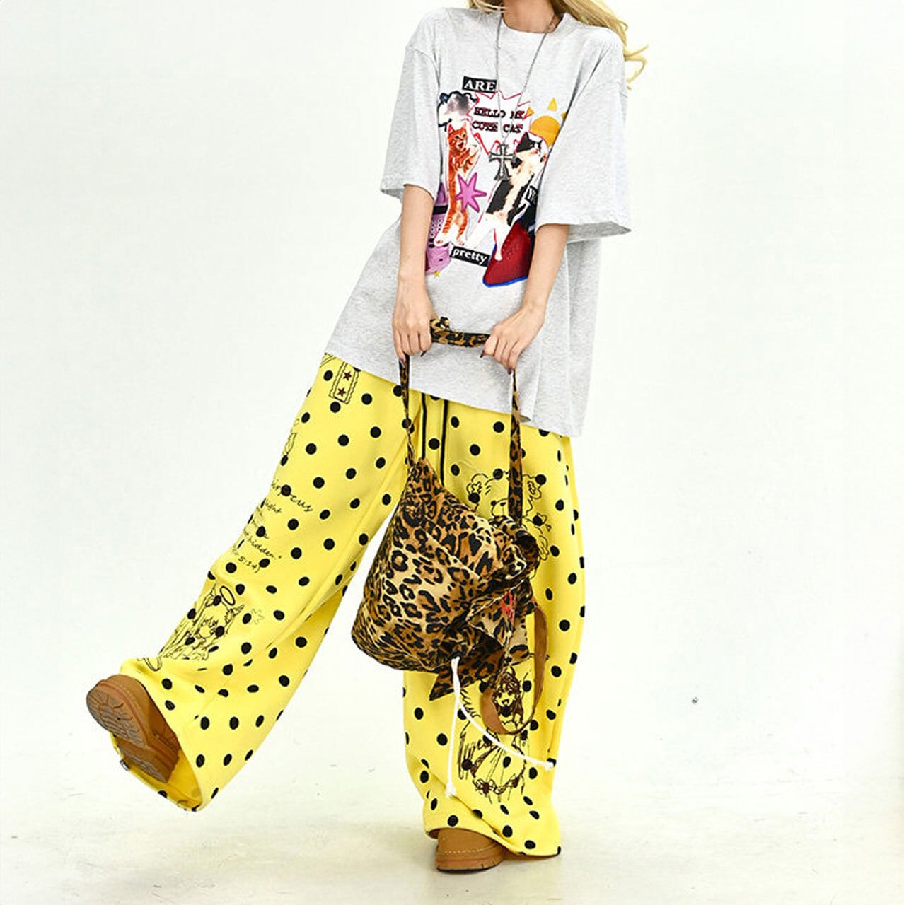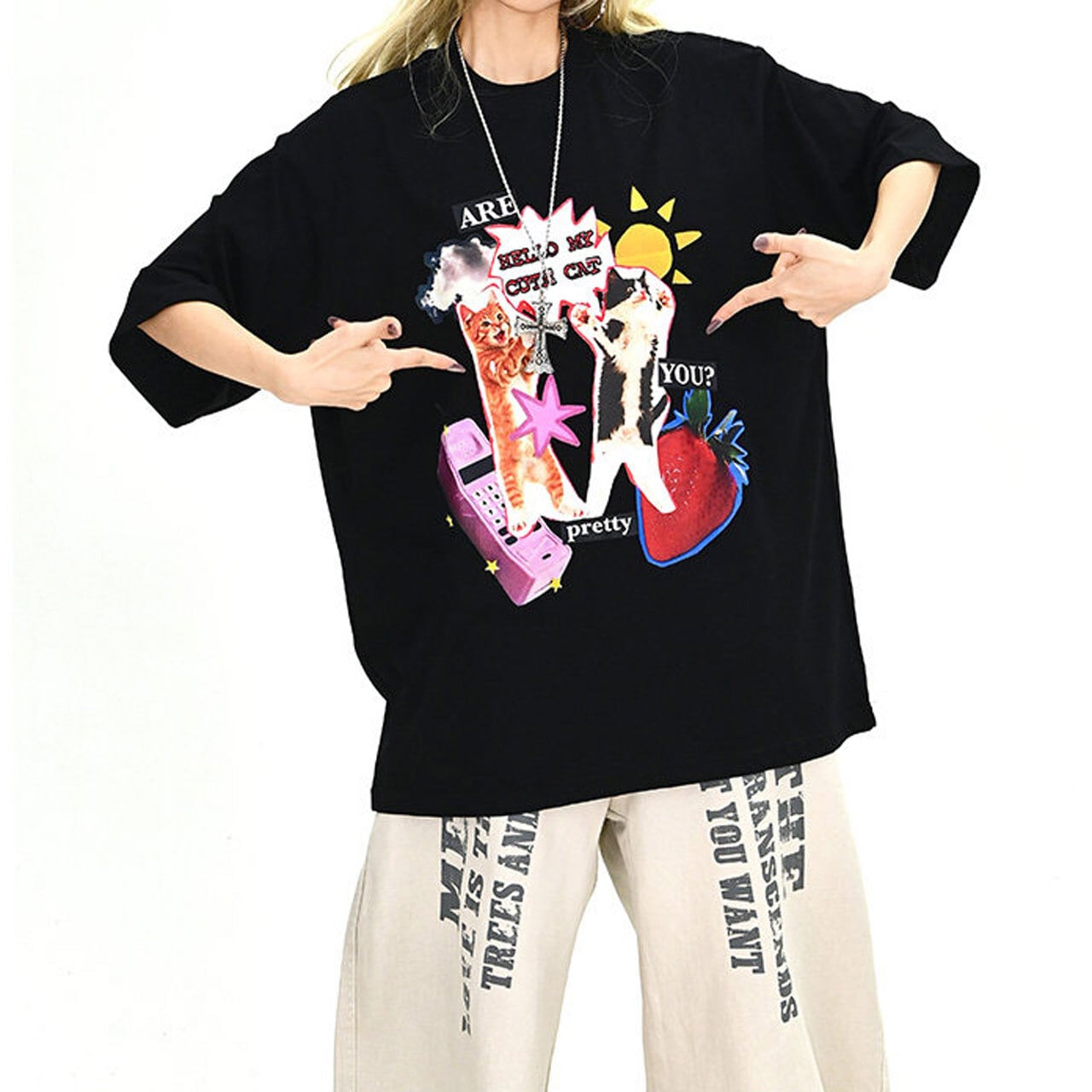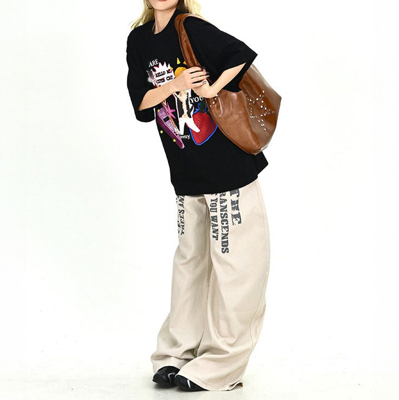コラージュ風のデザインがフロントで強烈な個性を放ち、ストリートシーンでの視線を独占します。