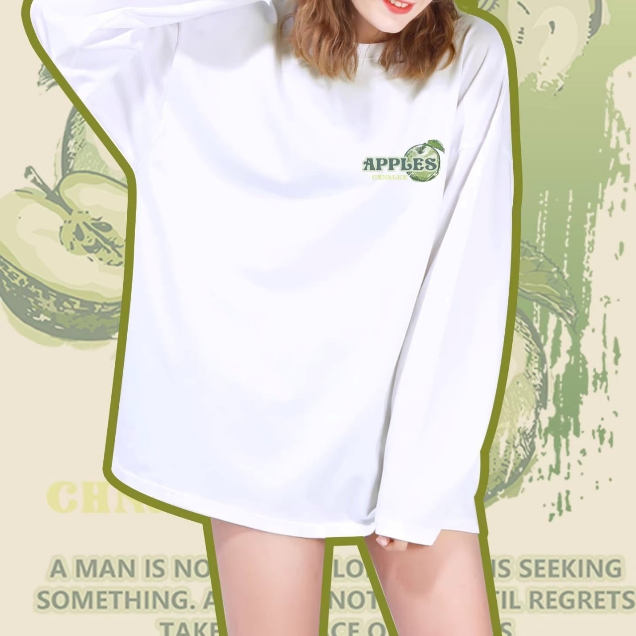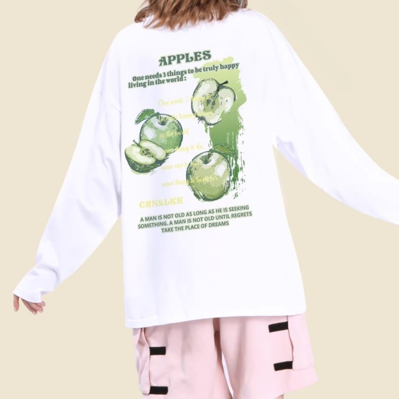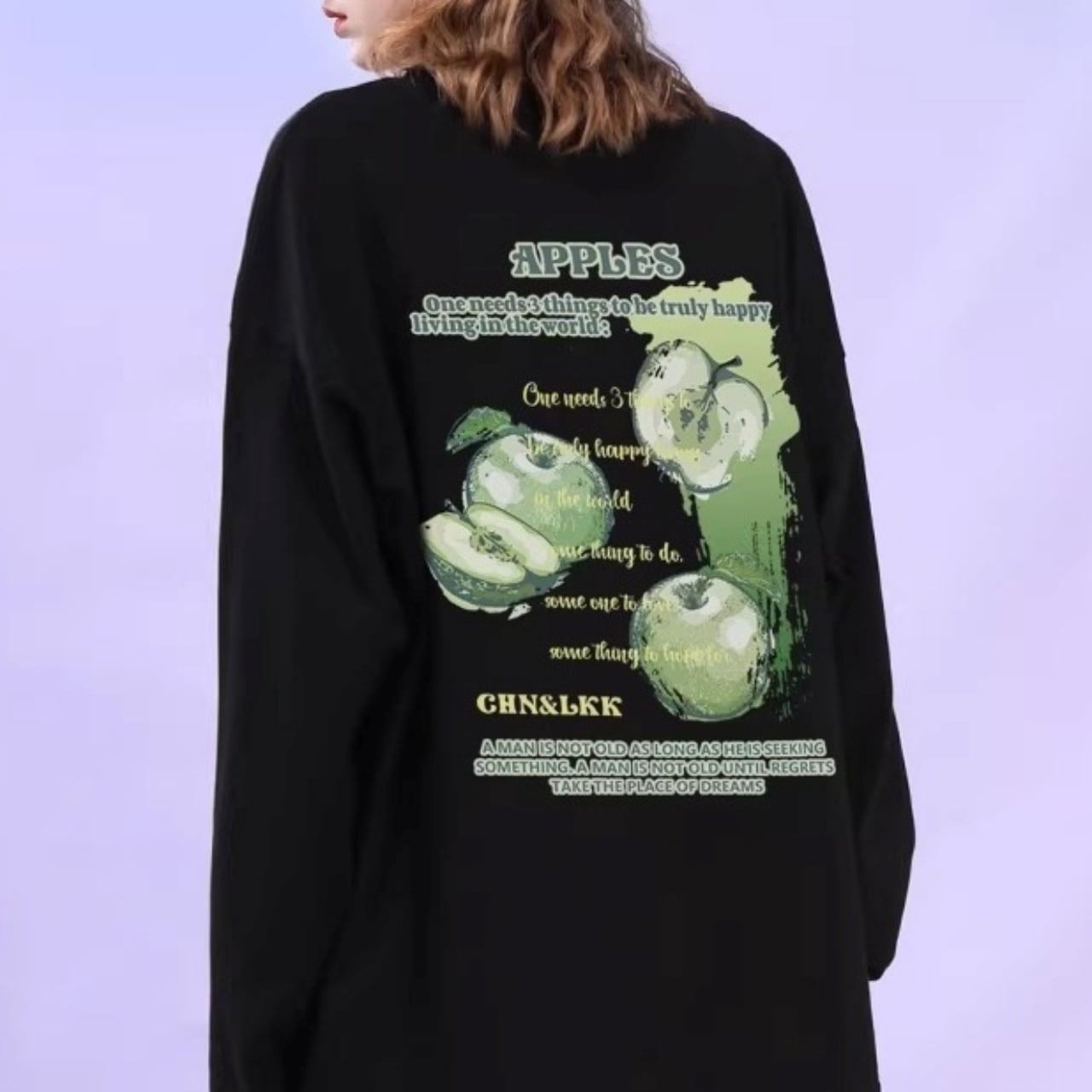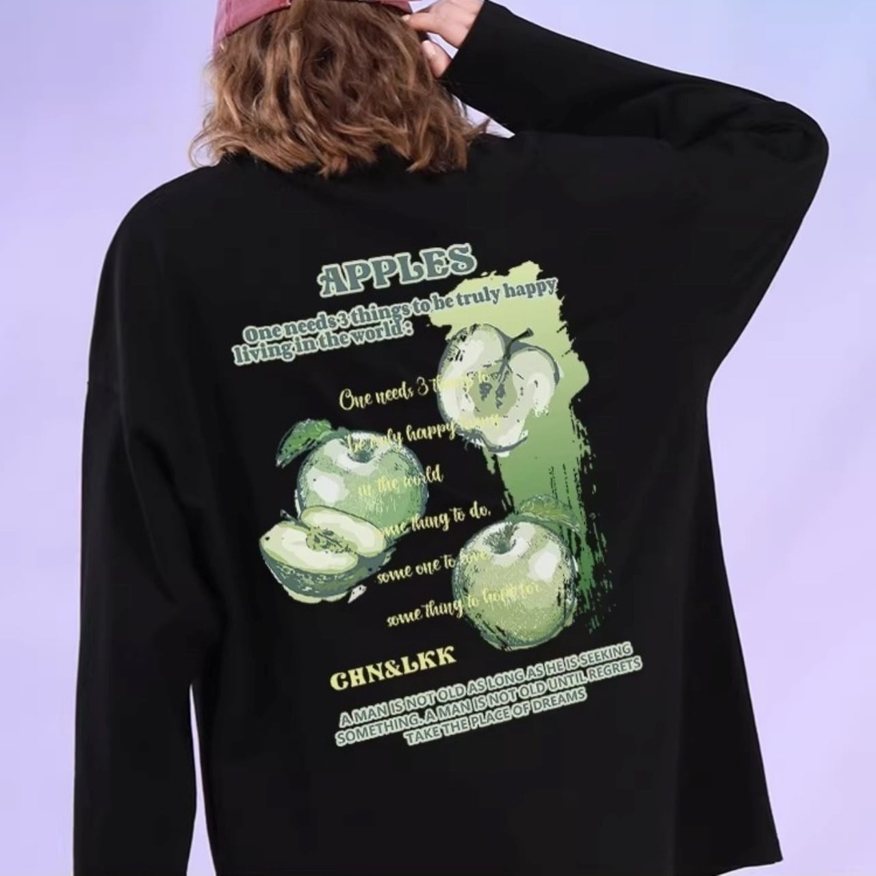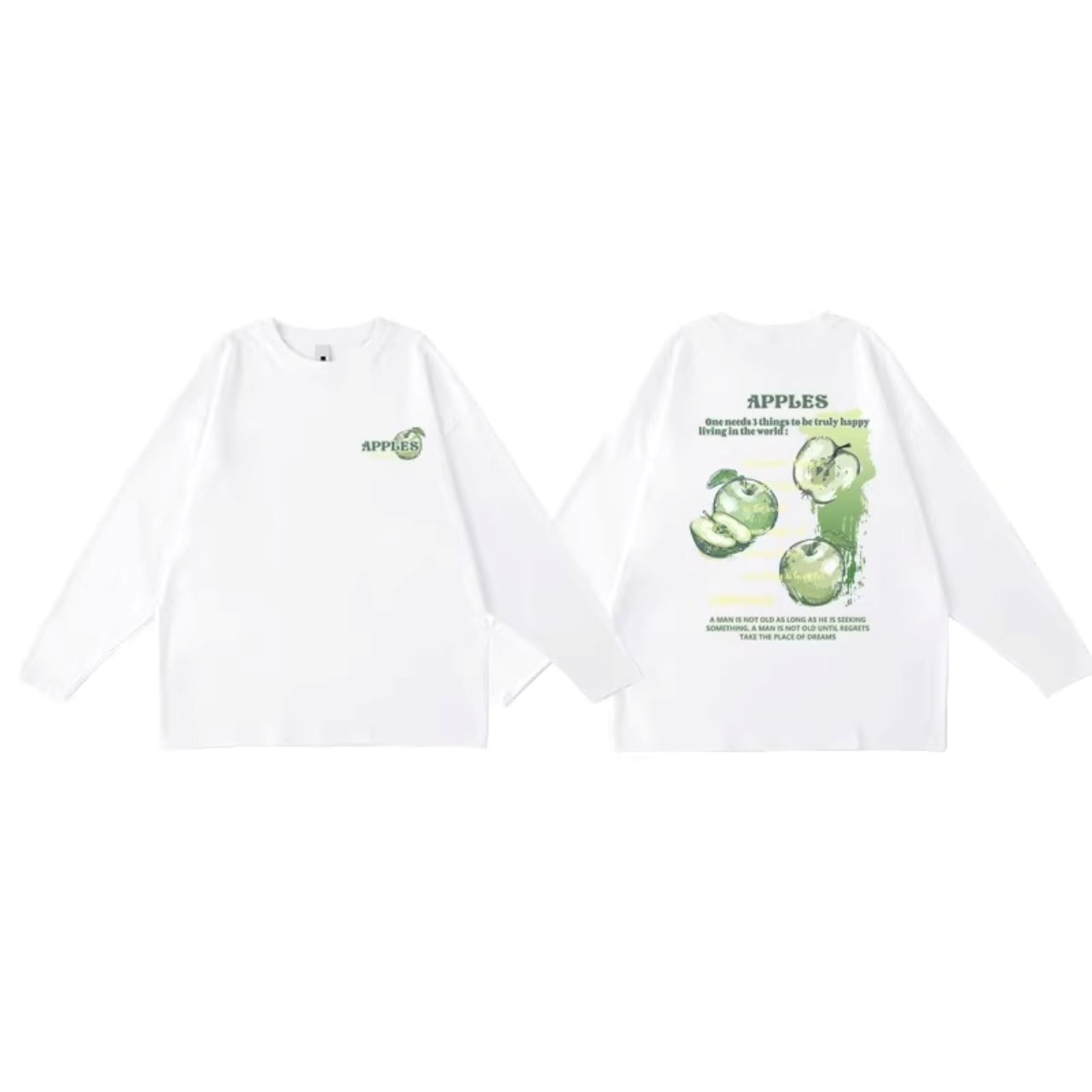 バックにプリントされたリンゴのグラフィックが目を引く、ロングスリーブTシャツ。