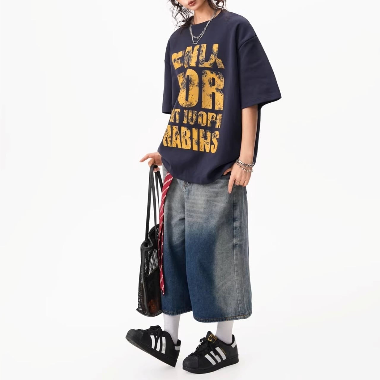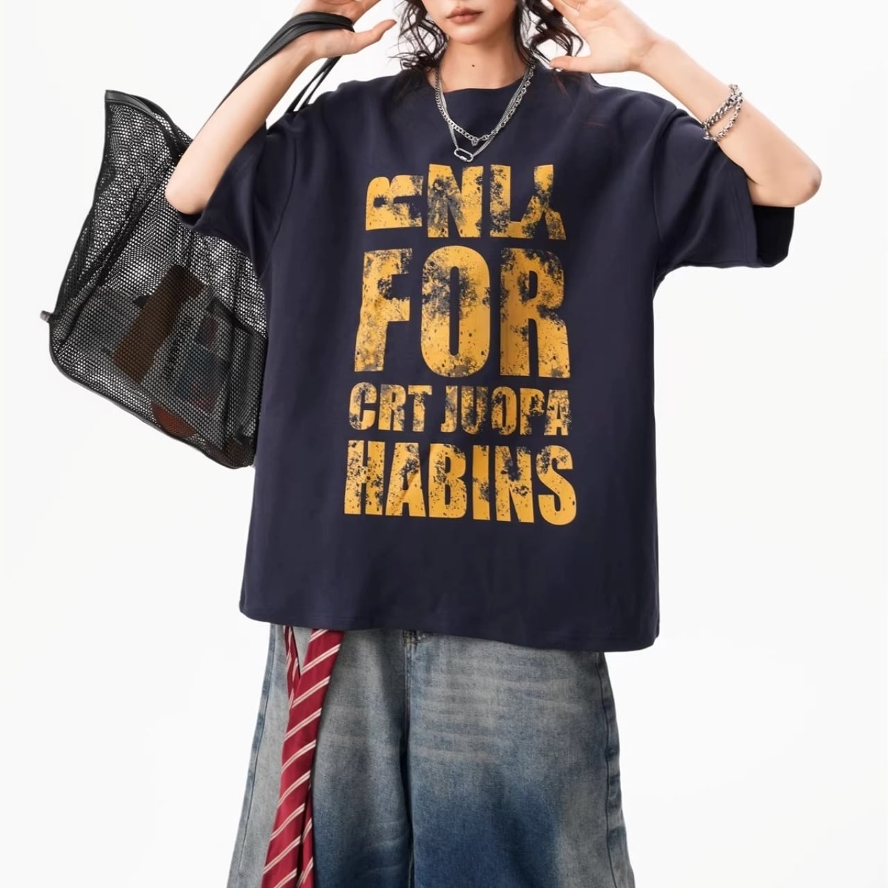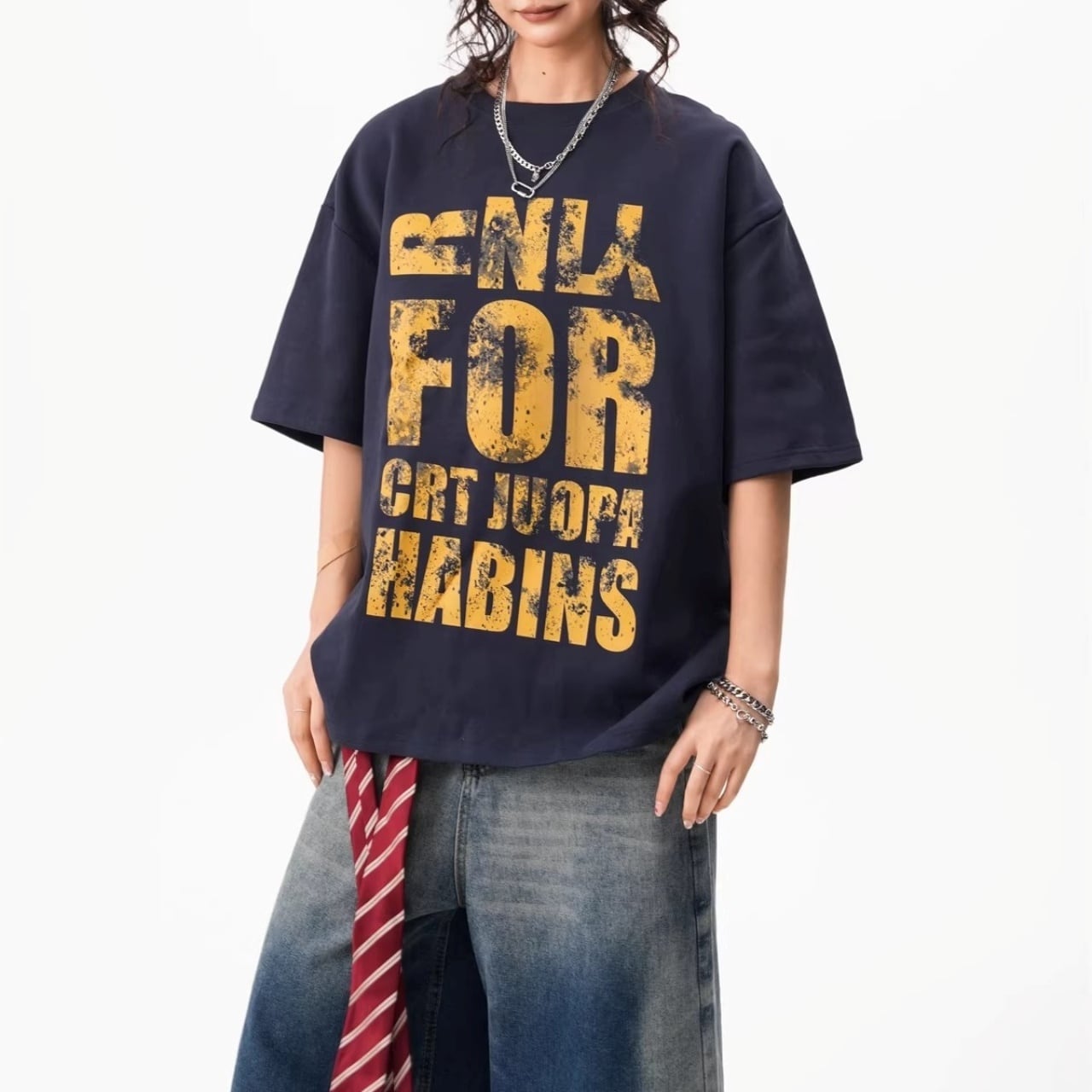 クラッシュダメージレタープリントハーフスリーブTシャツ 1col R01926