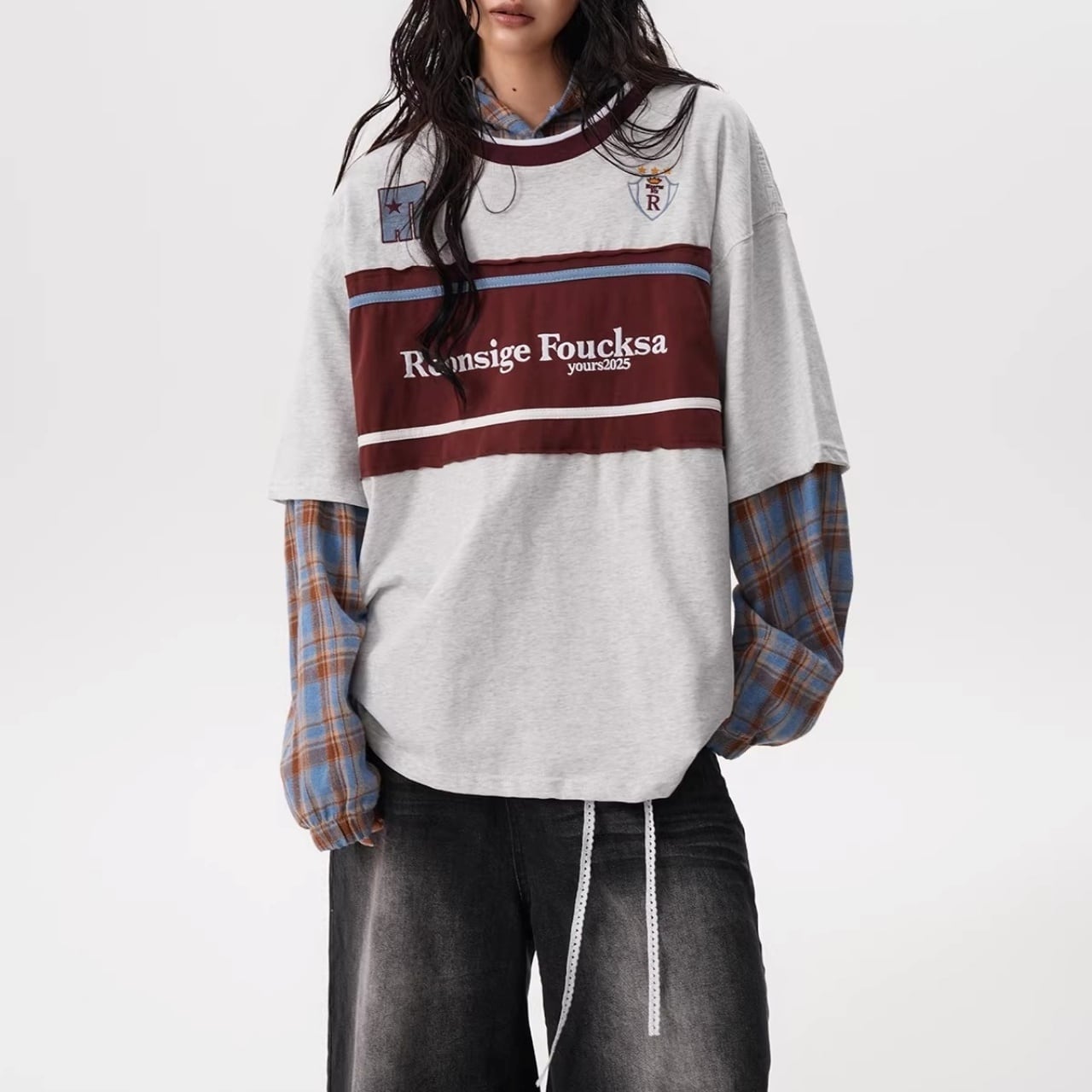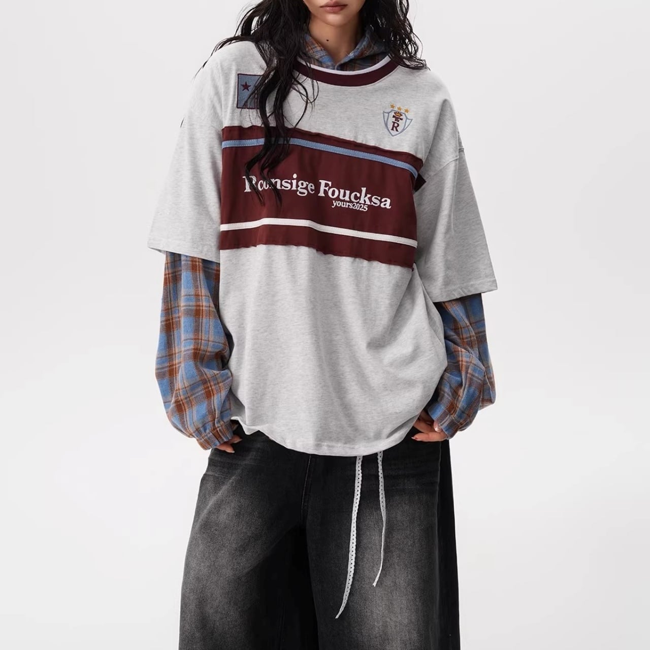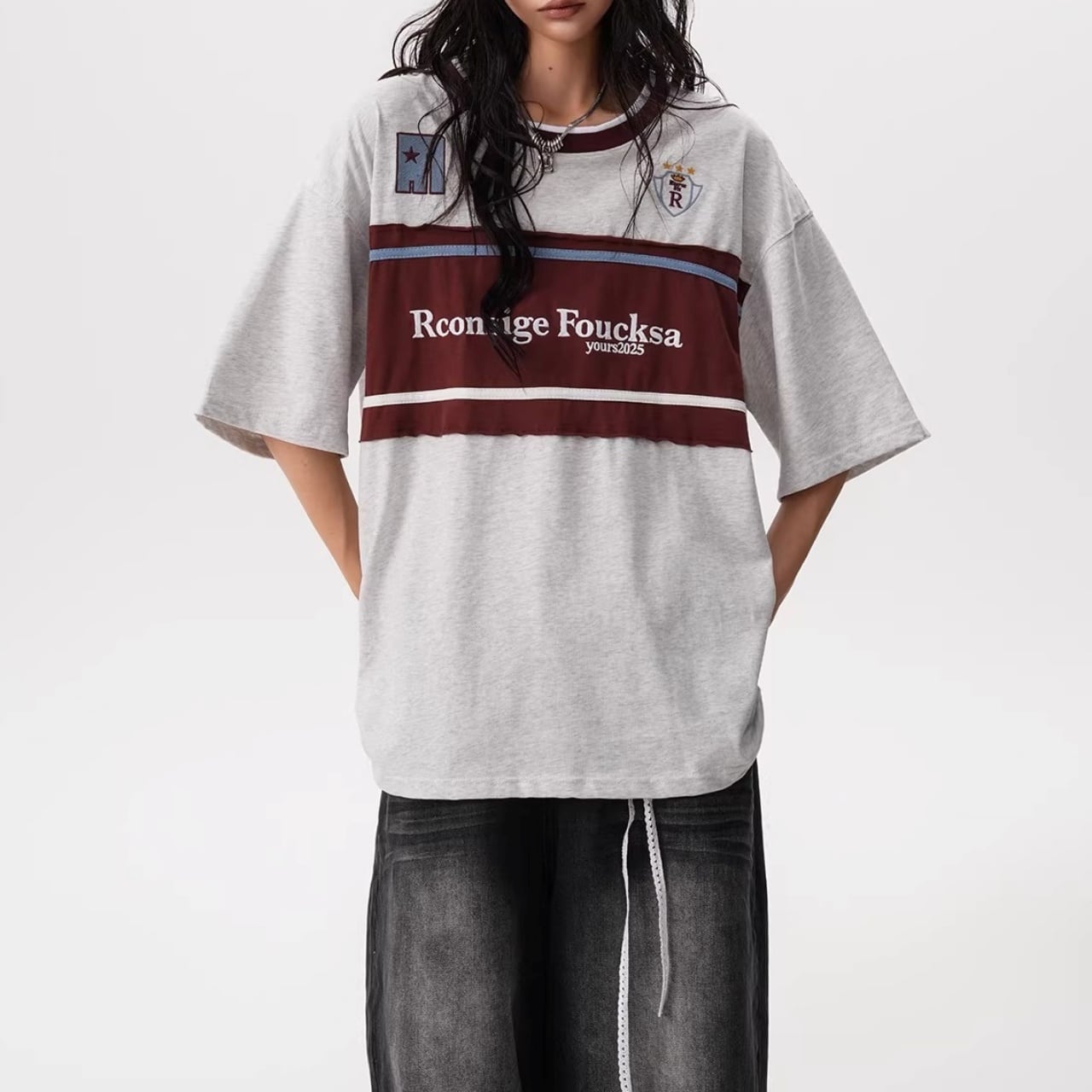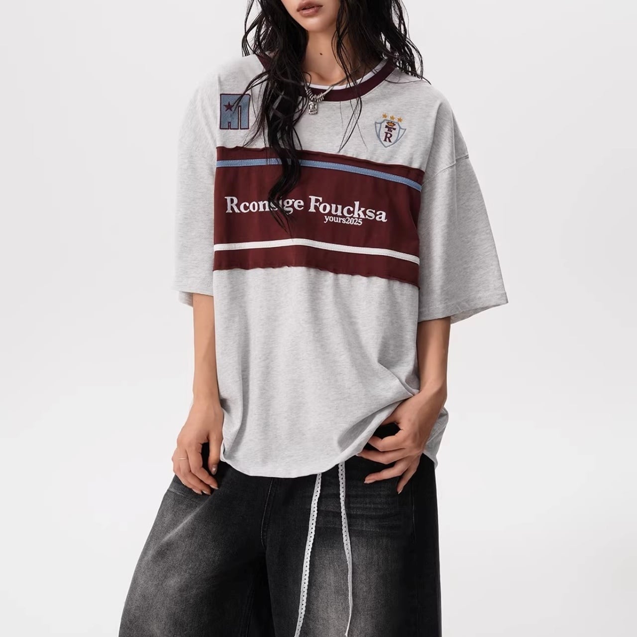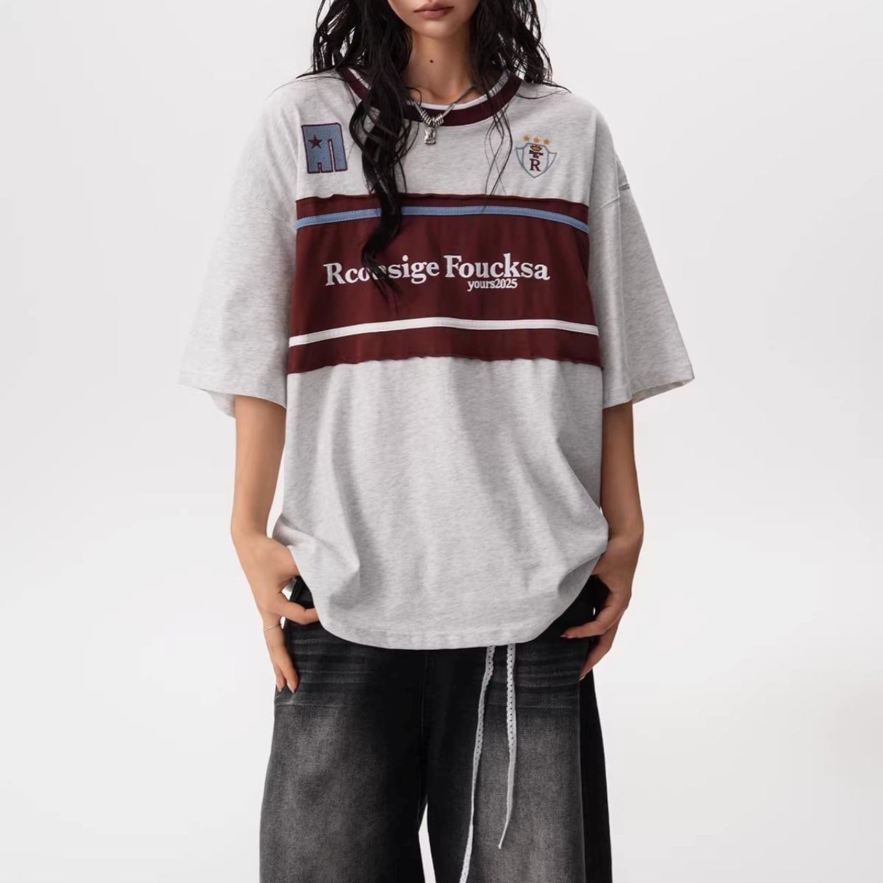 フロントの大胆な切り替えデザインと胸元のモチーフが目を引く、ストリート感溢れる1着。