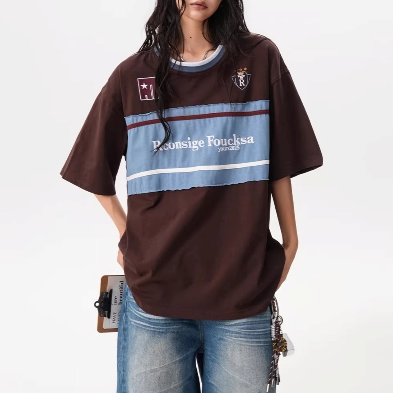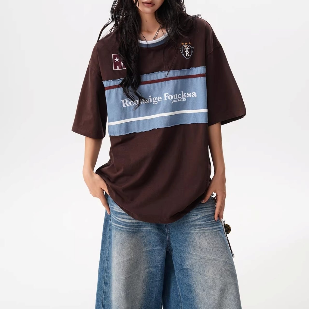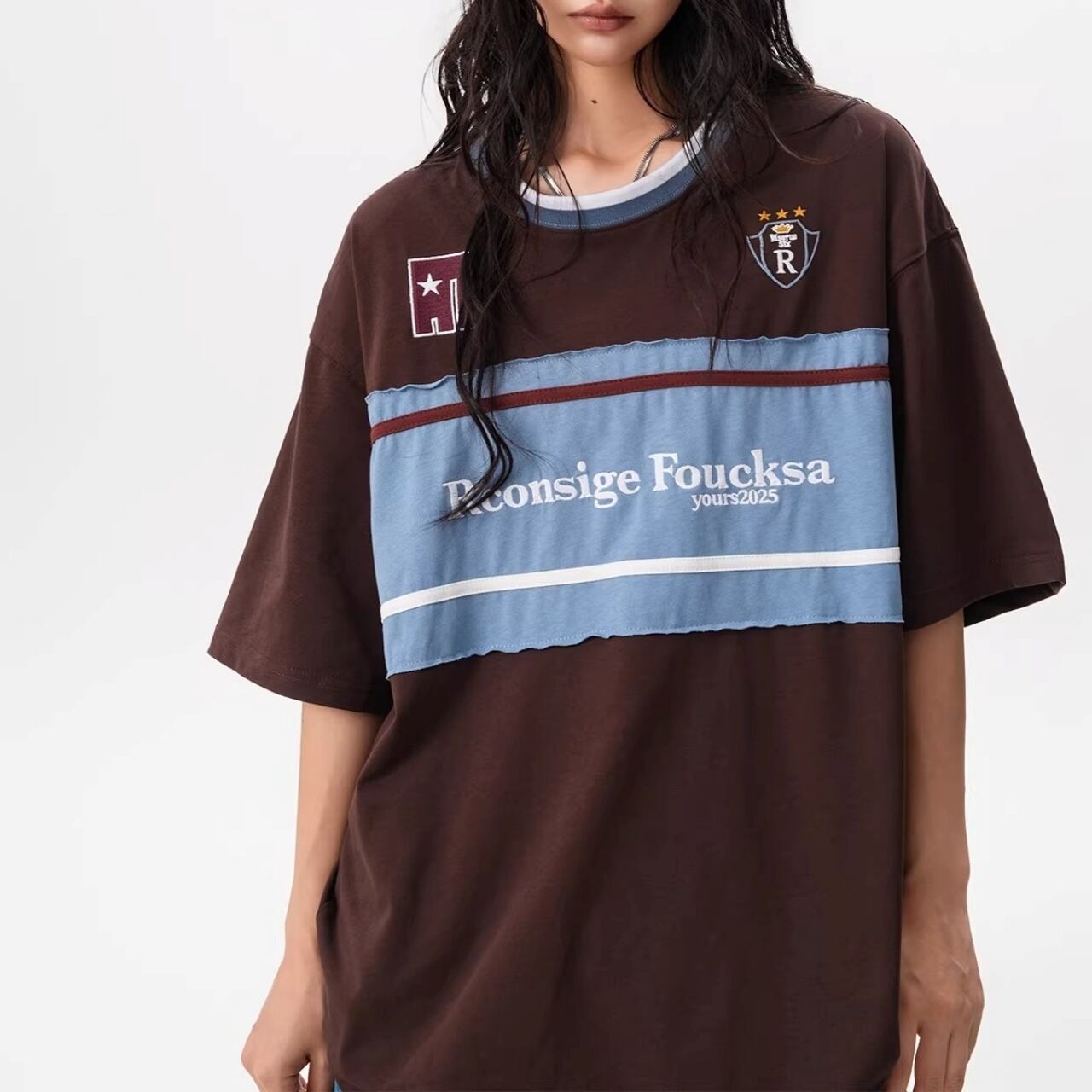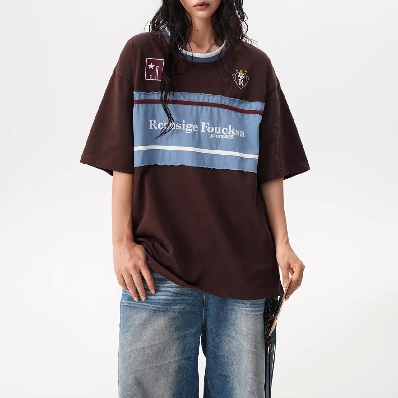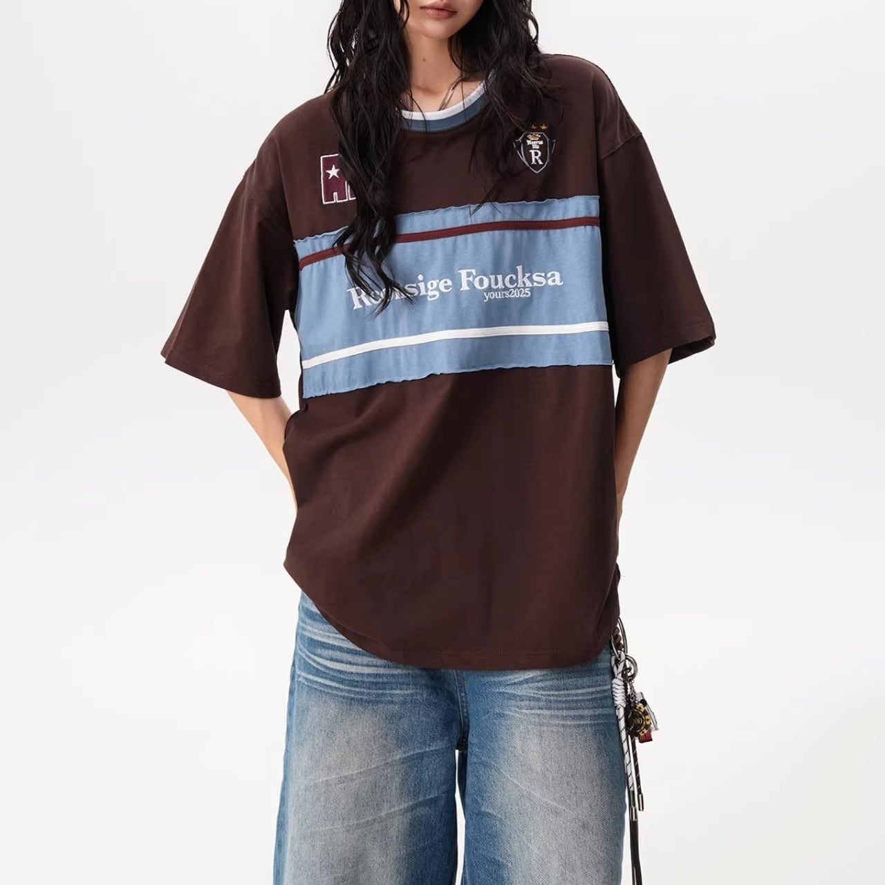 フロントの大胆な切り替えデザインと胸元のモチーフが目を引く、ストリート感溢れる1着。