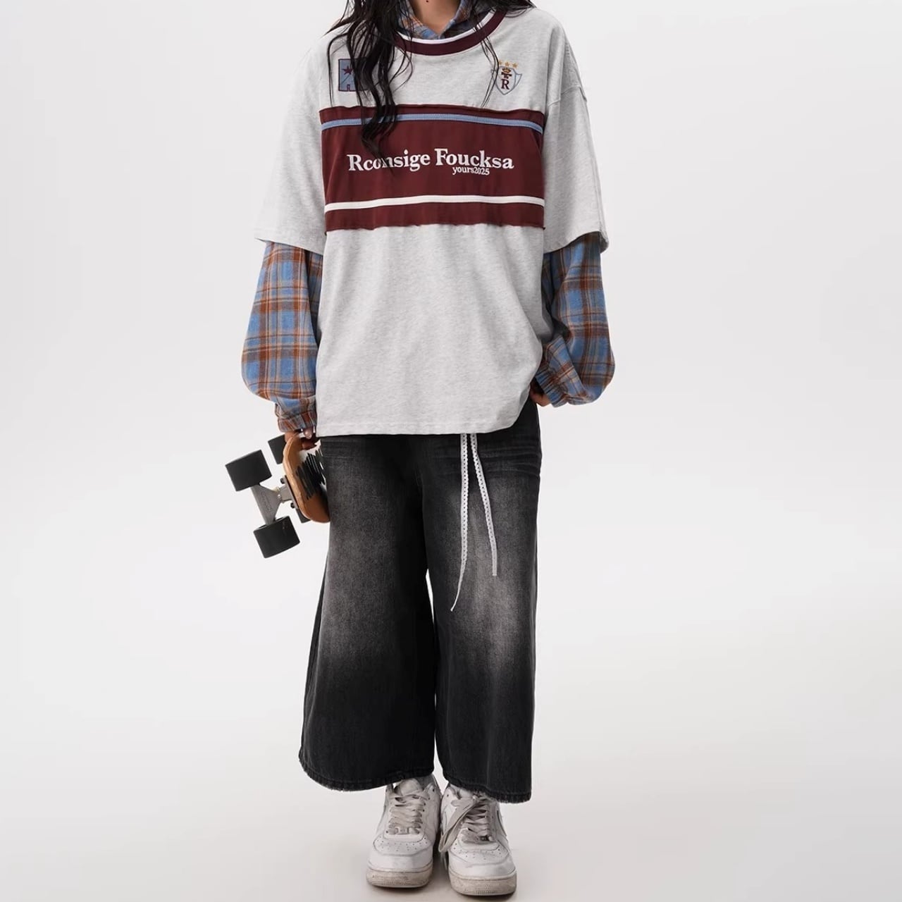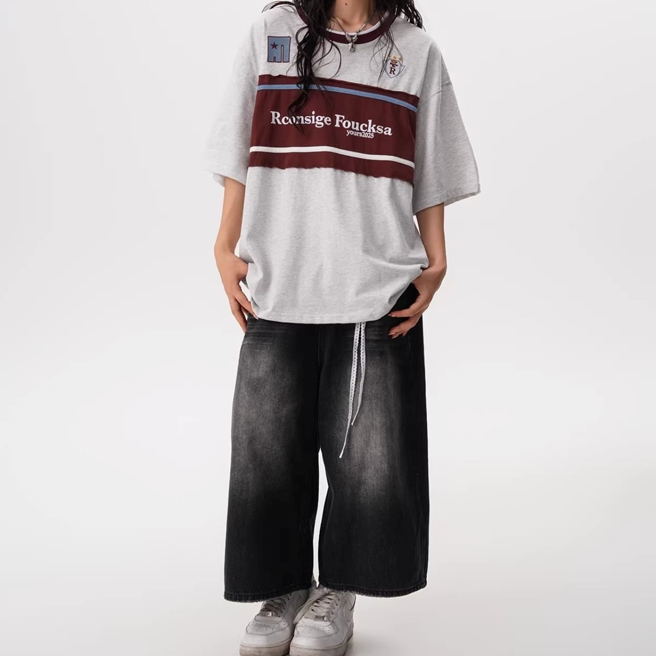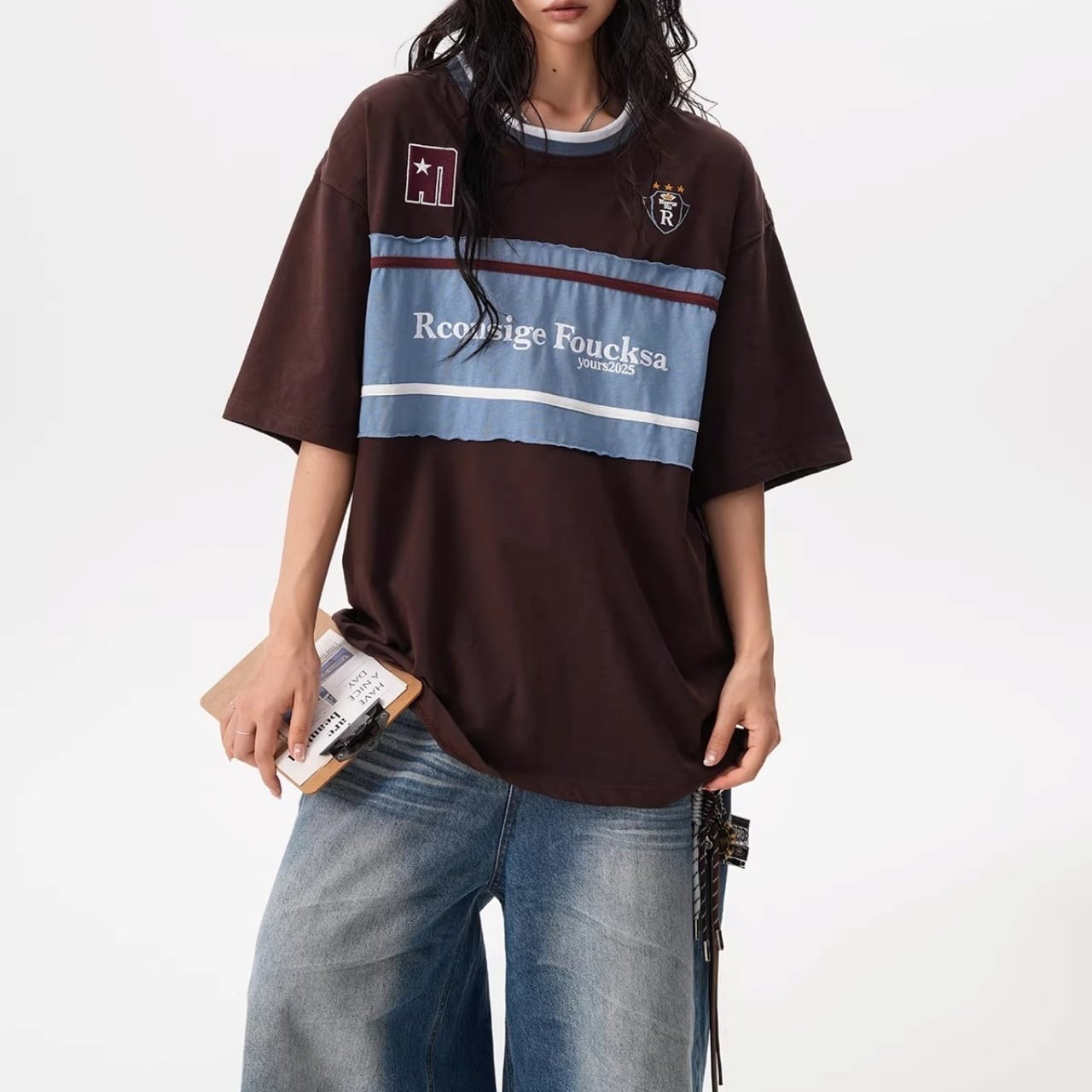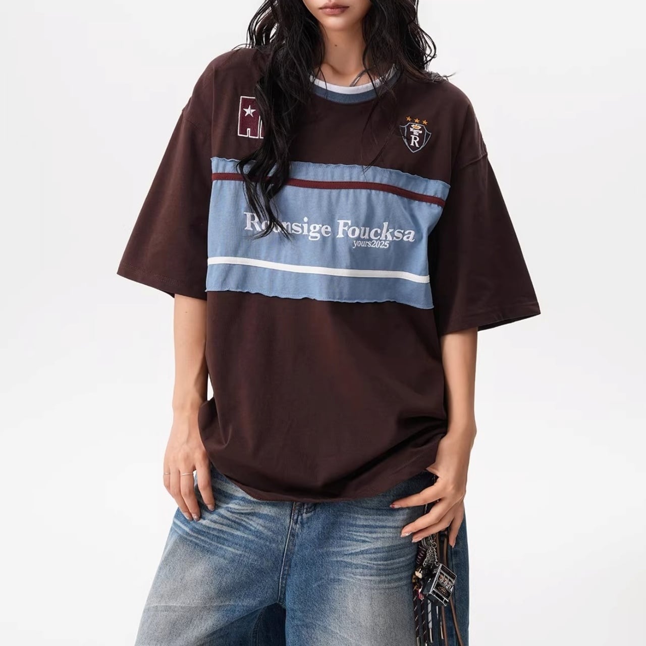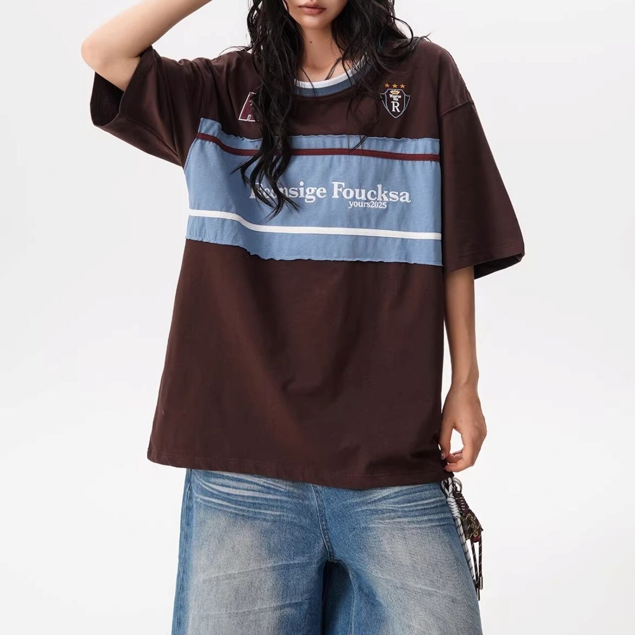 フロントの大胆な切り替えデザインと胸元のモチーフが目を引く、ストリート感溢れる1着。