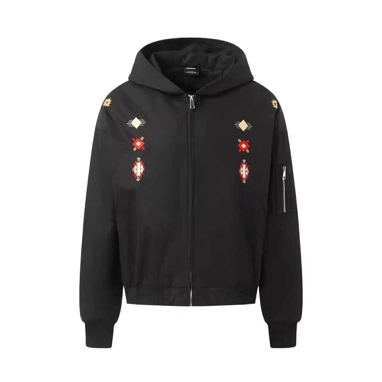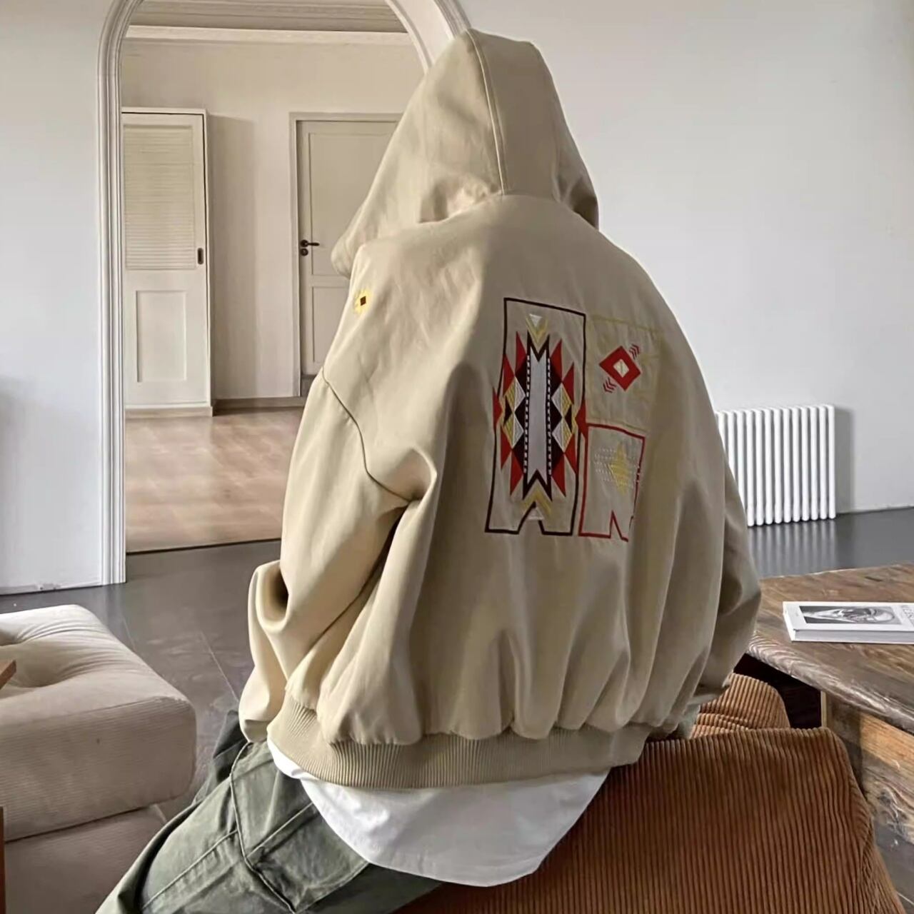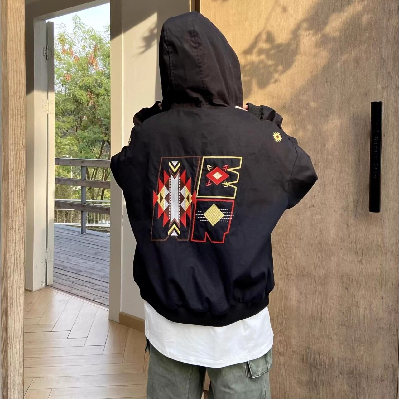 エスニックテイストのアートモチーフが目を引く、ストリート感溢れるフーディージャケット。