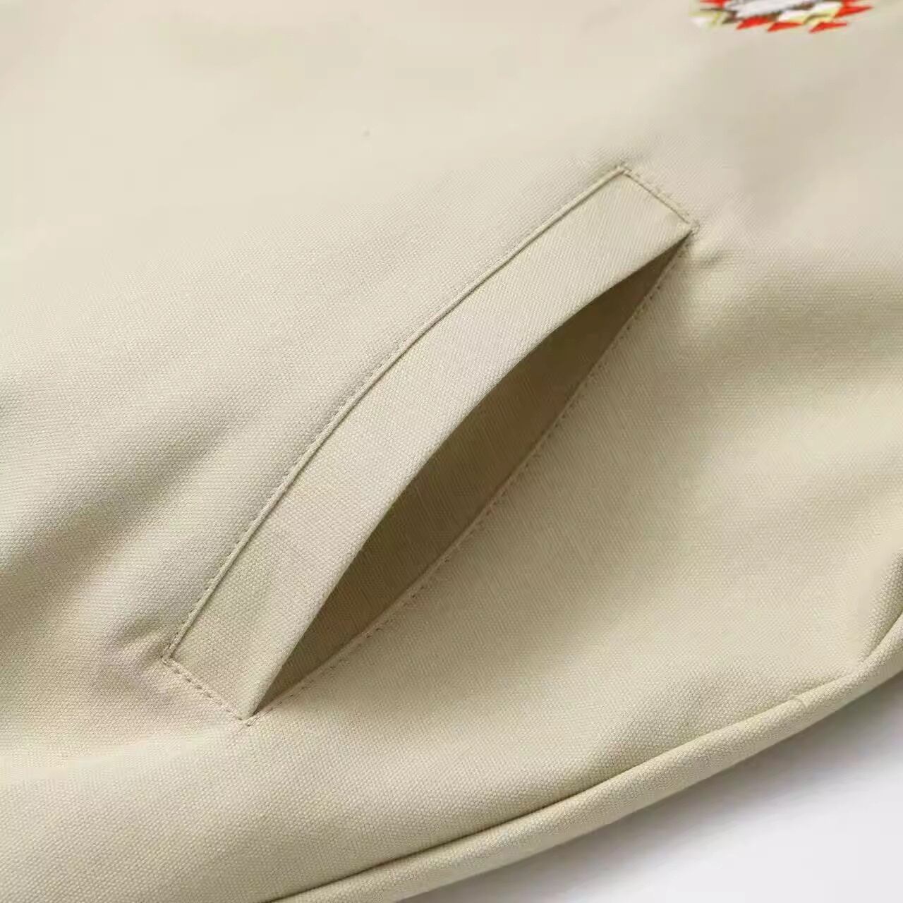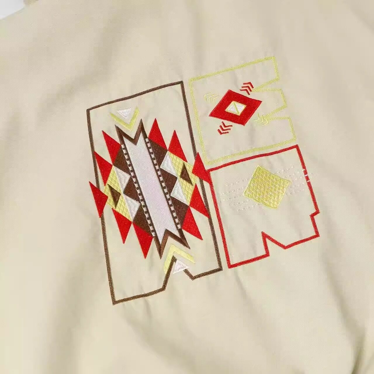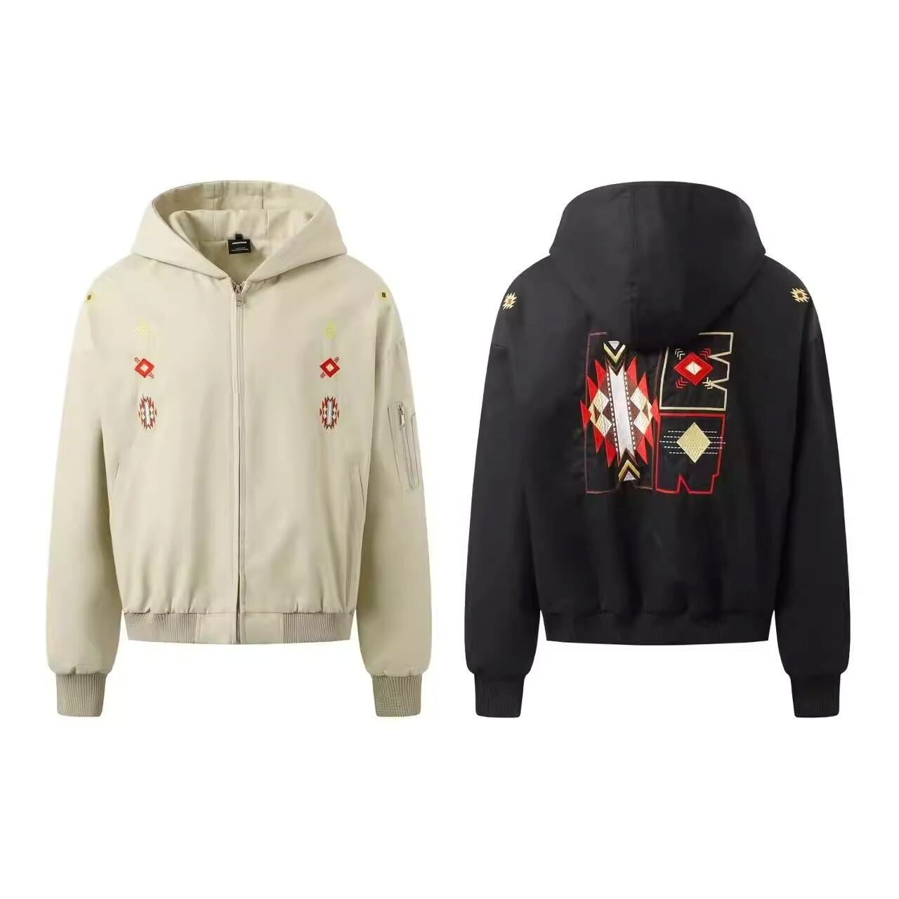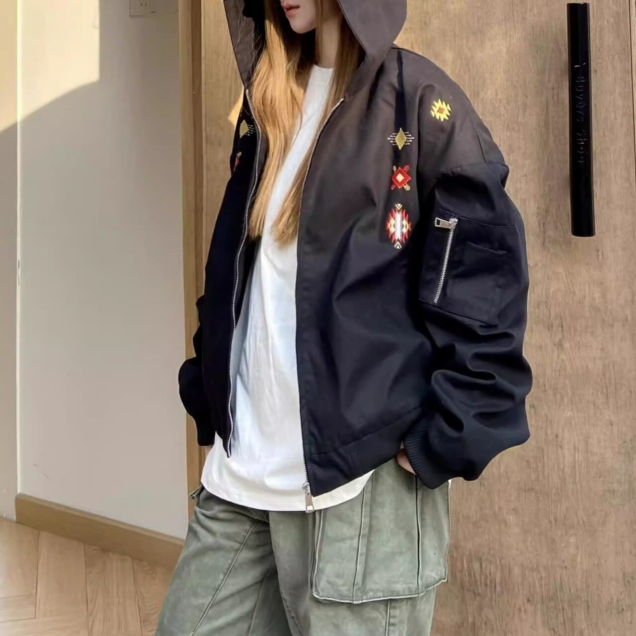 エスニックテイストのアートモチーフが目を引く、ストリート感溢れるフーディージャケット。