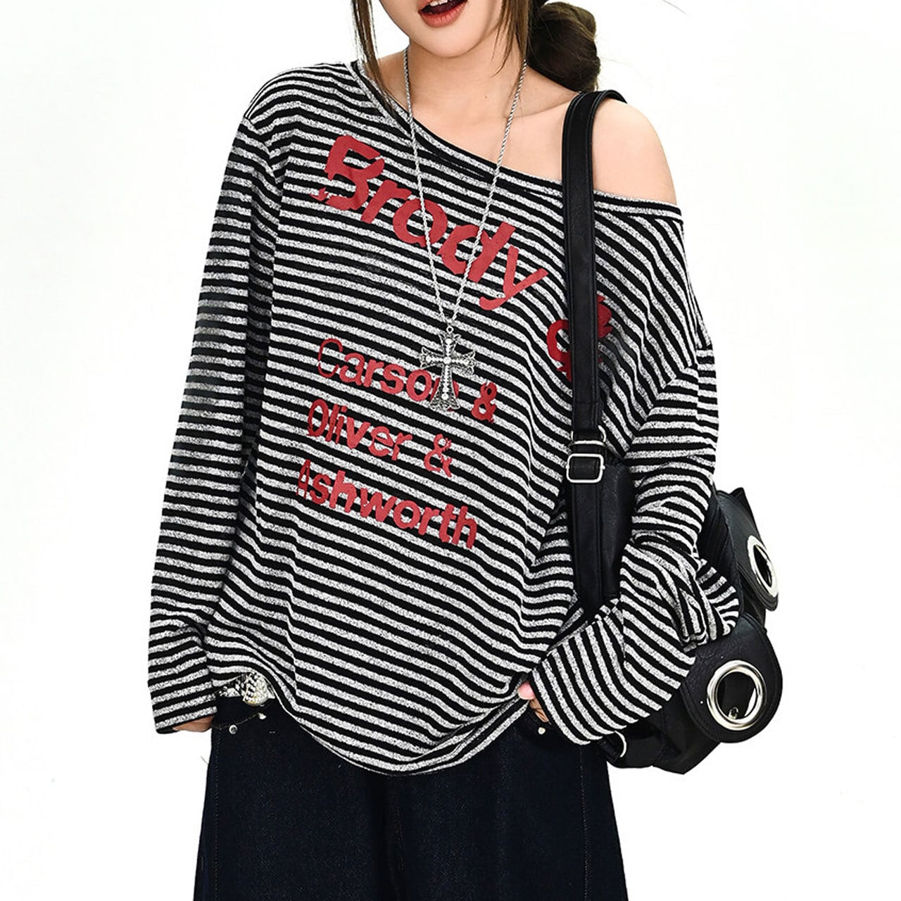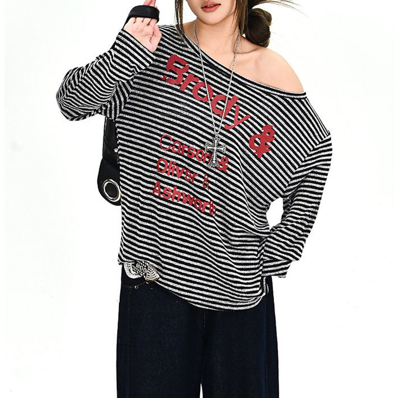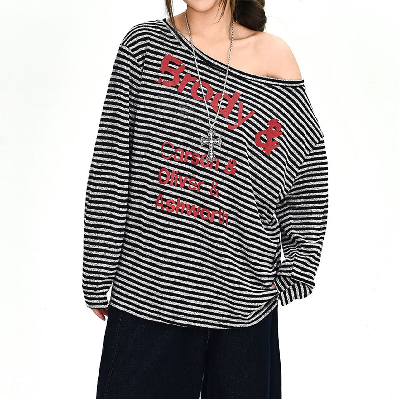 ボーダーパターンレタリンググラフィックドレープネックロングスリーブTシャツ 1col R02001