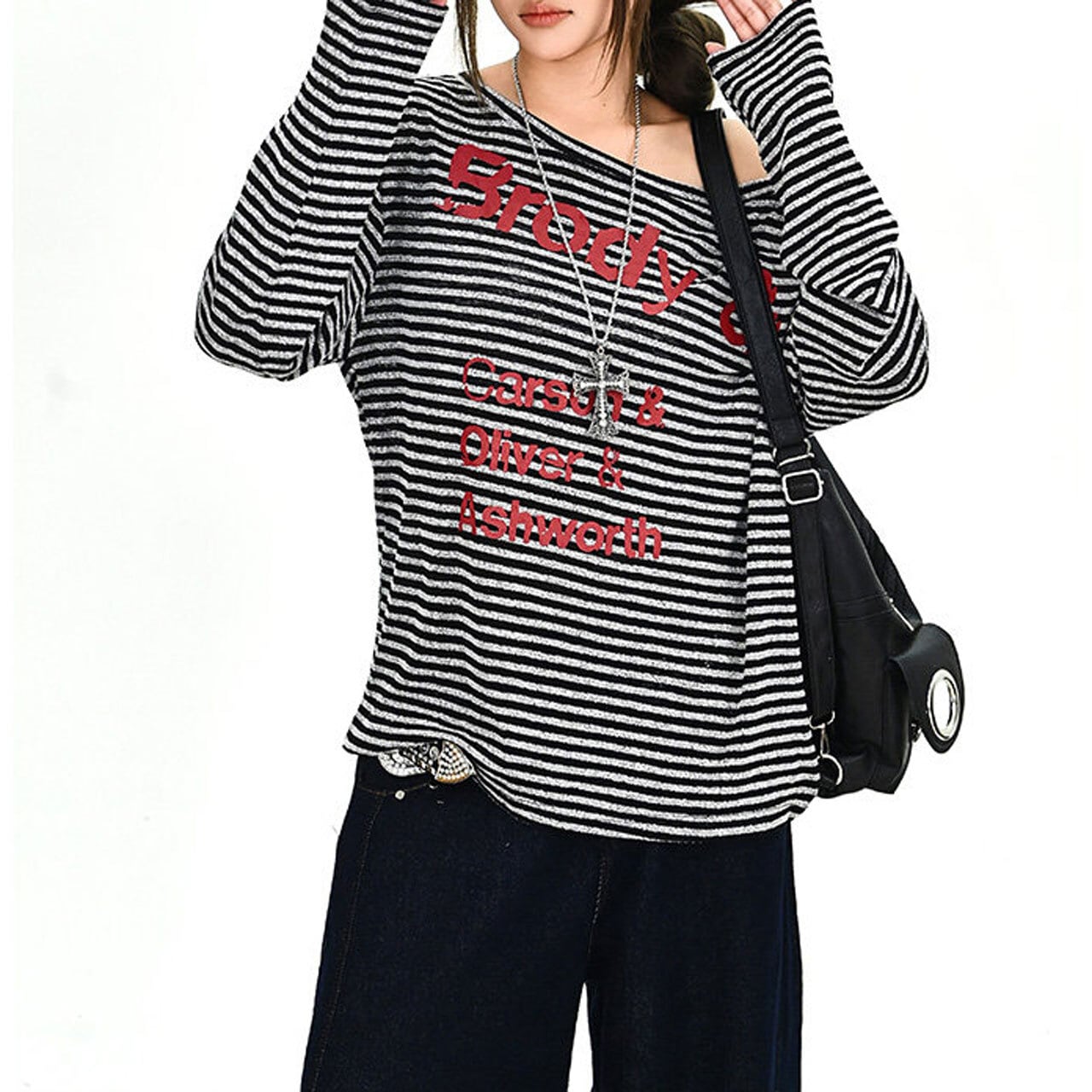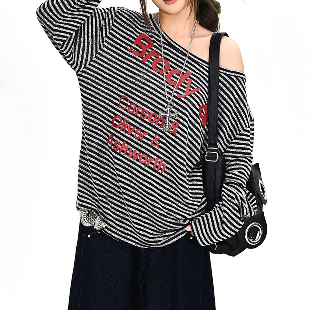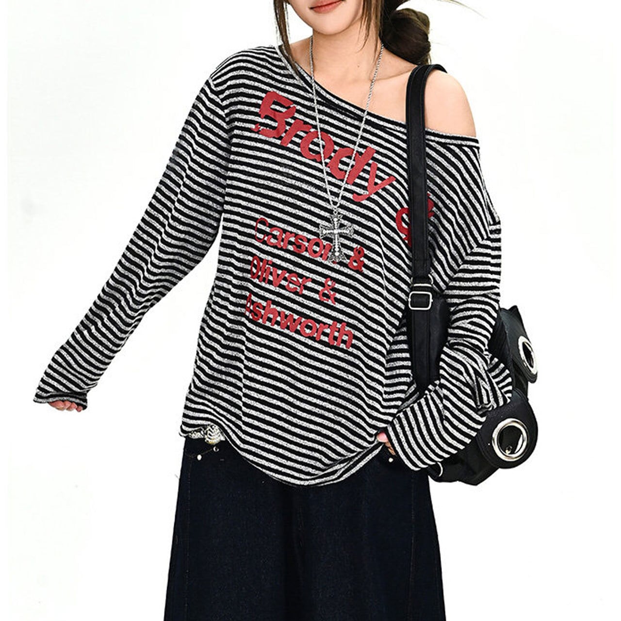 ボーダーパターンレタリンググラフィックドレープネックロングスリーブTシャツ 1col R02001