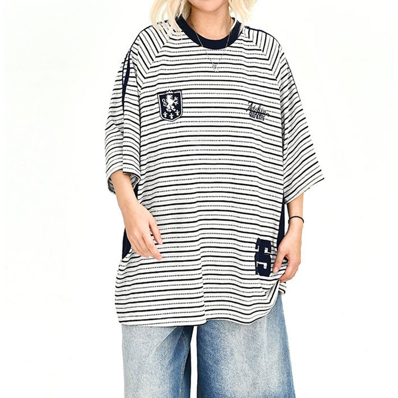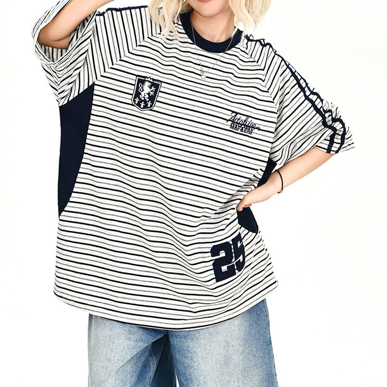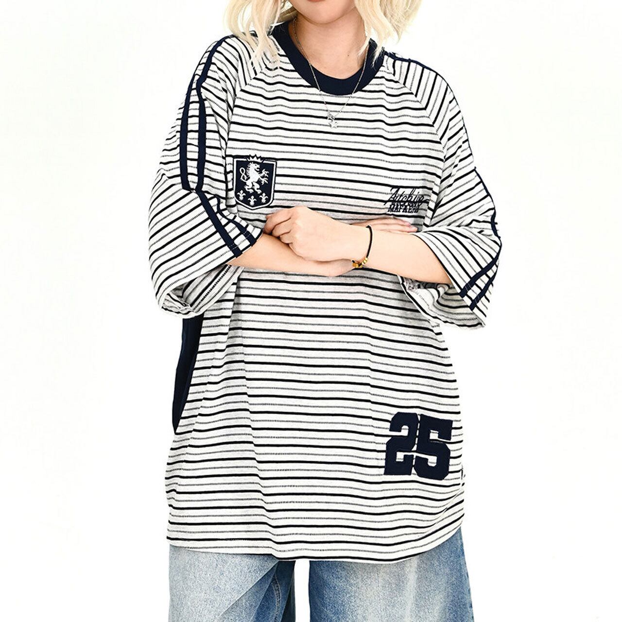 クラシックなボーダーをベースに、エンブレム風のモチーフが個性を放つ主役級のデザイン。