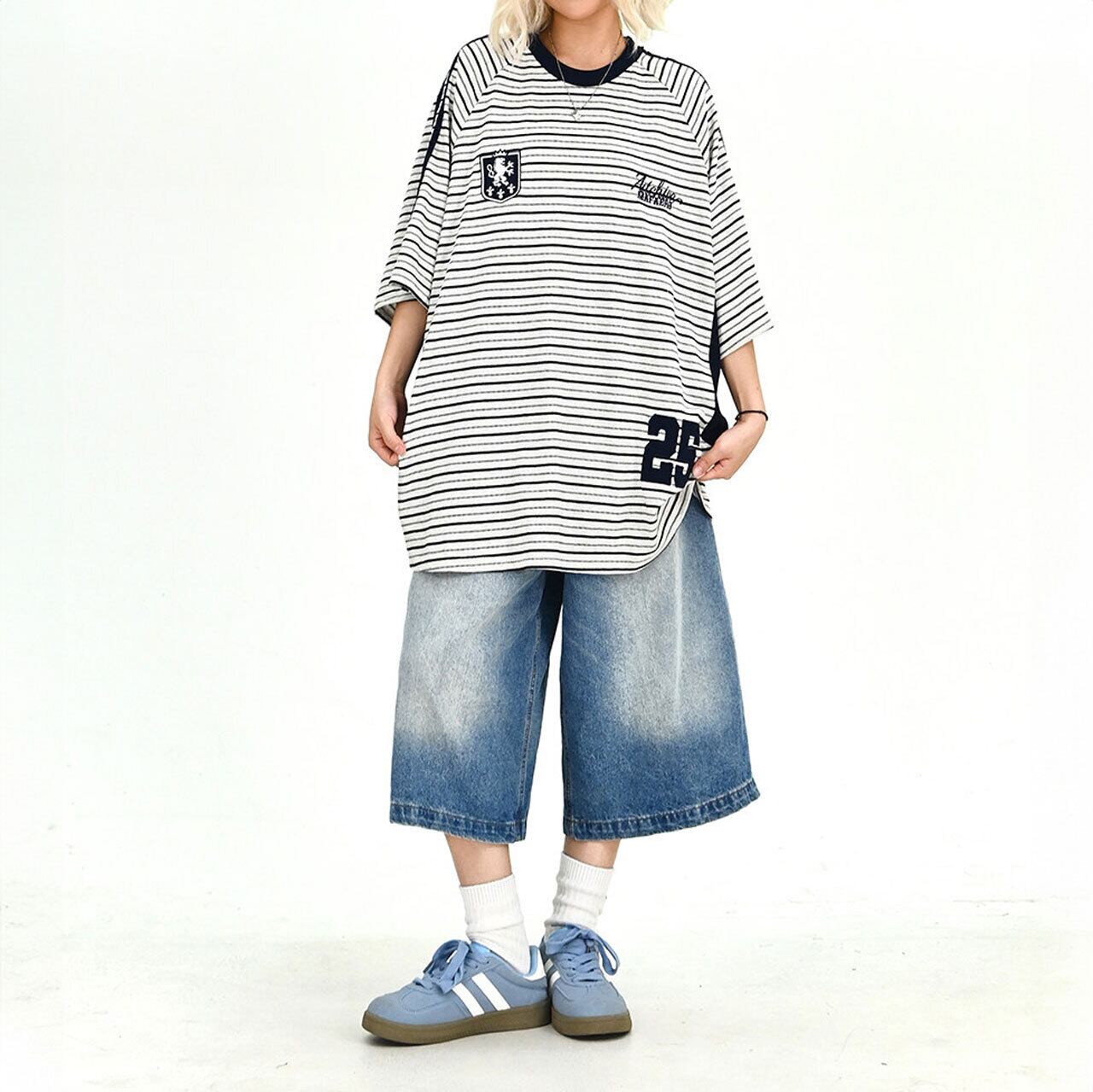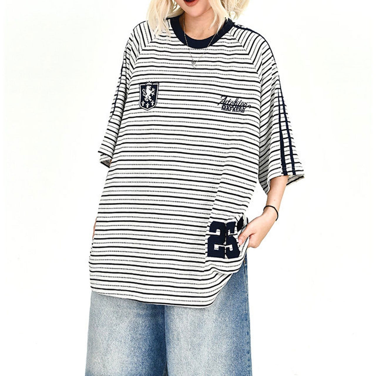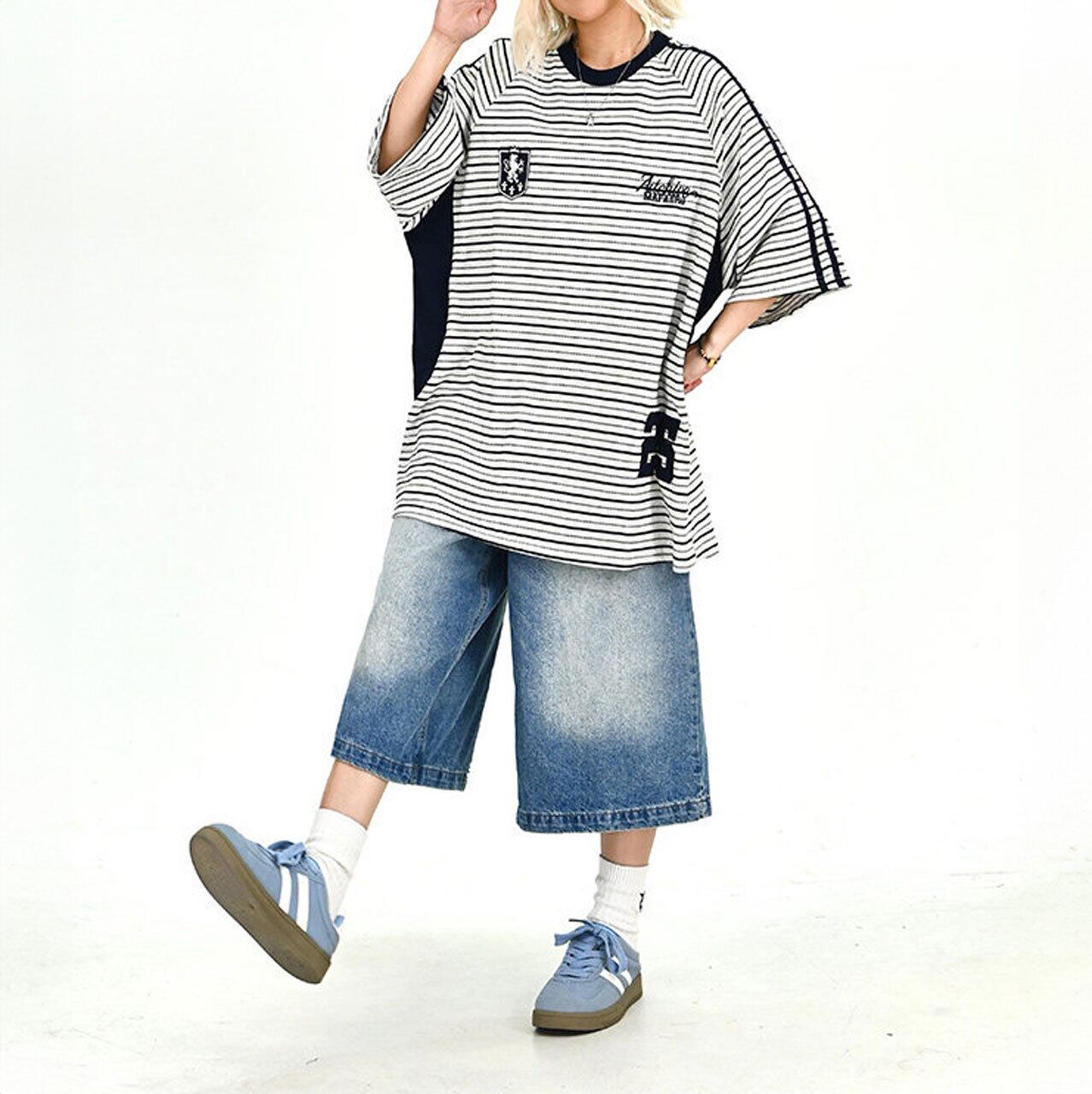 クラシックなボーダーをベースに、エンブレム風のモチーフが個性を放つ主役級のデザイン。