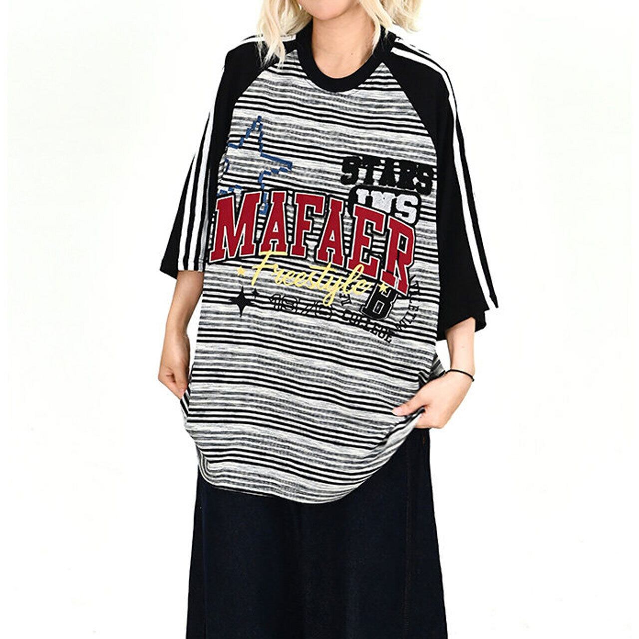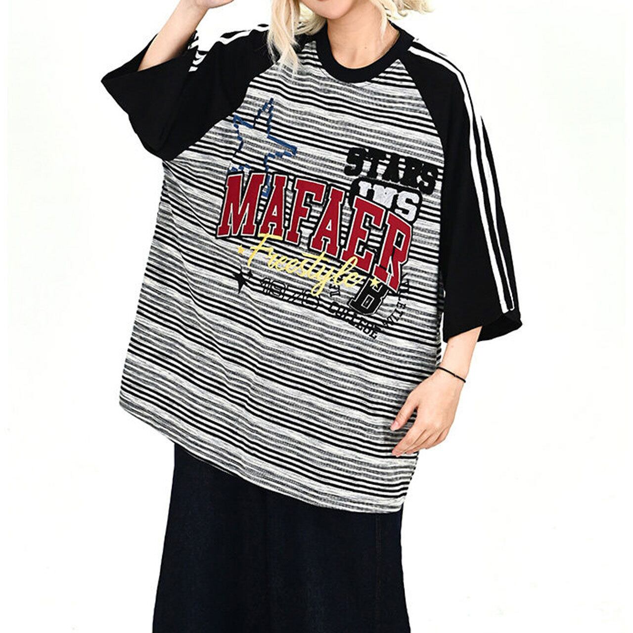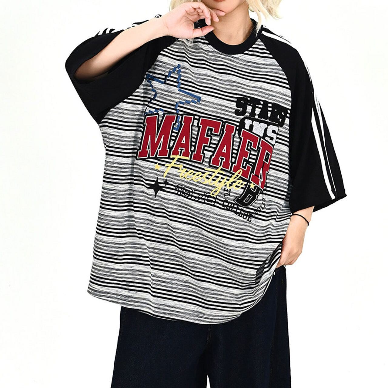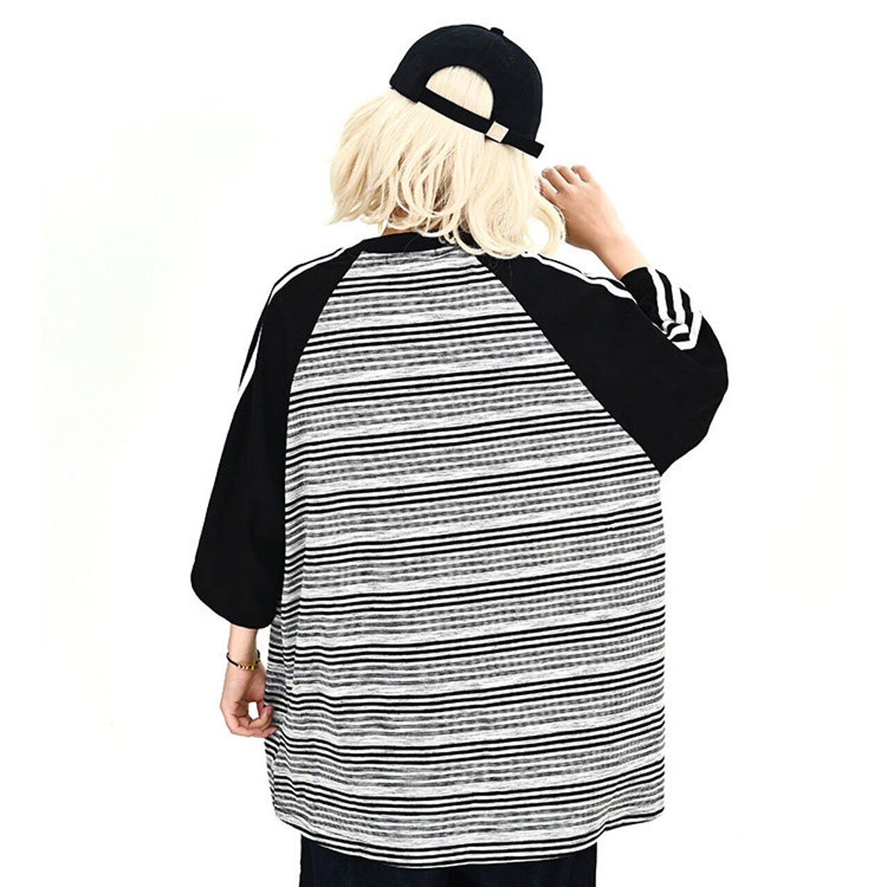 ボーダー柄のボディに配色のラグランスリーブを組み合わせた、ストリート感溢れるオーバーシルエットTシャツ。