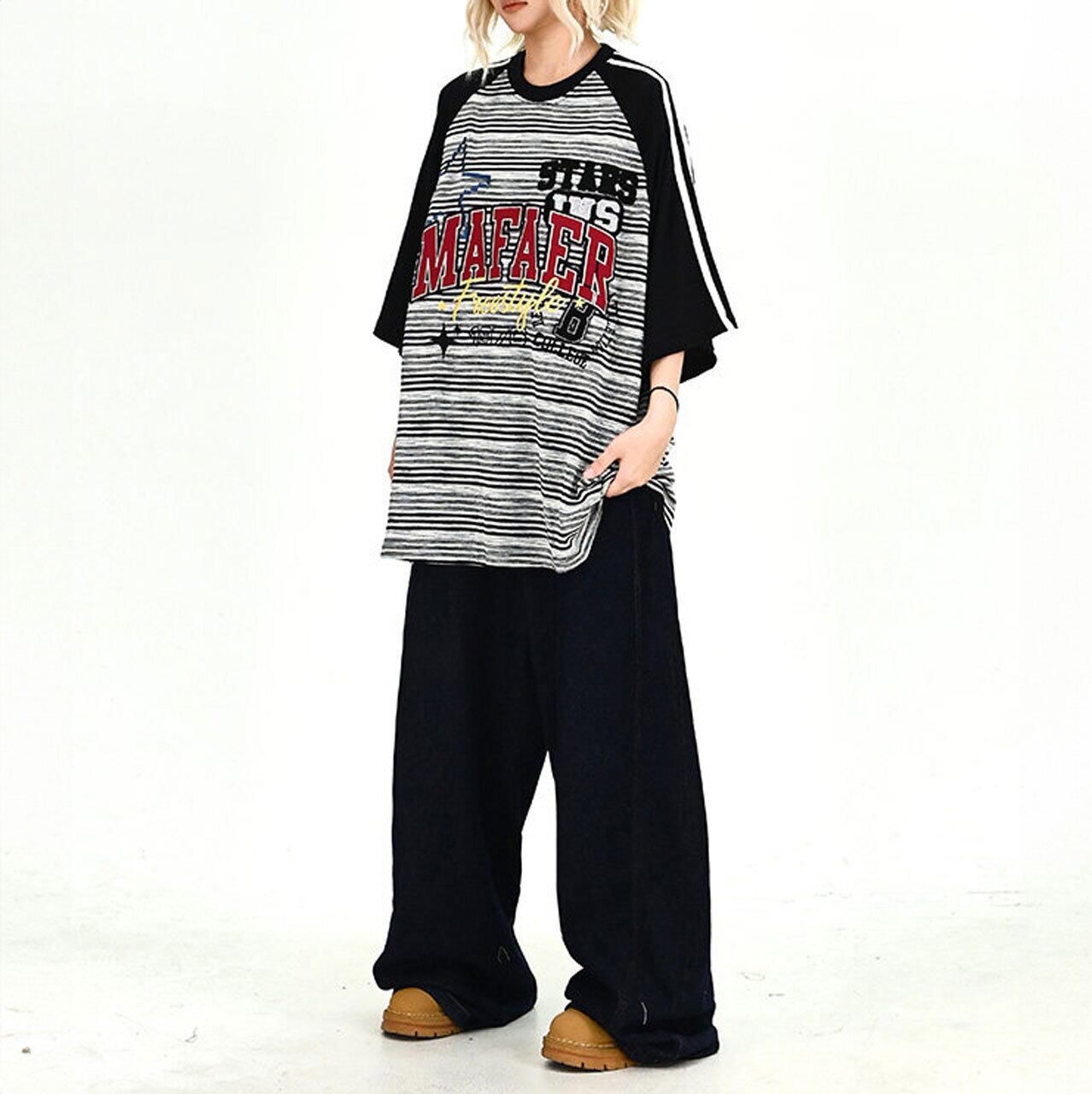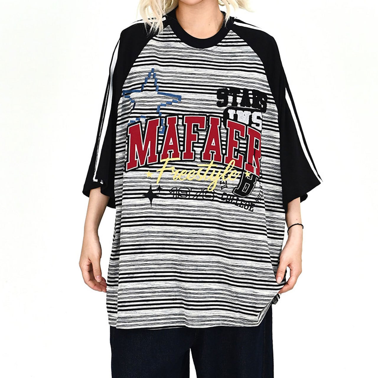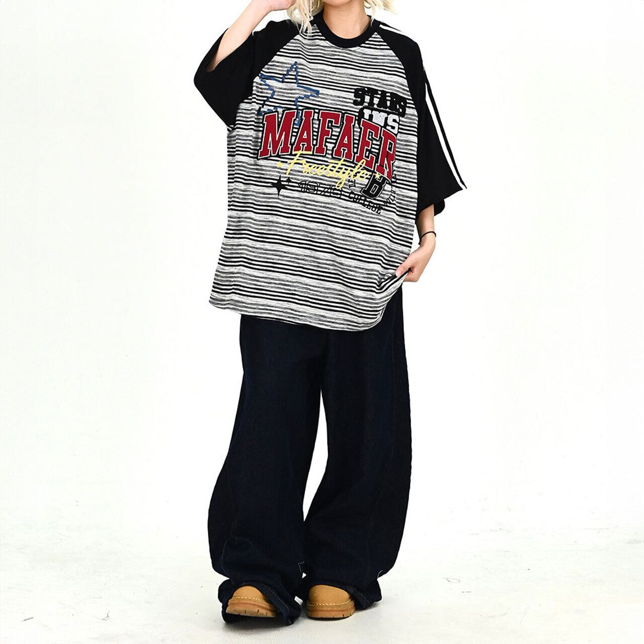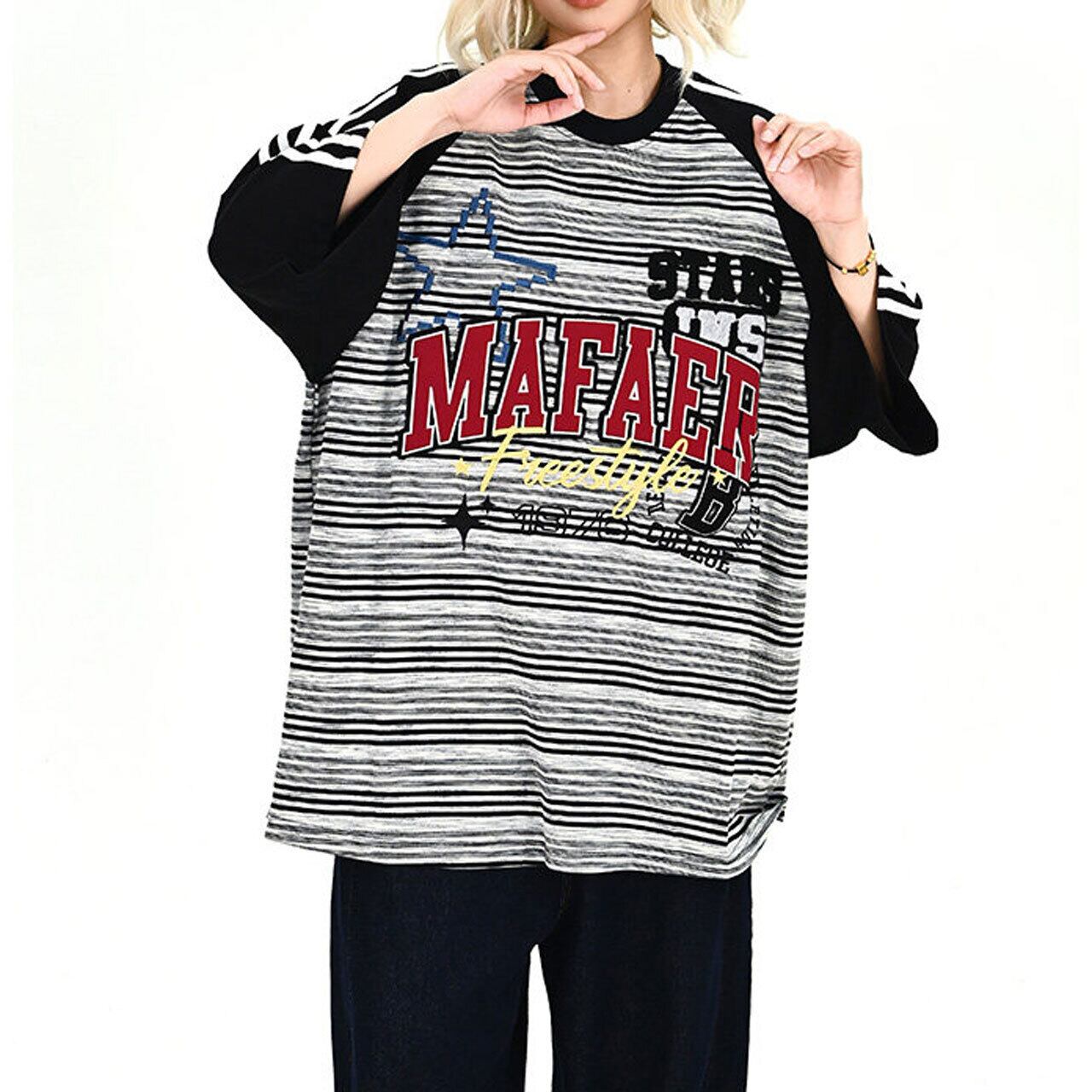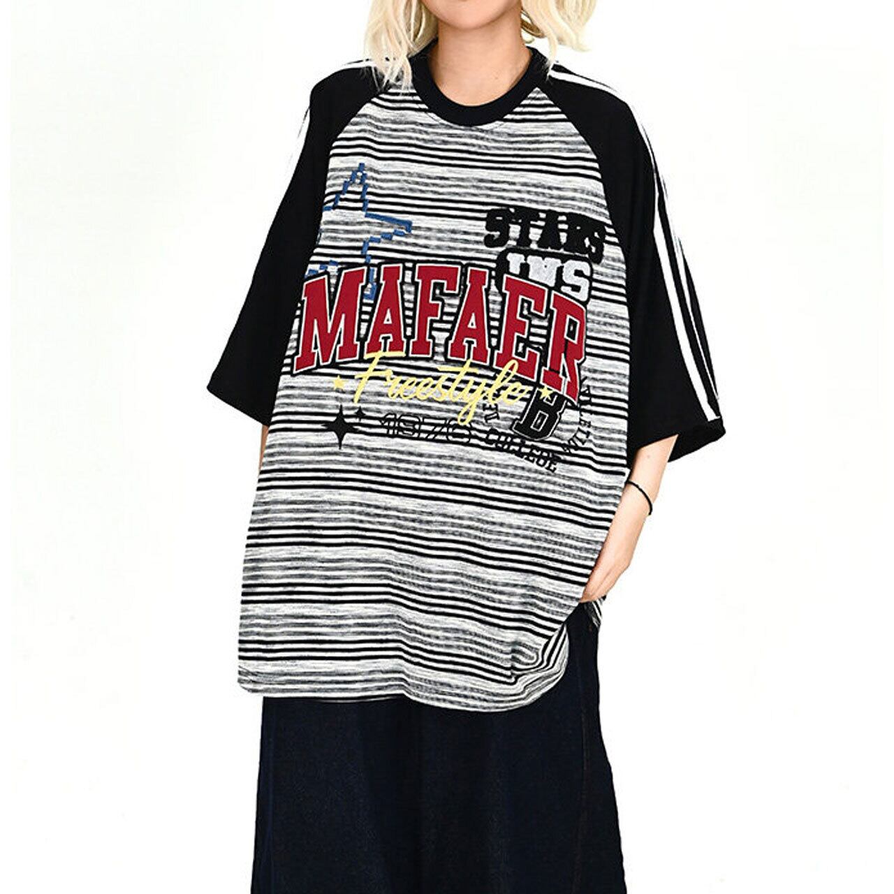 ボーダー柄のボディに配色のラグランスリーブを組み合わせた、ストリート感溢れるオーバーシルエットTシャツ。