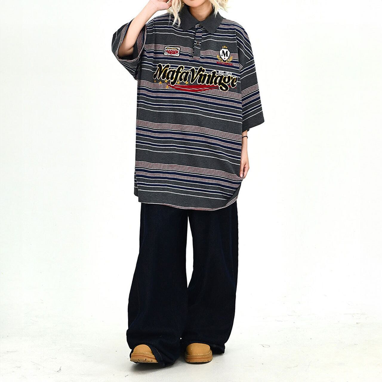 プレッピーな印象のポロカラーに、存在感のあるエンブレムディテールをプラスした遊び心のあるデザイン。