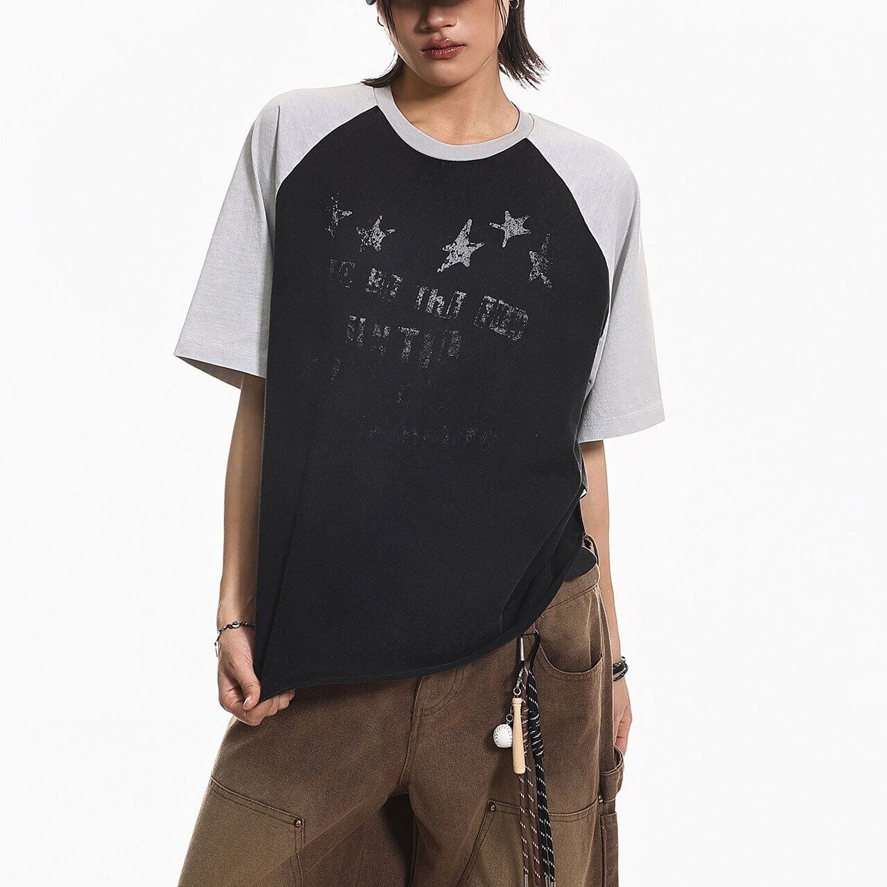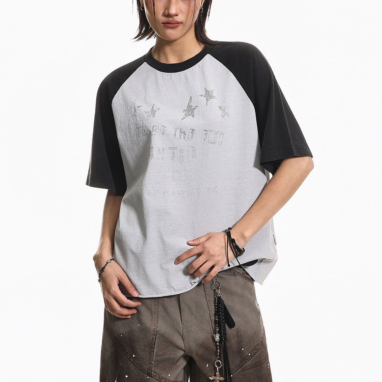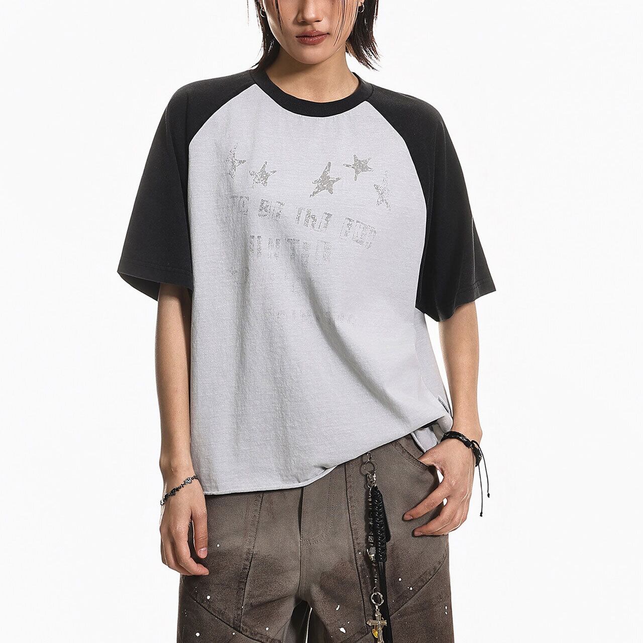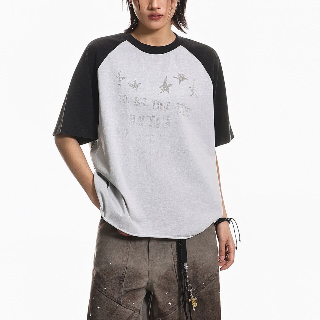バイカラーの切り替えが目を引くラグランスリーブに、星のモチーフを散りばめたキャッチーな1枚。